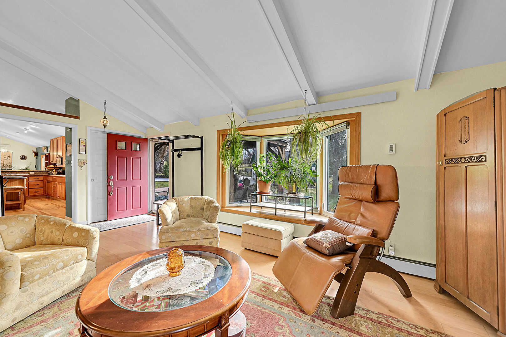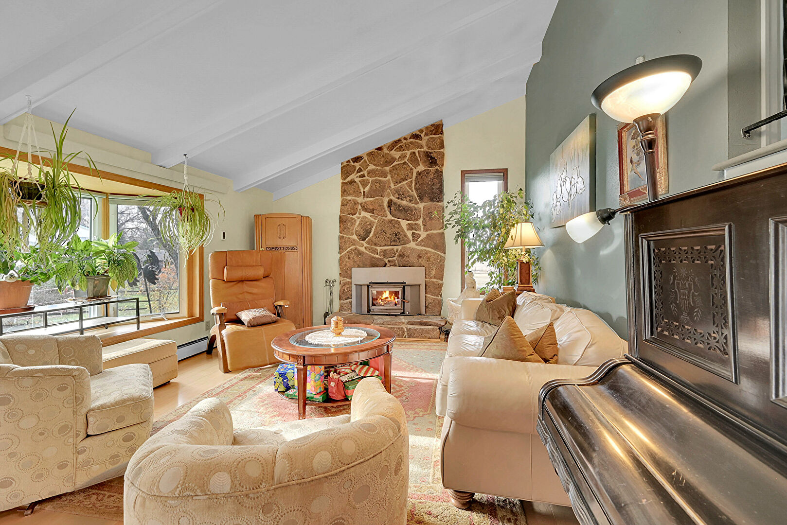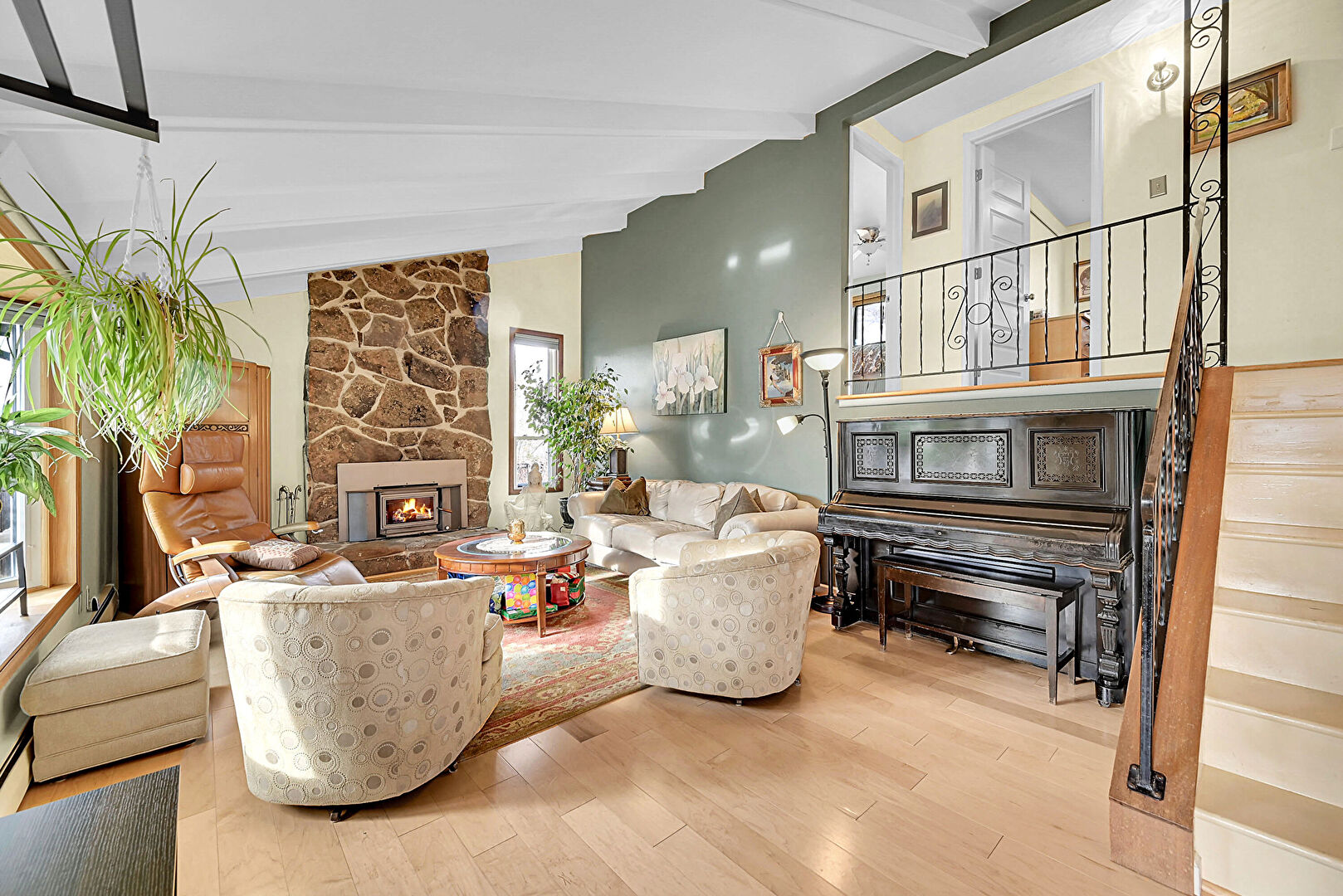 Baseboard Radiator, Beamed Ceiling, Cathedral Ceiling, Ceiling Fan, Drywall, Fireplace, High Ceiling, Natural Light, Notable Chandelier, Office Area, Recessed Lighting, Stairs, Vaulted Ceiling, Wood Finish Floor, Beamed Ceiling, Drywall, Fireplace, Recessed Lighting, Vaulted Ceiling, Wood Finish Floor