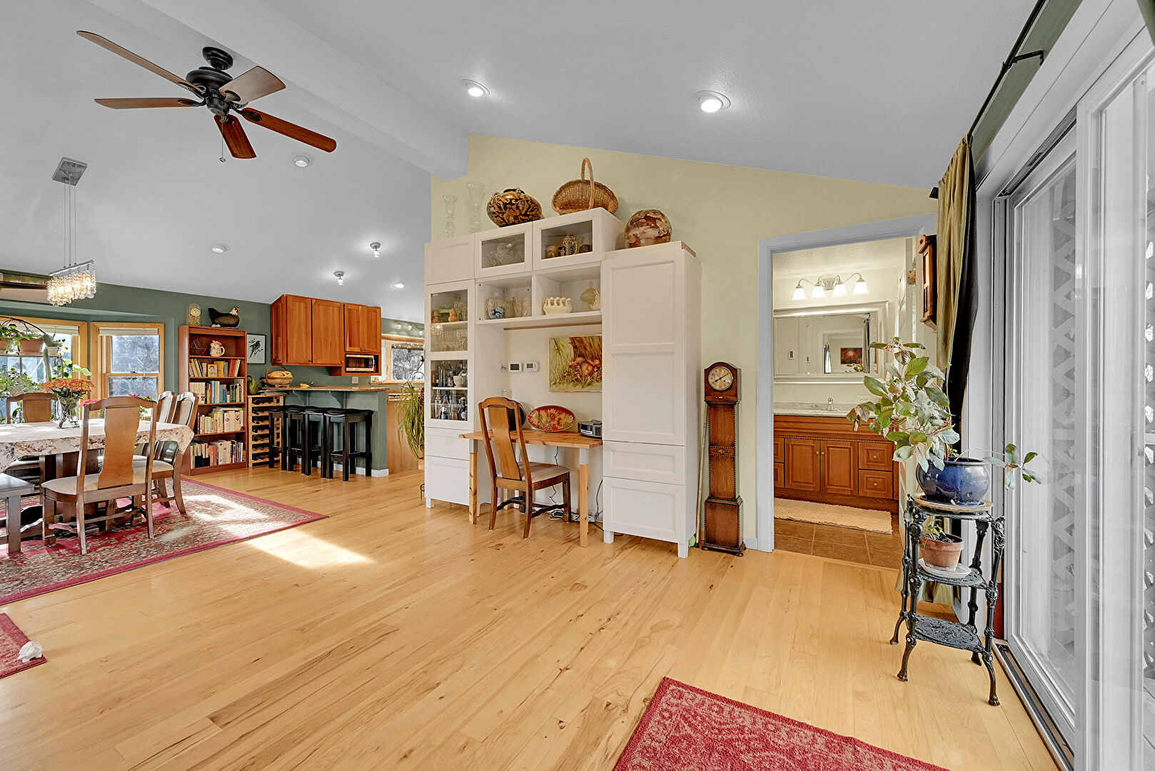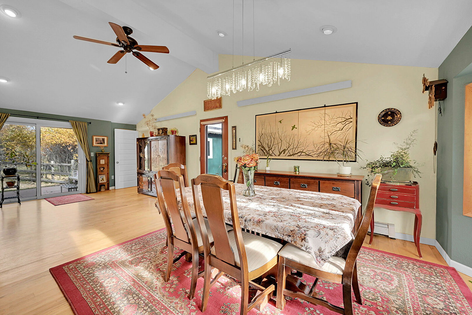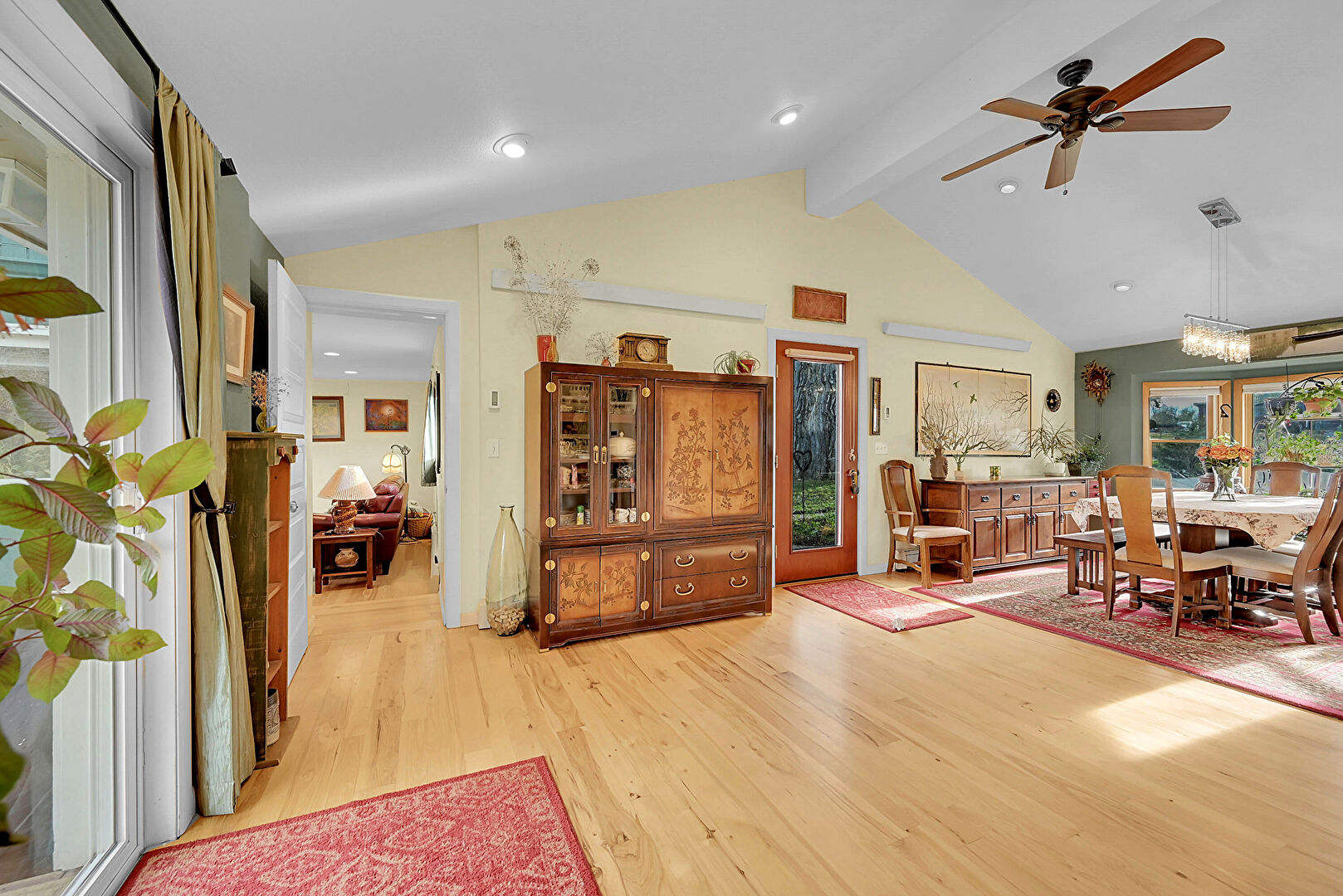 Baseboard Radiator, Baseboards Wall, Beamed Ceiling, Cathedral Ceiling, Ceiling Fan, Drywall, High Ceiling, Natural Light, Recessed Lighting, Track Lighting, Vaulted Ceiling, Wood Finish Floor, Drywall, Natural Light, Notable Chandelier, Recessed Lighting