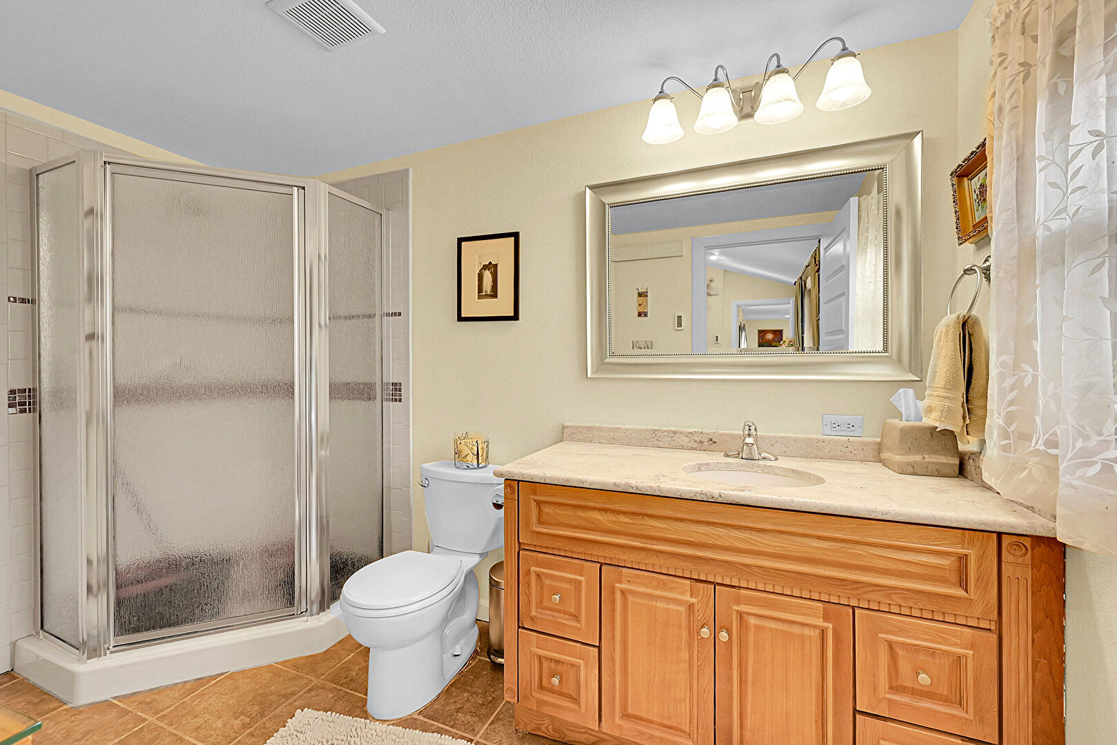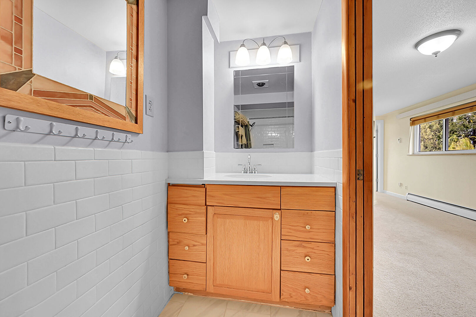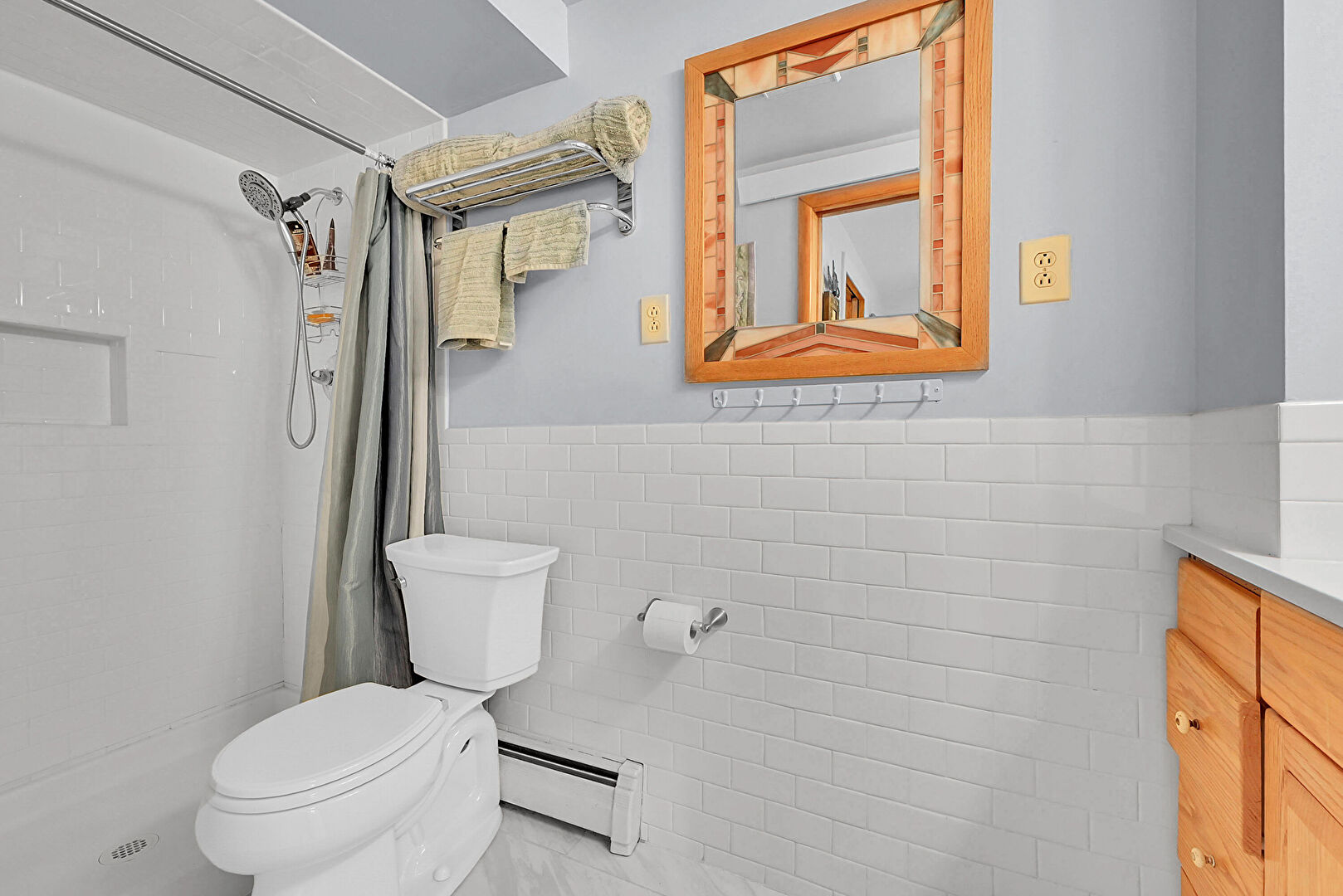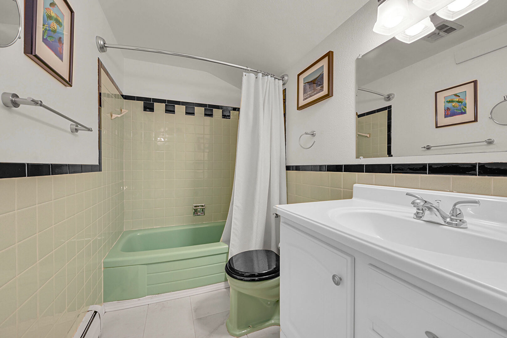 Baseboard Radiator, Carpet, Drywall, Full Bathroom, Natural Light, Tile Floor, Tile Wall, Vanity, Vent, Wainscot Wall, Combined Bath Shower, Vanity, Vent, Wainscot Wall