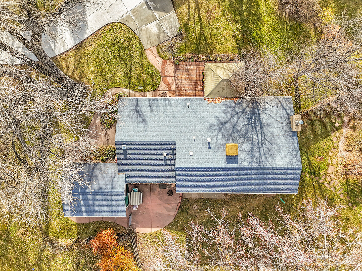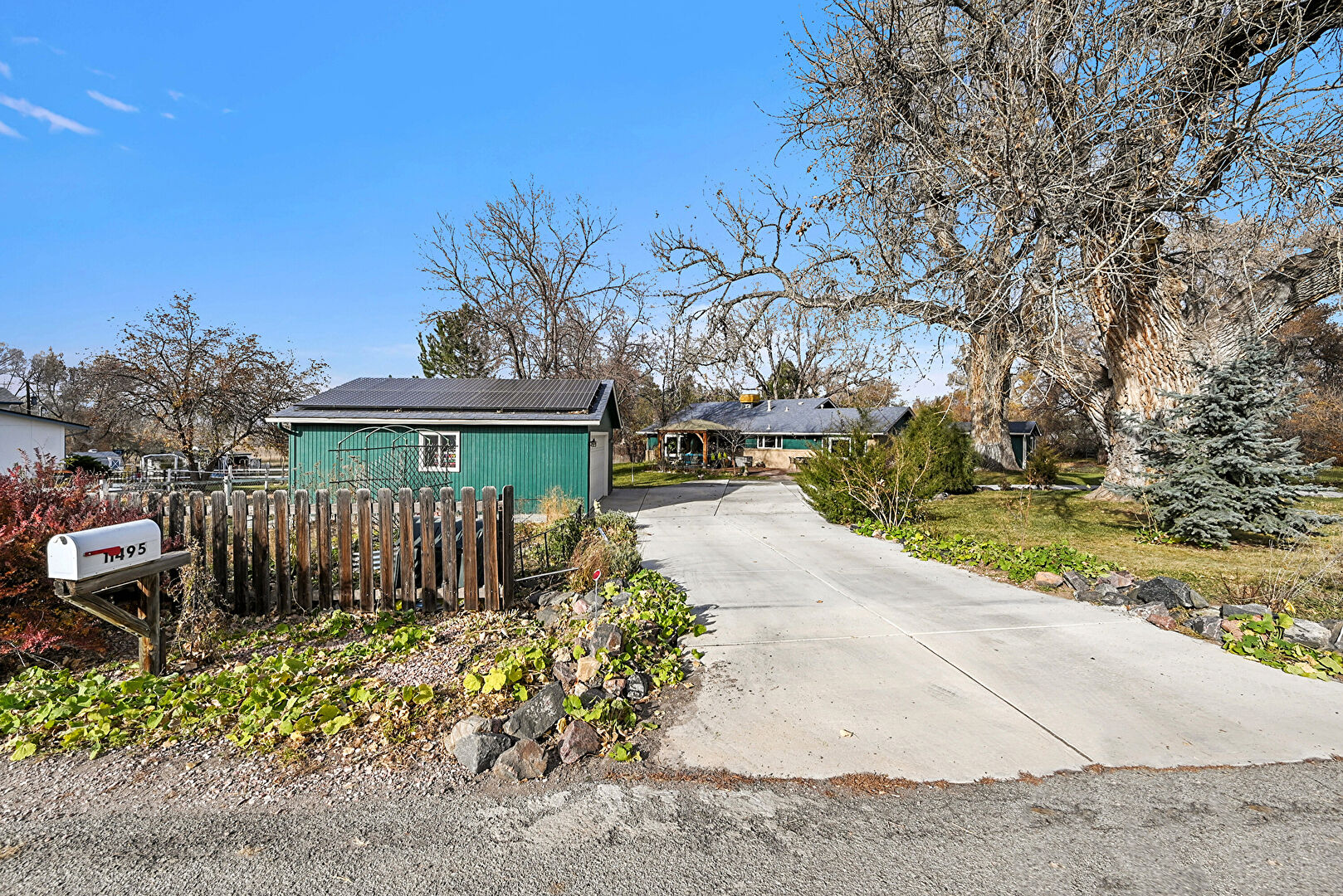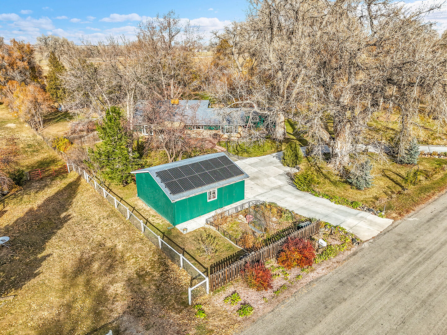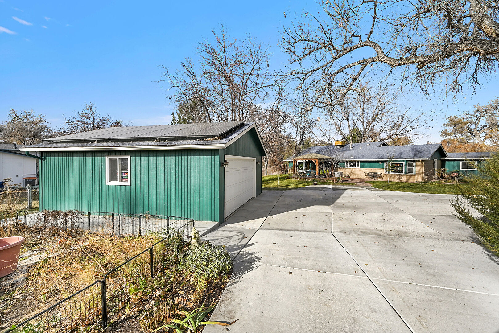 Brick Siding, Central Ac, Chimney, Concrete Foundation, Deck, Detached Garage, Downspout, Driveway, Fence, Gas Meter, Gazebo, Gutters, Lawn, Outdoor Living Space, Outdoor Structure, Parking Pad, Patio, Shingle Roof, Solar Panels, Vertical Siding, Woods View, Downspout, Driveway, Fence, Gate, Gazebo, Gutters, Vertical Siding