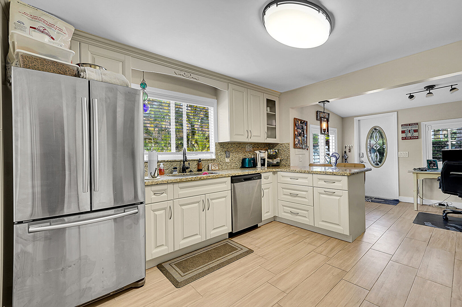 Baseboards Wall, Beamed Ceiling, Crown Molding Cabinets, Drywall, Glass Insert Cabinets, Kitchen Bar, Kitchen Peninsula, Natural Light, Office Area, Opens To Living Area, Pendant Lighting, Raised Cabinets, Stone Countertops, Track Lighting, Wall Mounted Ac, Wood Finish Floor, Baseboards Wall, Drywall, Kitchen Peninsula, Stone Countertops