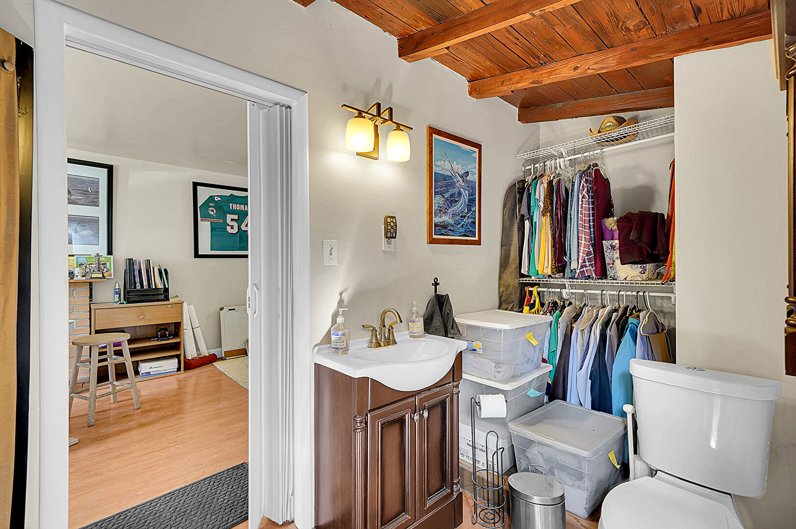 Drywall, Half Bathroom, Vanity, Wood Ceiling, Wood Finish Floor, Beamed Ceiling