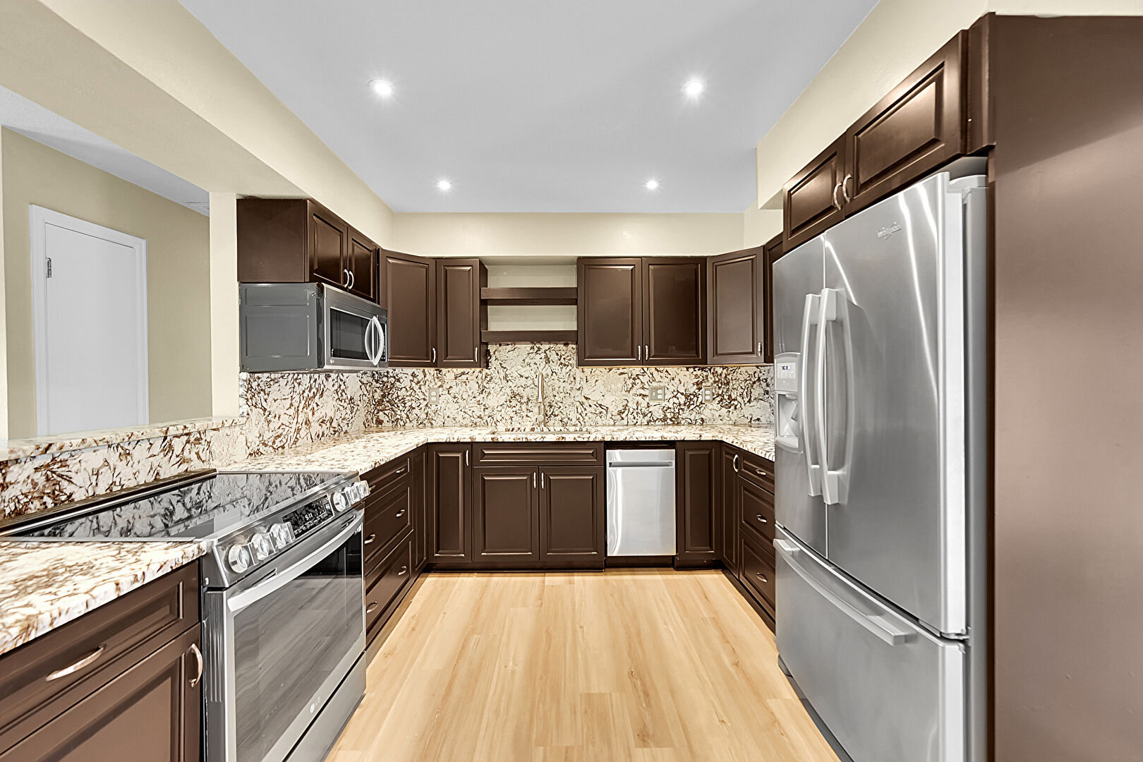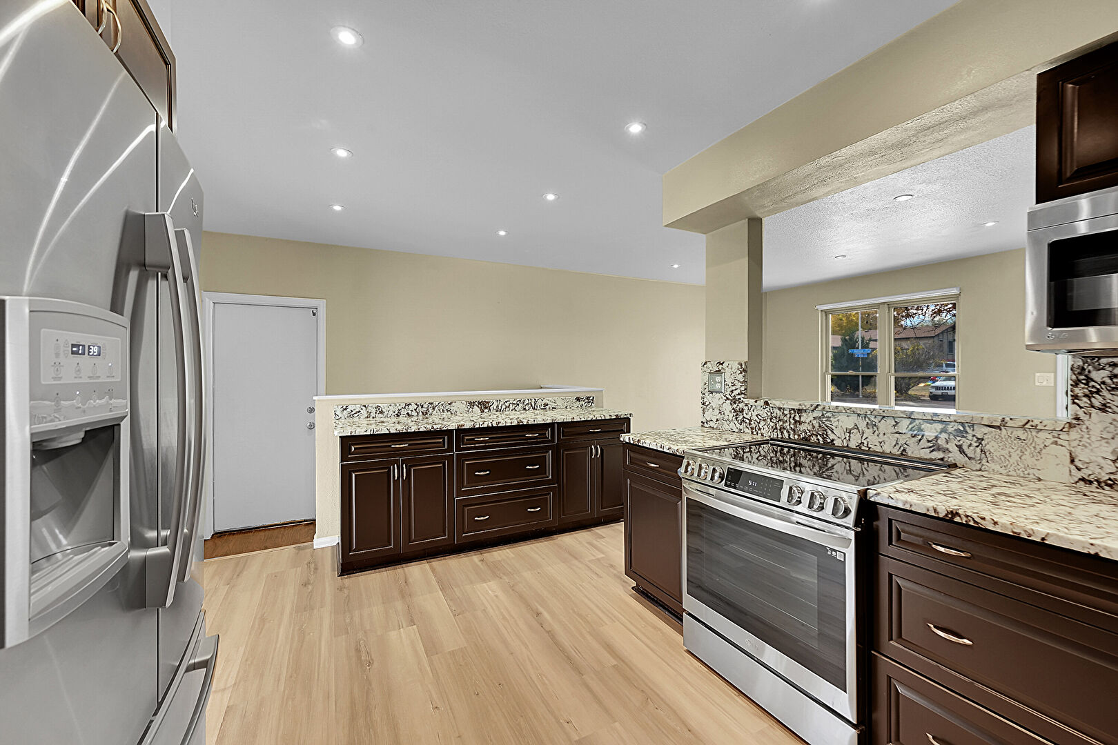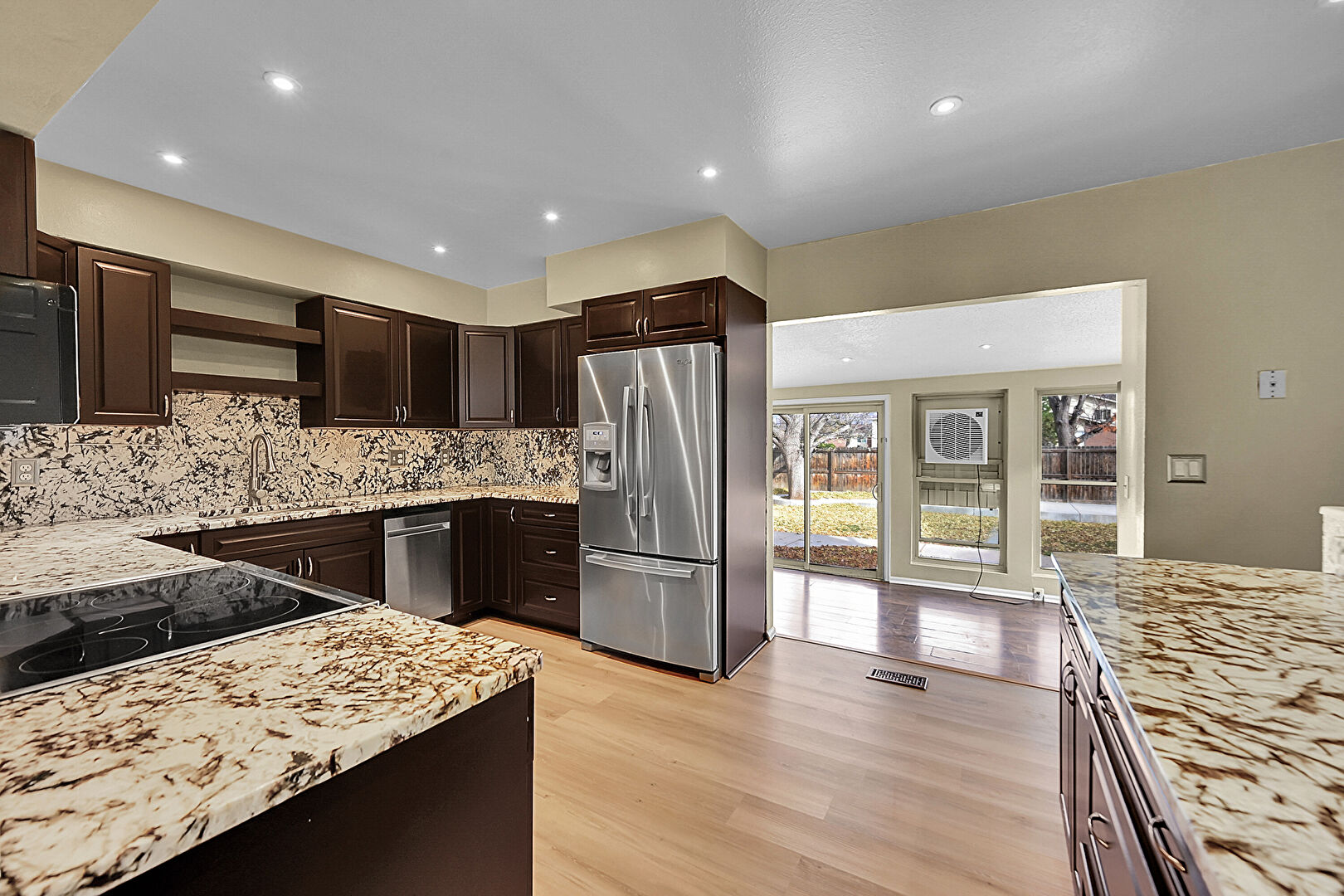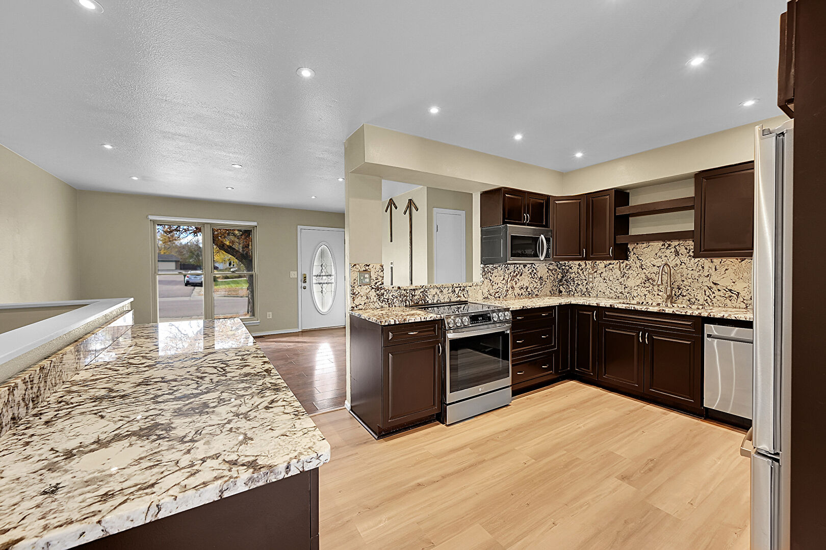 Baseboards Wall, Dark Brown Cabinets, Drywall, Kitchen Peninsula, Natural Light, Open Shelves, Pass Through Window, Raised Cabinets, Recessed Lighting, Stone Countertops, Textured Ceiling, Vent, Wood Finish Floor, Natural Light, Open Shelves, Stone Countertops
