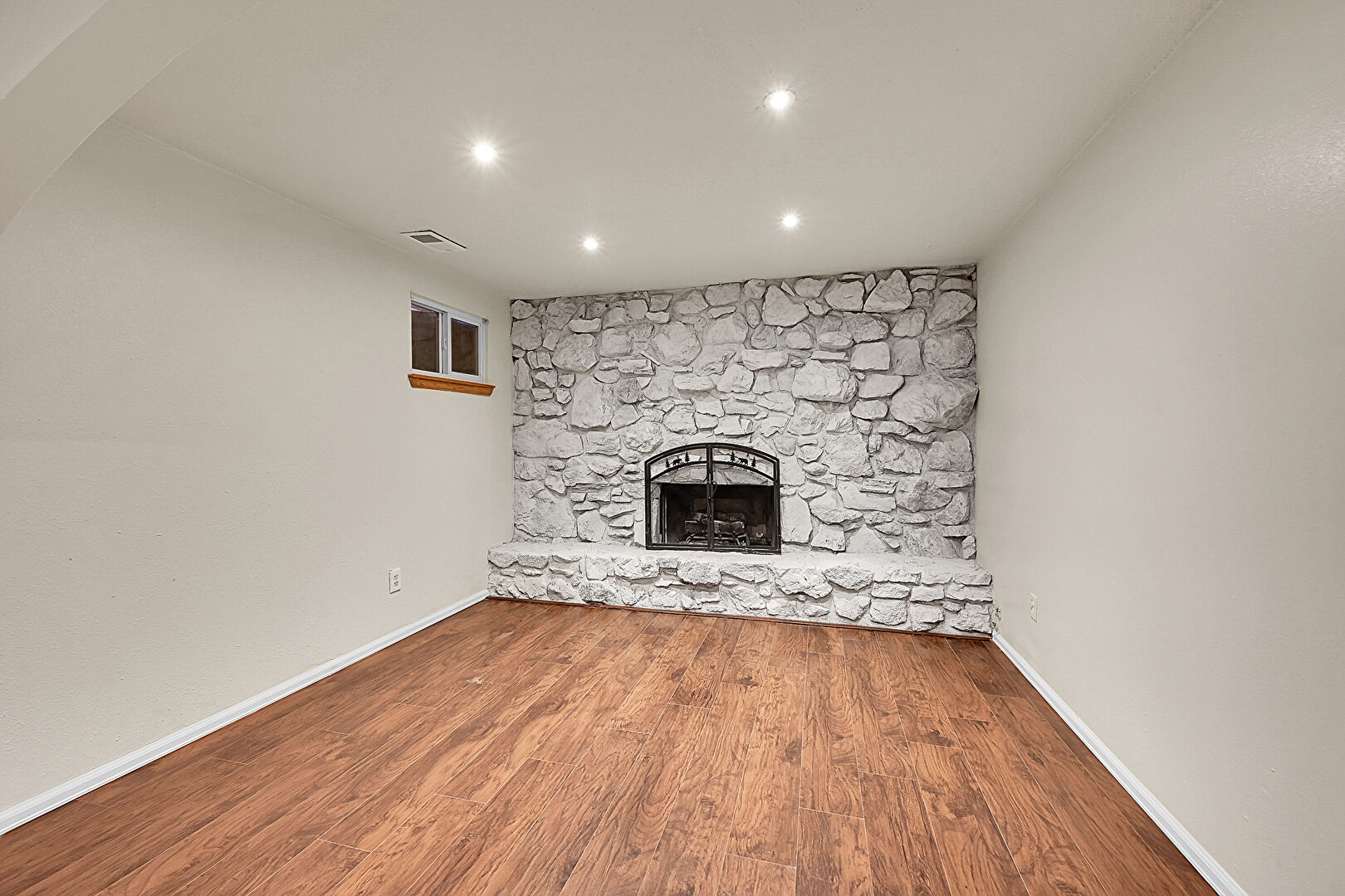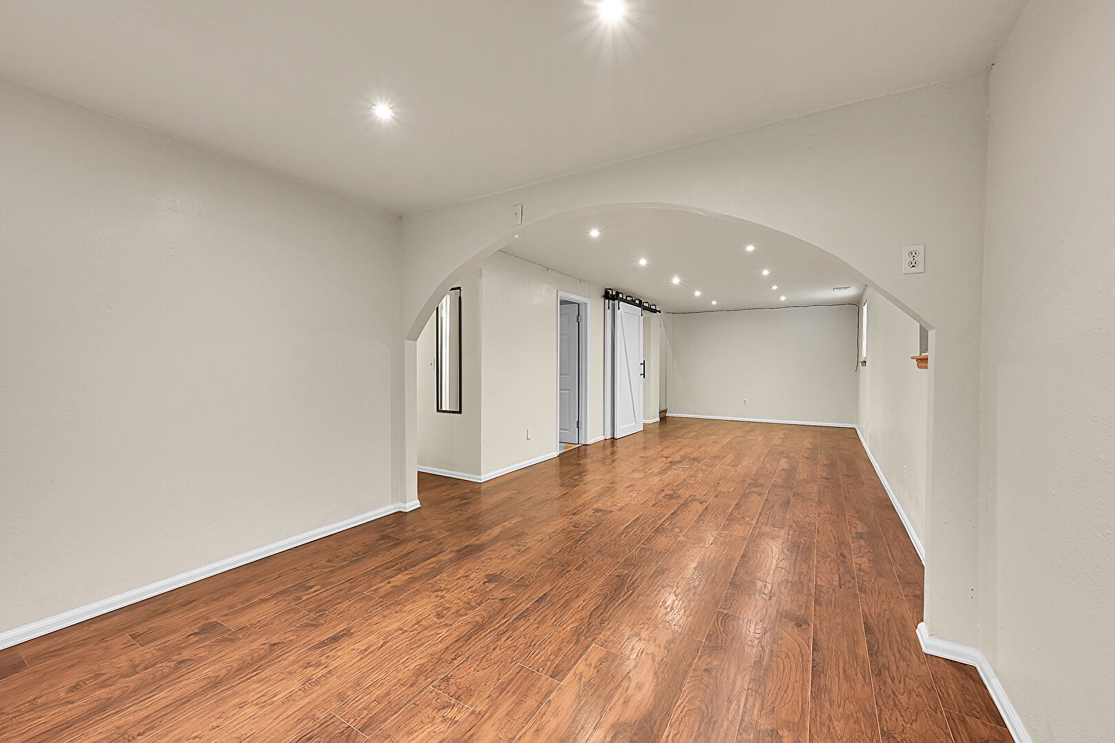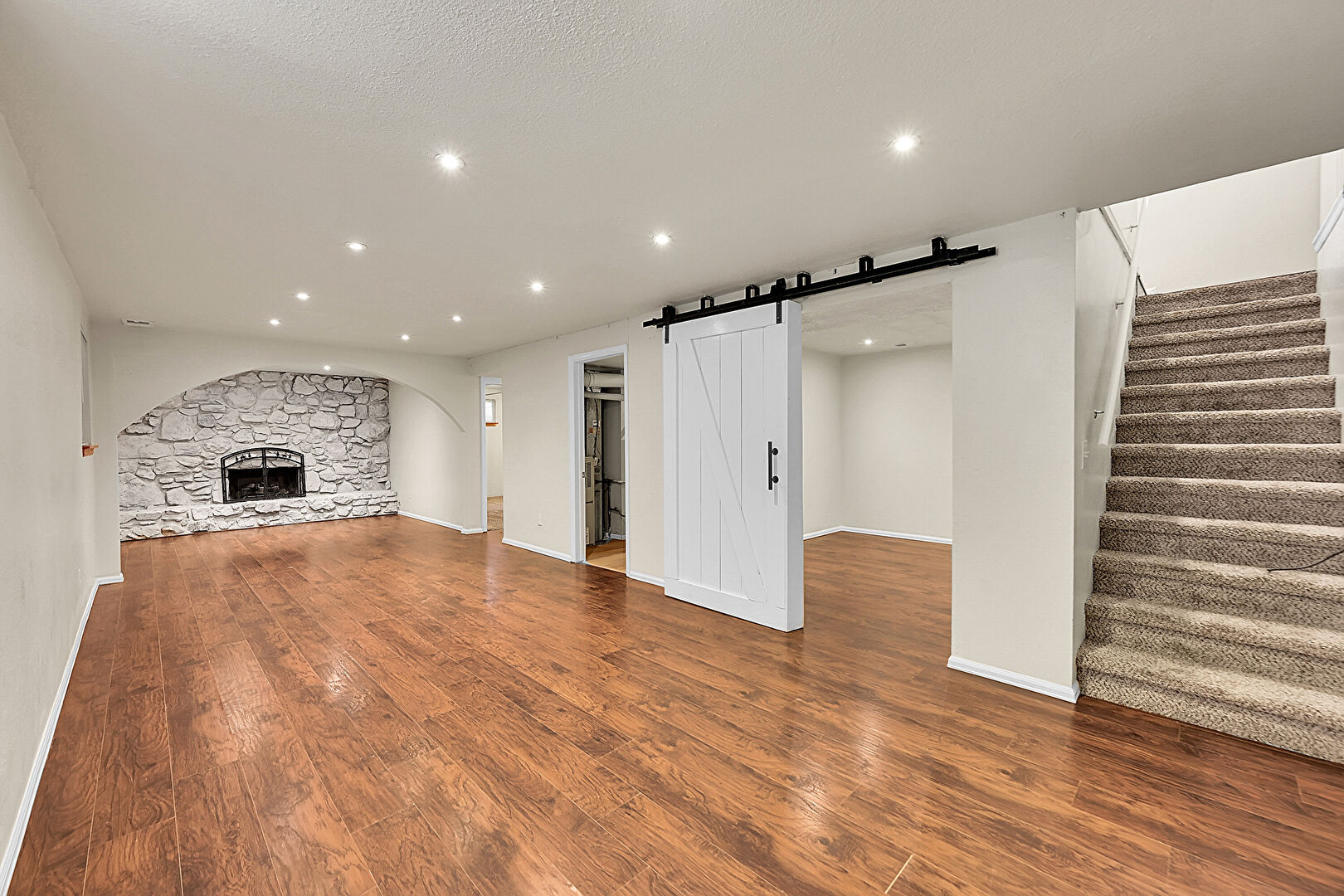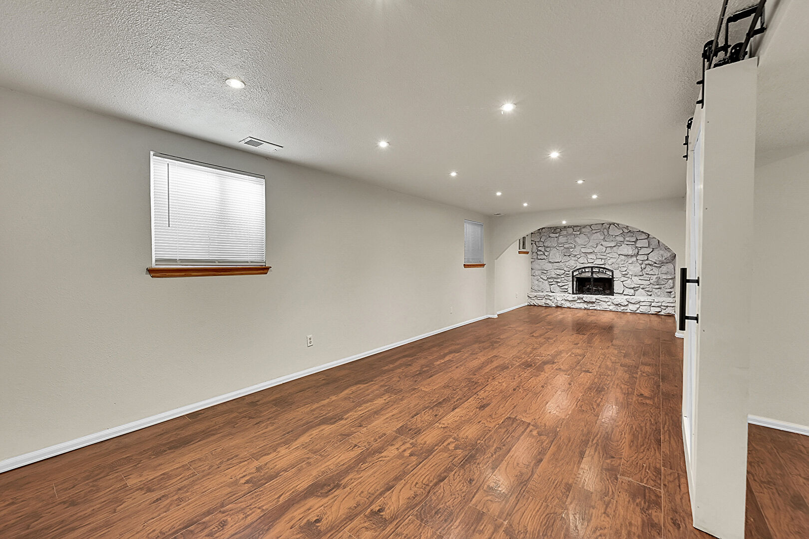 Arched Walkways, Barn Door, Baseboards Wall, Basement, Drywall, Fireplace, Natural Light, Recessed Lighting, Stairs, Stone Wall, Textured Ceiling, Vent, Wood Finish Floor, Barn Door, Fireplace, Natural Light, Wood Finish Floor