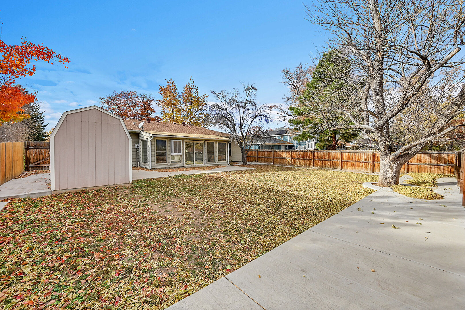 Downspout, Gambrel Roof, Gutters, Horizontal Siding, Lawn, Outdoor Structure, Patio, Satellite Dish, Shed, Sunroom, Vertical Siding, Fence