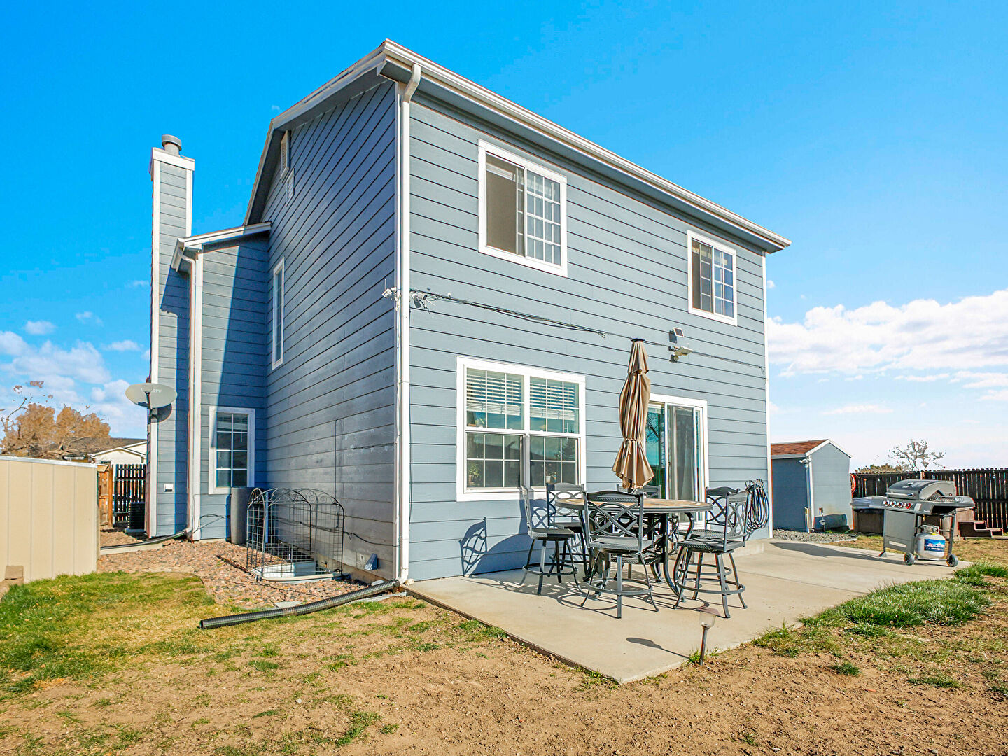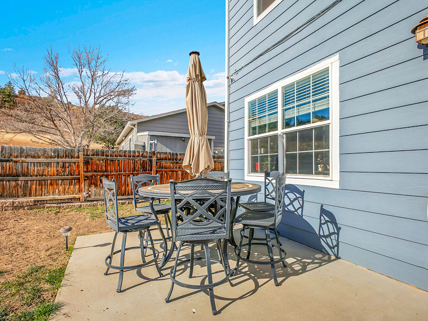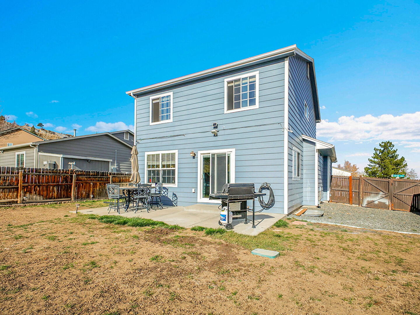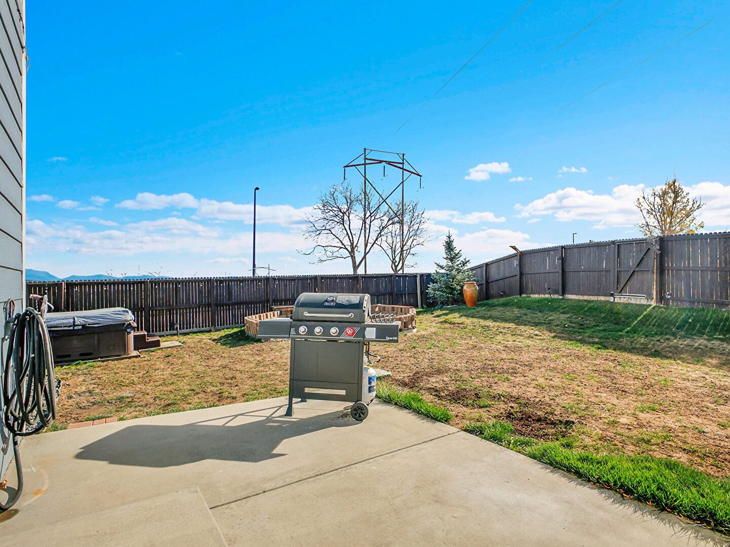 Chimney, Concrete Foundation, Downspout, Fence, Gate, Grill, Gutters, Horizontal Siding, Lawn, Mountain View, Patio, Residential View, Satellite Dish, Fire Pit, Grill, Lawn