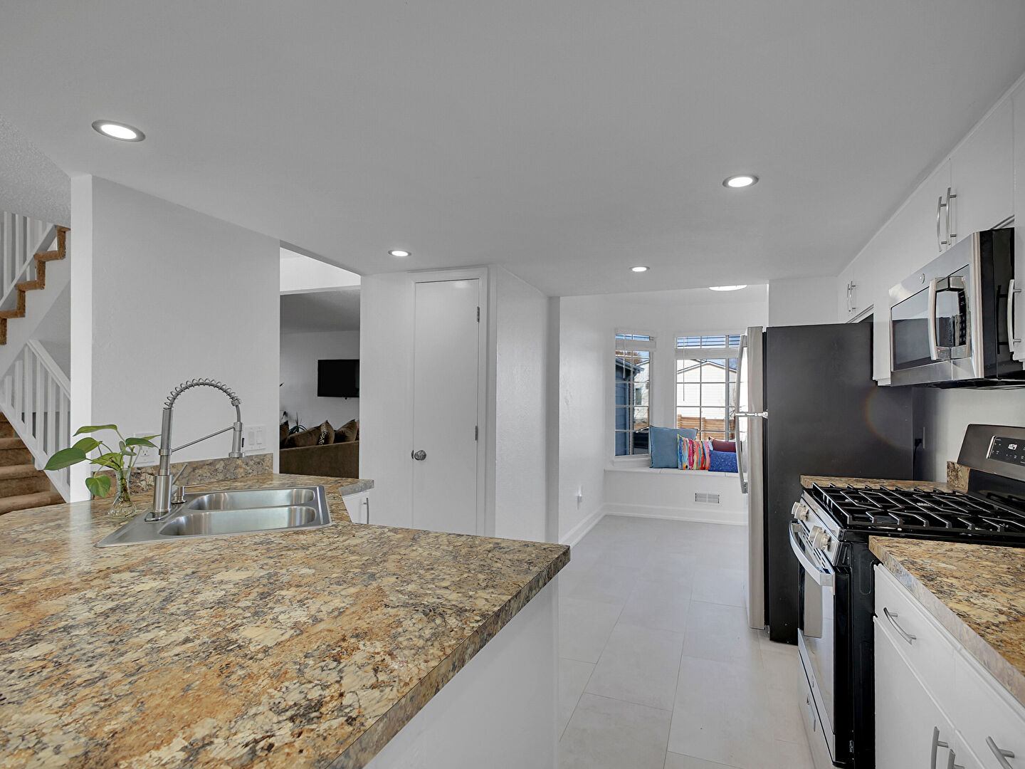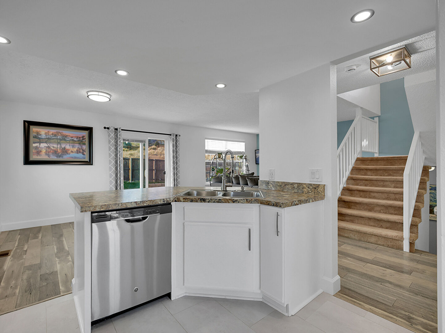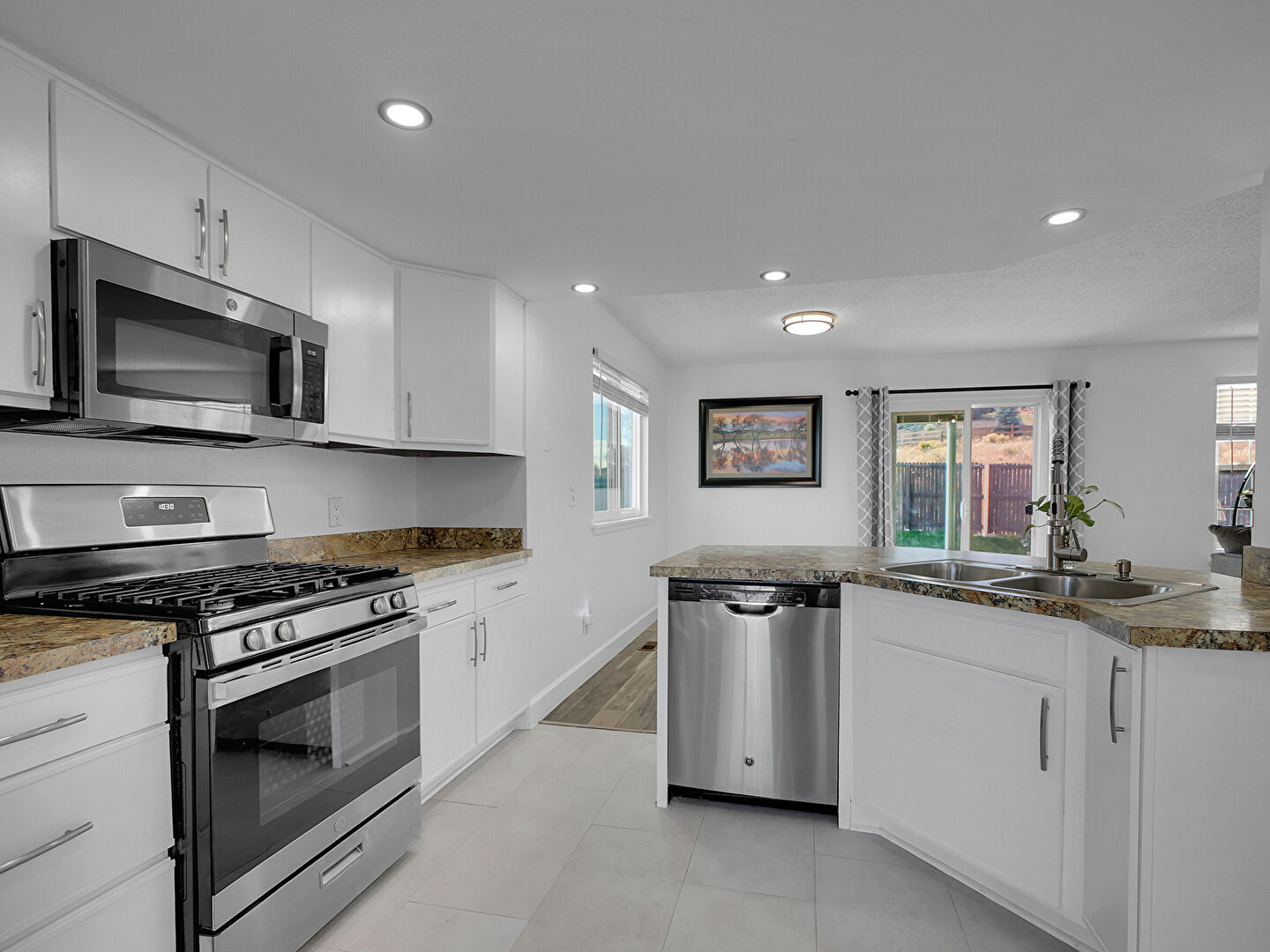 Baseboards Wall, Drywall, Kitchen Peninsula, Natural Light, Pass Through Window, Recessed Lighting, Shaker Cabinets, Stone Countertops, Textured Ceiling, Tile Floor, U Shaped Kitchen, Vent, Wood Finish Floor, Baseboards Wall, Drywall, Kitchen Peninsula, Natural Light, Opens To Living Area, Recessed Lighting