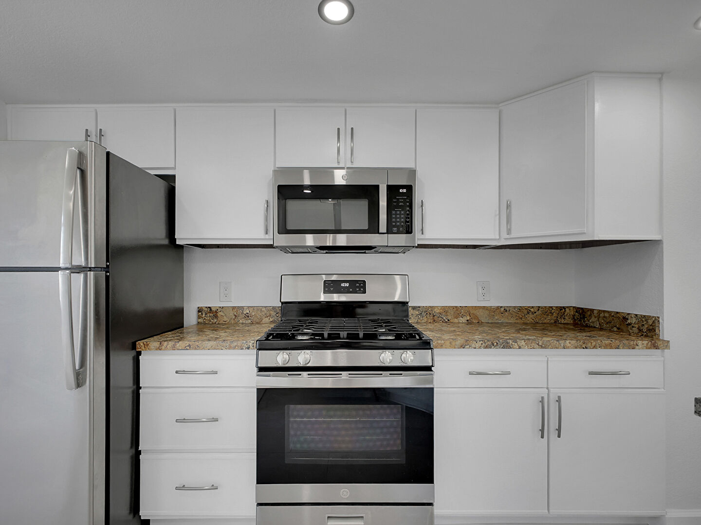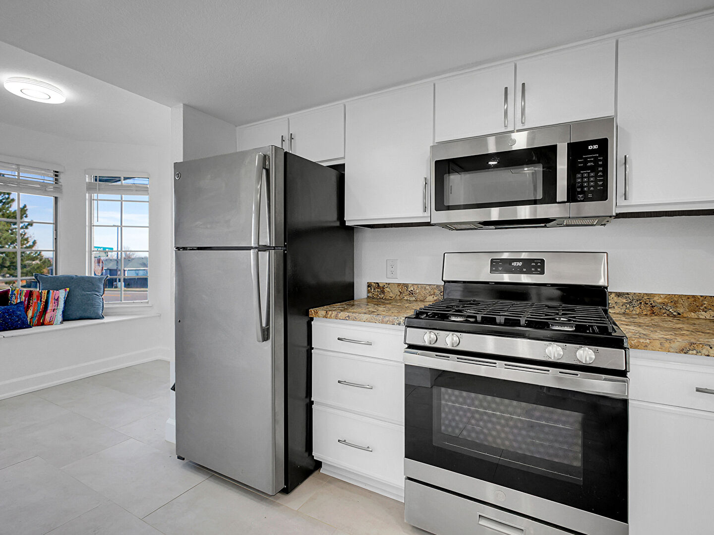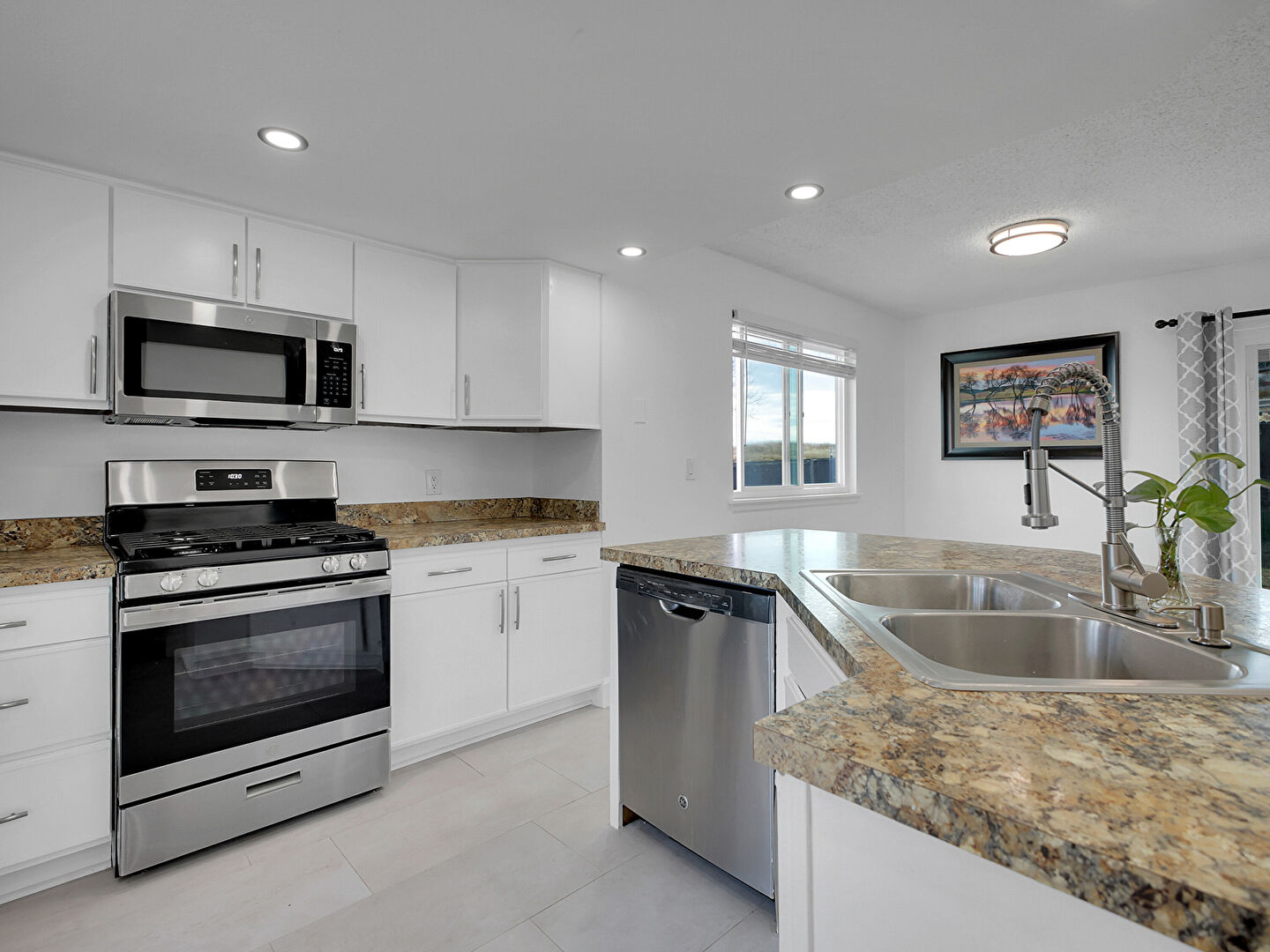Baseboards Wall, Drywall, Kitchen Peninsula, Natural Light, Pass Through Window, Recessed Lighting, Shaker Cabinets, Stone Countertops, Textured Ceiling, Tile Floor, U Shaped Kitchen, Vent, Wood Finish Floor, Baseboards Wall, Drywall, Kitchen Peninsula, Natural Light, Opens To Living Area, Recessed Lighting