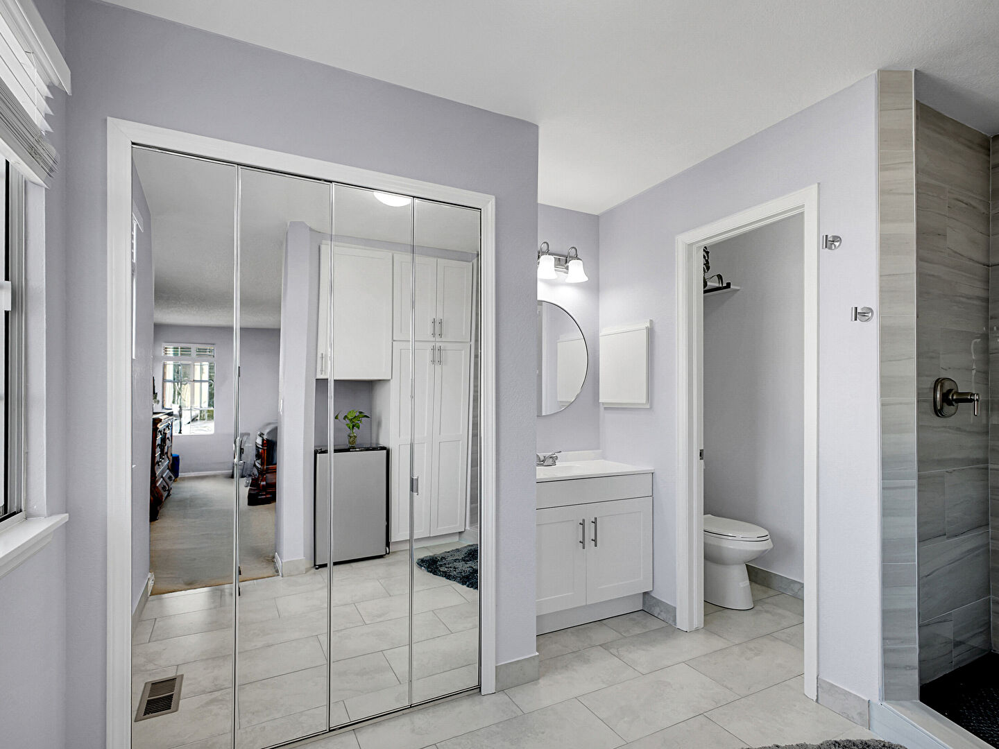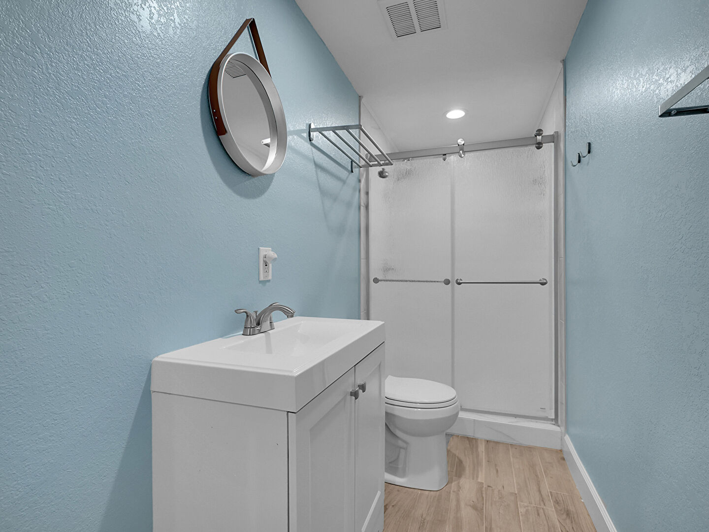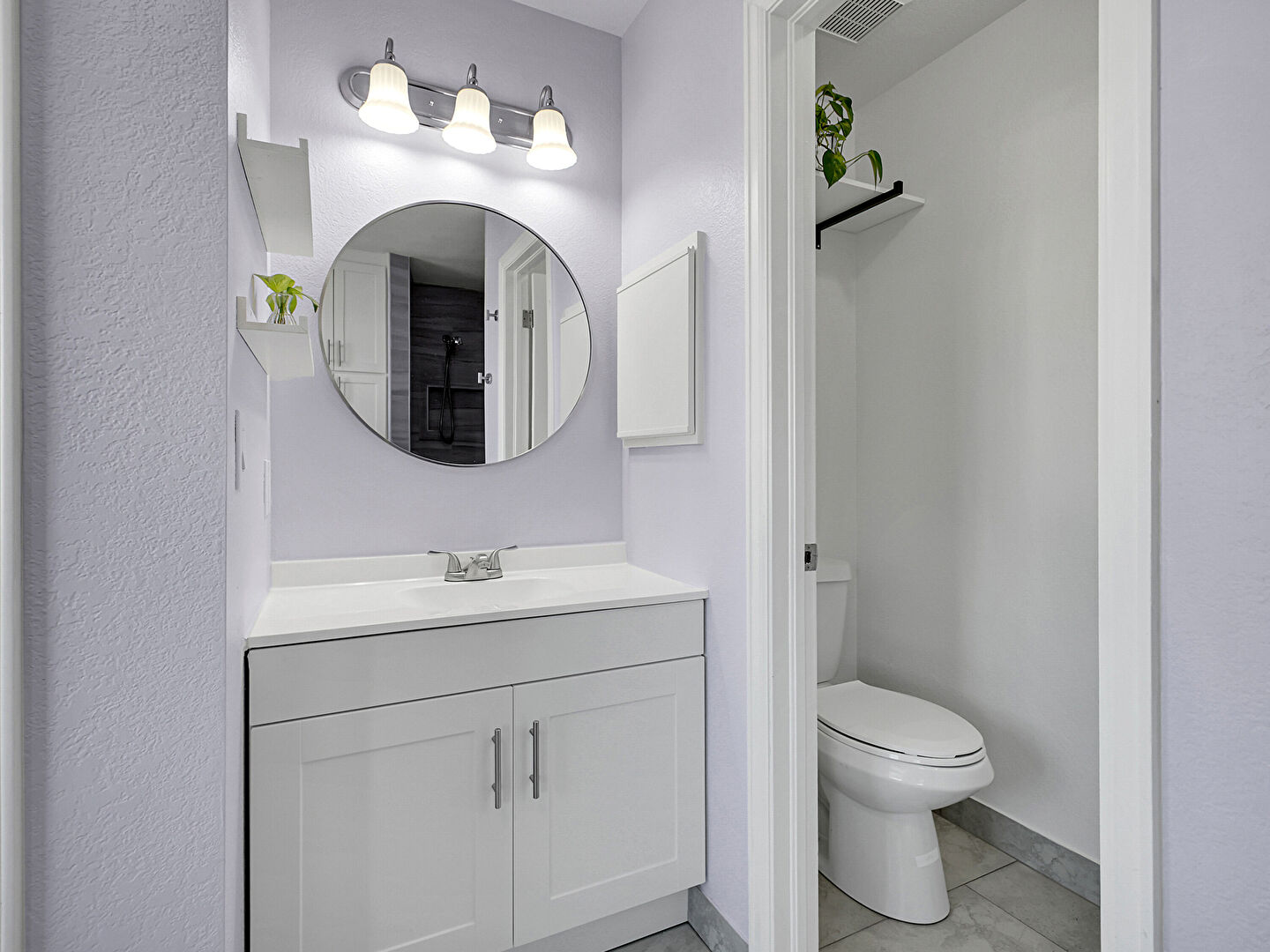Baseboards Wall, Closet, Drywall, Full Bathroom, Half Bathroom, Natural Light, Recessed Lighting, Textured Wall, Tile Floor, Vanity, Vent, Water Closet, Wood Finish Floor, Baseboards Wall, Full Bathroom, Textured Wall, Tile Floor, Vanity, Vent, Water Closet