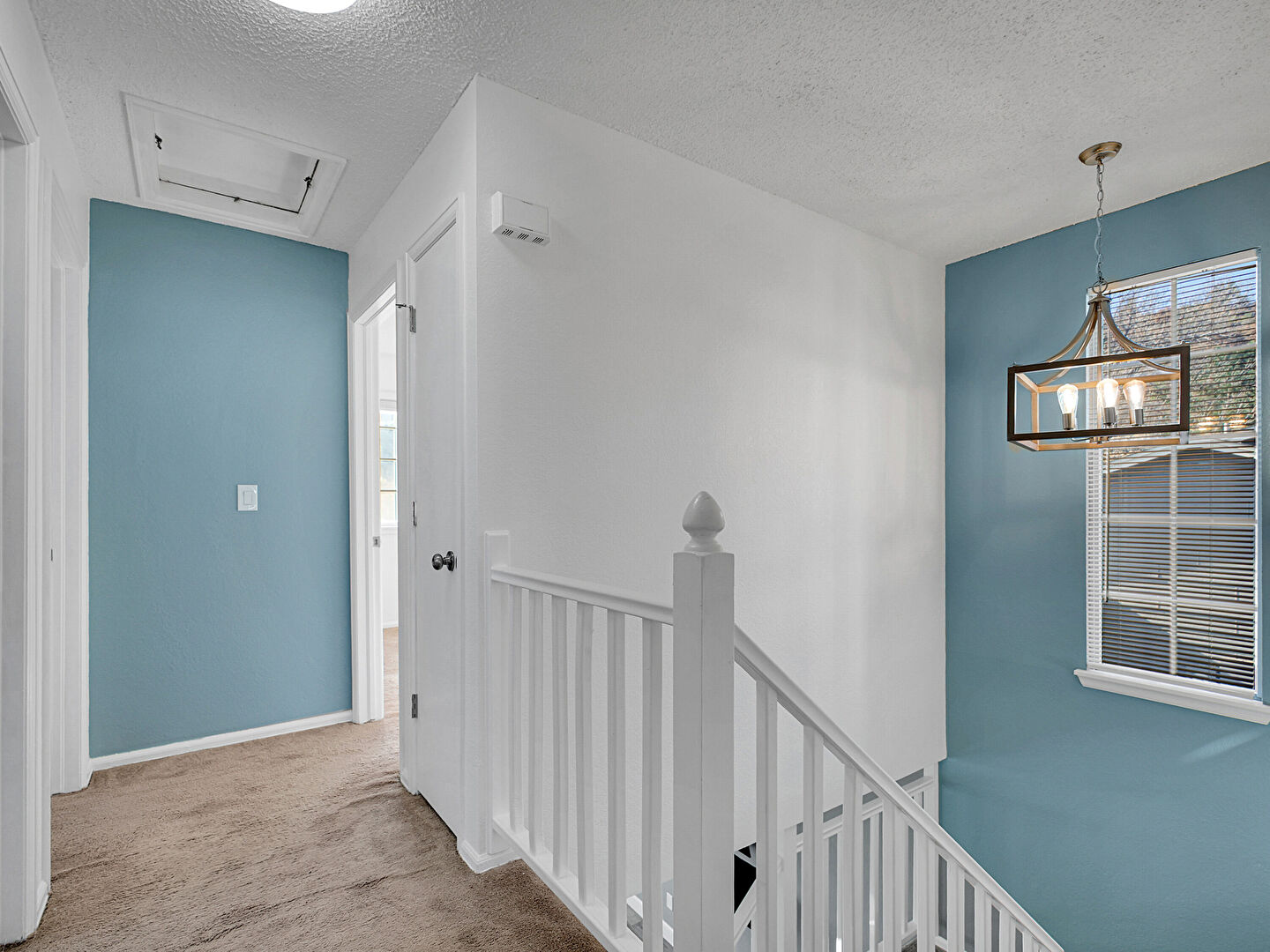 Baseboards Wall, Carpet, Drywall, Natural Light, Scuttle, Textured Ceiling, Whole House Fan, Upstairs Landing