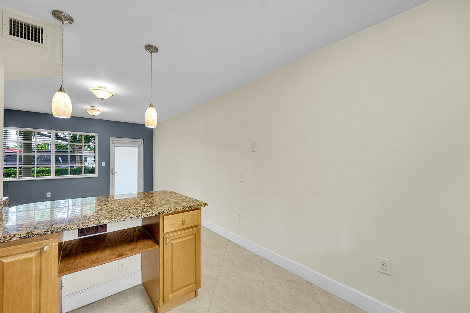 Arched Cabinets, Baseboards Wall, Crown Molding Cabinets, Drywall, Kitchen Peninsula, Medium Brown Cabinets, Natural Light, Office Area, Opens To Living Area, Pendant Lighting, Raised Cabinets, Stone Countertops, Tile Floor, U Shaped Kitchen, Vent, Baseboards Wall, Drywall, Pendant Lighting, Stone Countertops, Vent