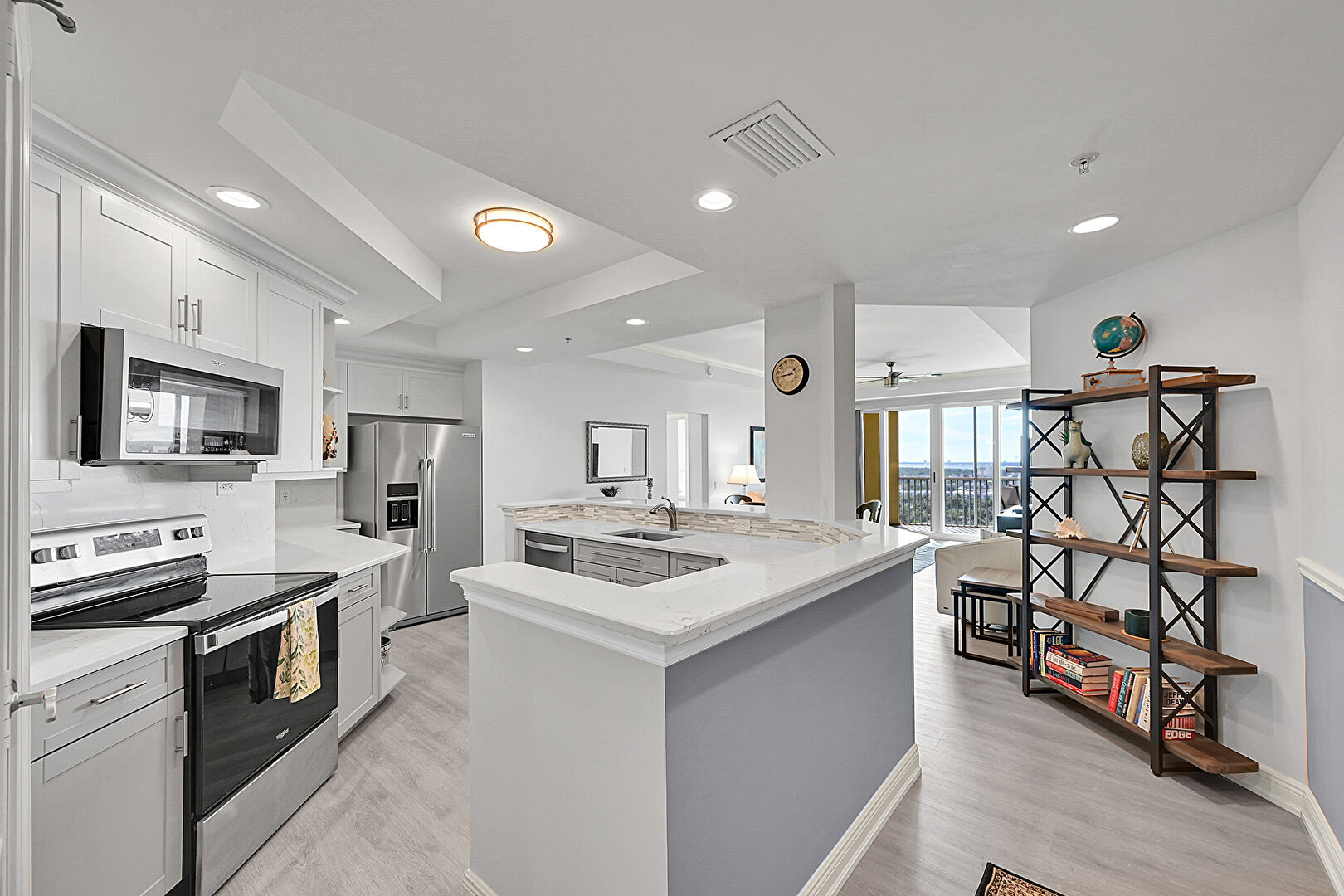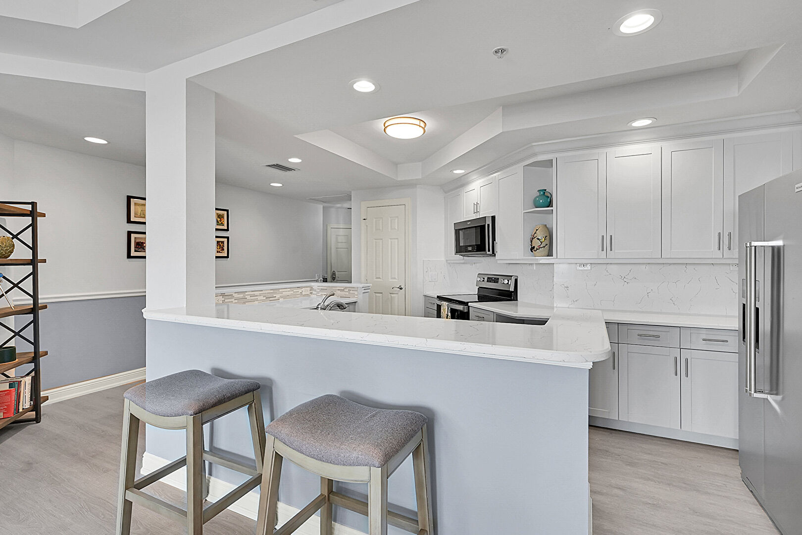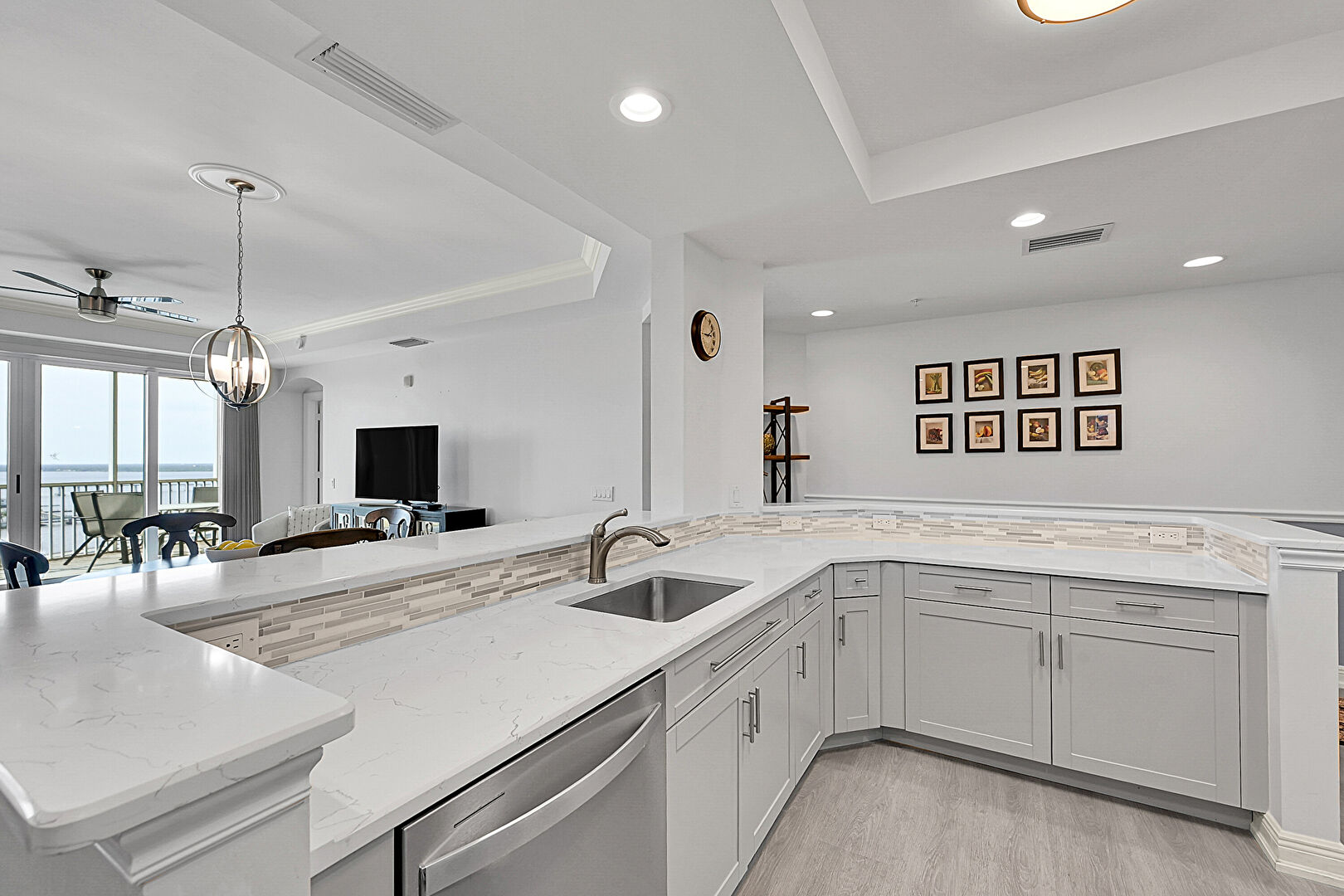 Baseboards Wall, Ceiling Fan, Crown Molding Cabinets, Drywall, Gray Cabinets, Kitchen Bar, Kitchen Island, Kitchen Peninsula, Natural Light, Notable Chandelier, Open Shelves, Opens To Living Area, Pendant Lighting, Pendent Fire Sprinkler, Recessed Lighting, Shaker Cabinets, Stone Countertops, Tray Ceiling, Vent, Wood Finish Floor, Crown Molding Cabinets, Open Shelves, Shaker Cabinets