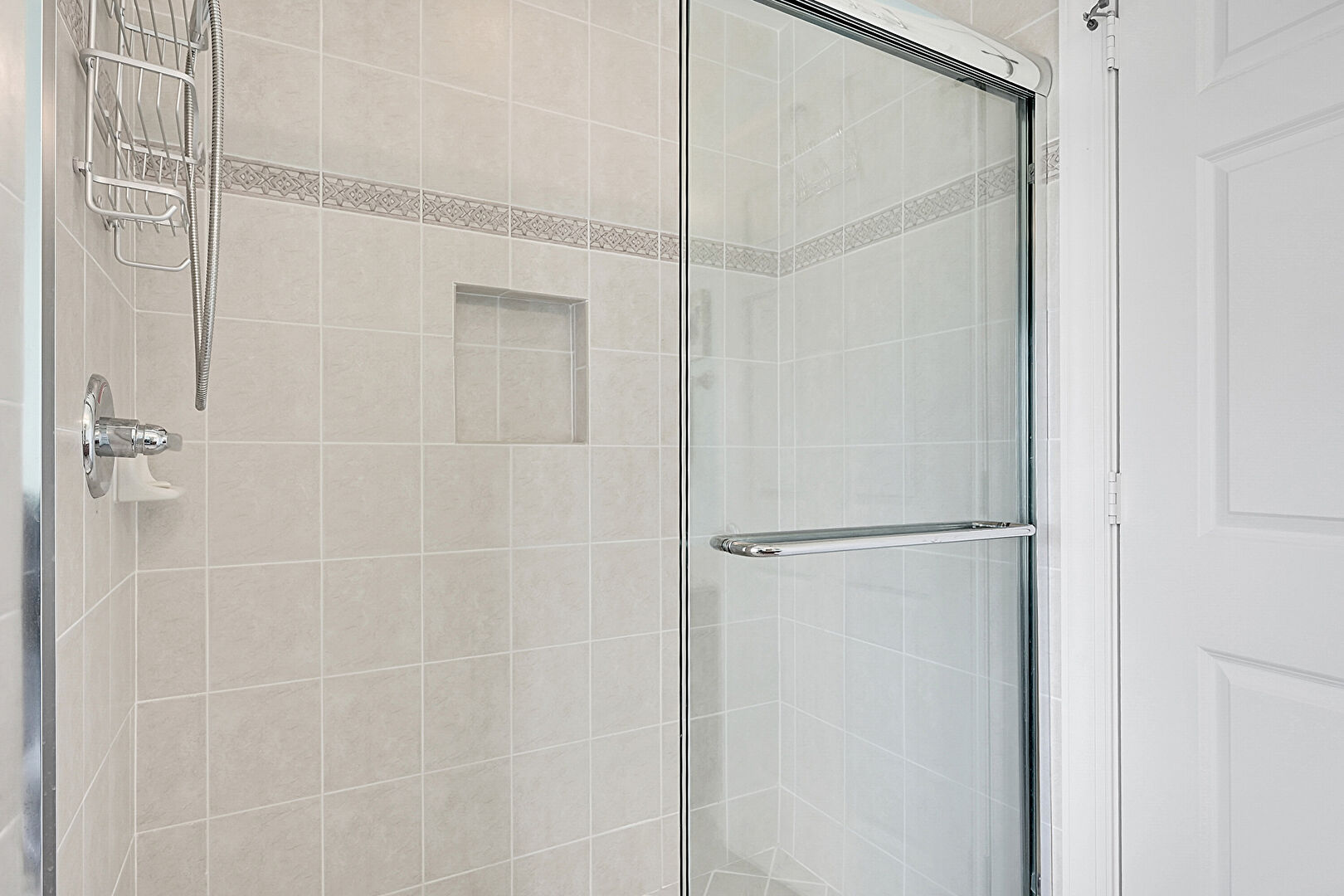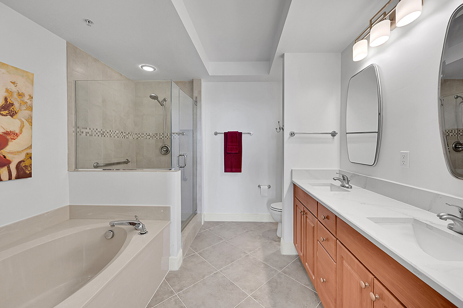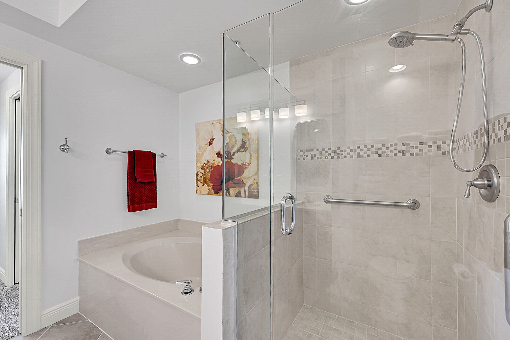 Baseboards Wall, Double Vanity, Drywall, Full Bathroom, Natural Light, Recessed Lighting, Tile Floor, Tray Ceiling, Vanity, Vent, Baseboards Wall, Double Vanity, Drywall, Full Bathroom