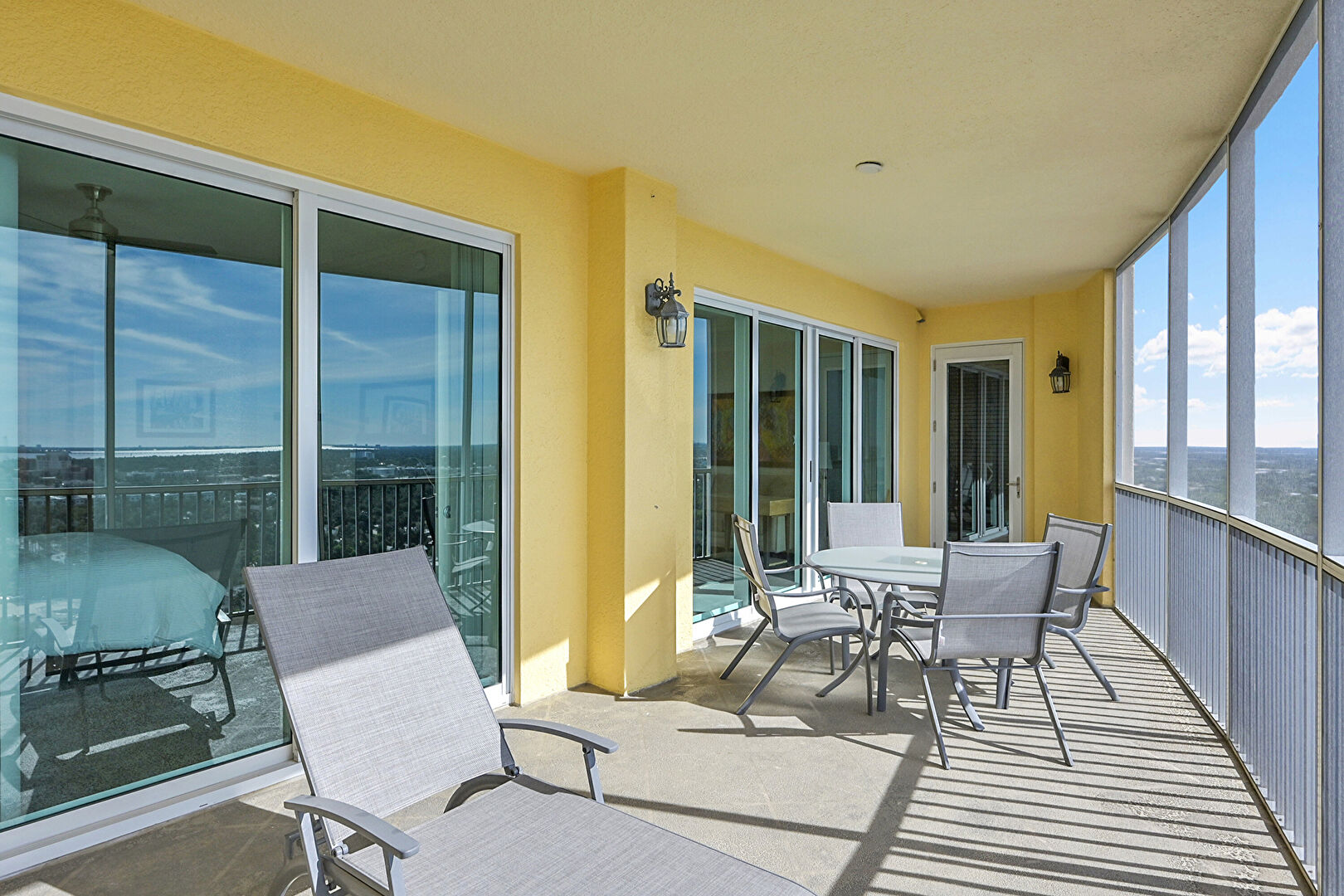 Balcony, Carpet, Drywall, Floor Ceiling Windows, Natural Light, Oceanfront, Outdoor Dining Area, Sunroom, Textured Ceiling, Water View, Bridge View, Natural Light, Sunroom, Waterfront
