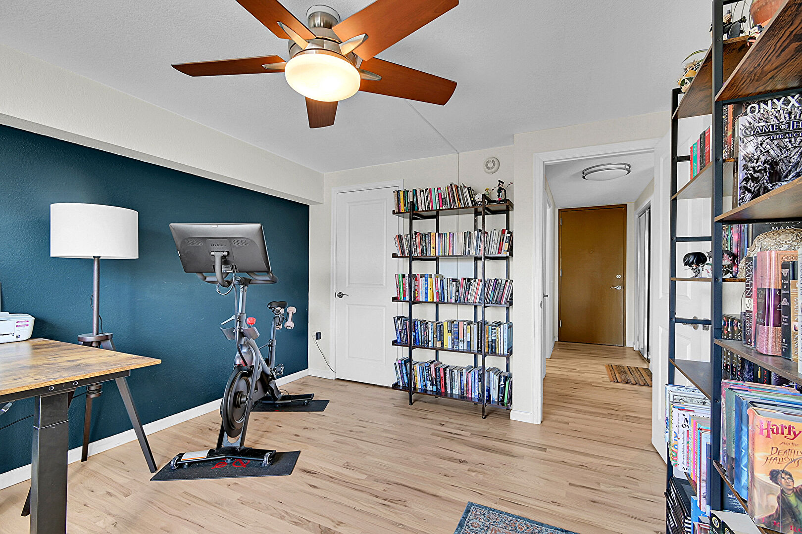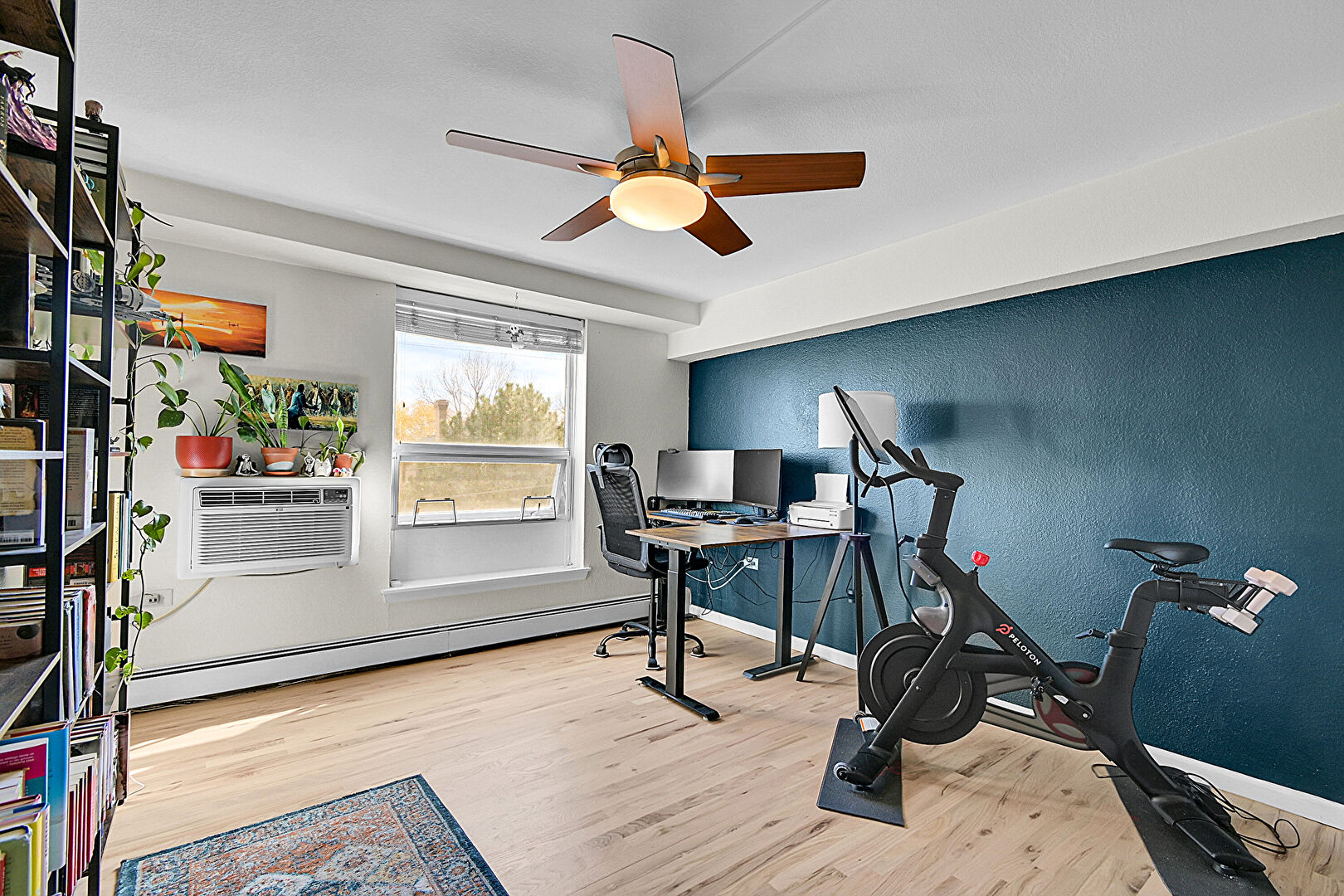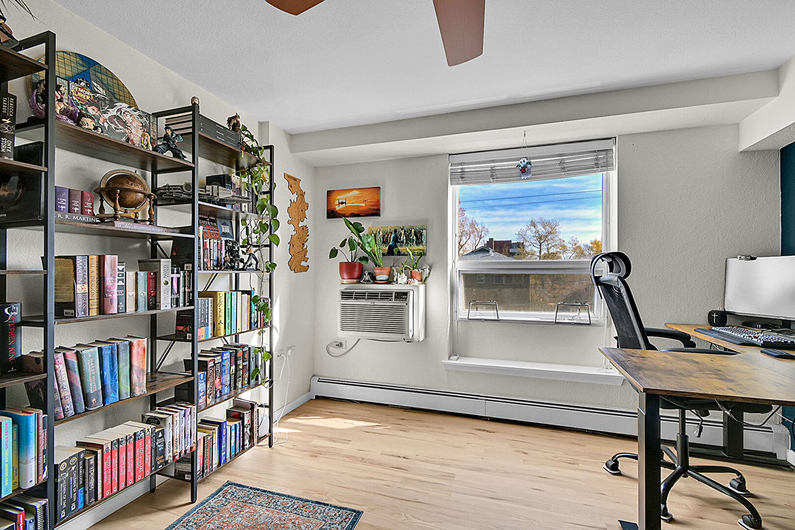 Baseboard Radiator, Baseboards Wall, Ceiling Fan, Drywall, Natural Light, Office Area, Wall Mounted Ac, Window Mounted Ac, Wood Finish Floor, Ceiling Fan, Textured Wall, Wood Finish Floor