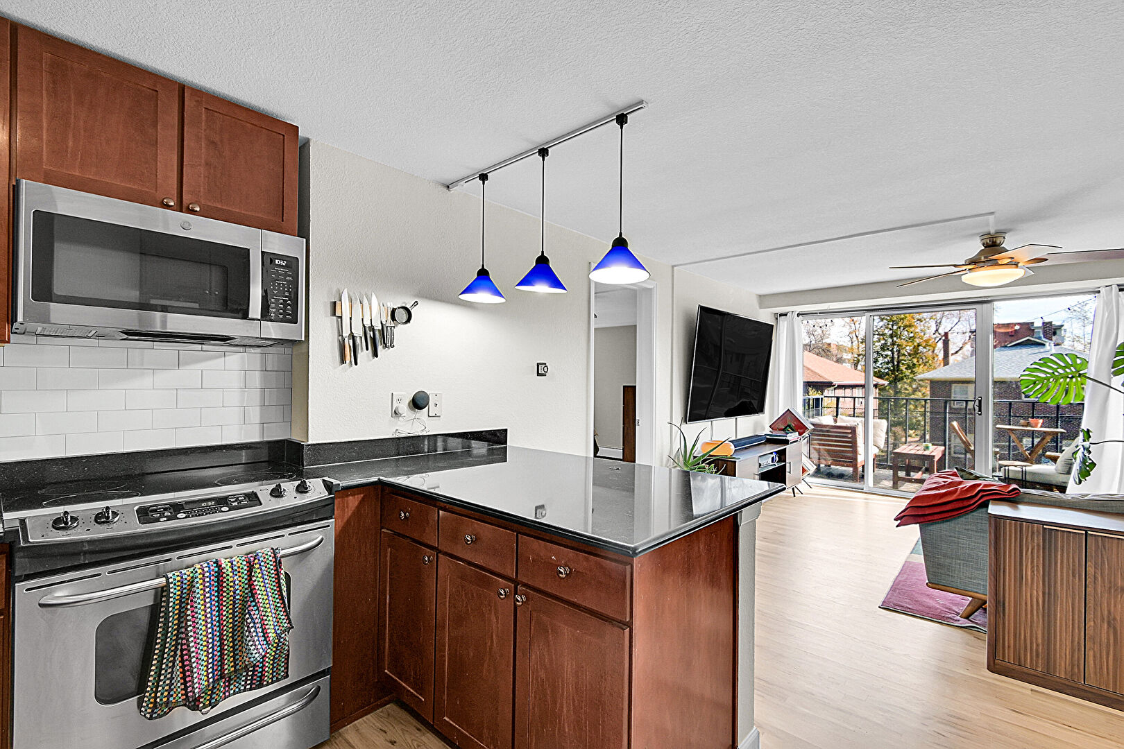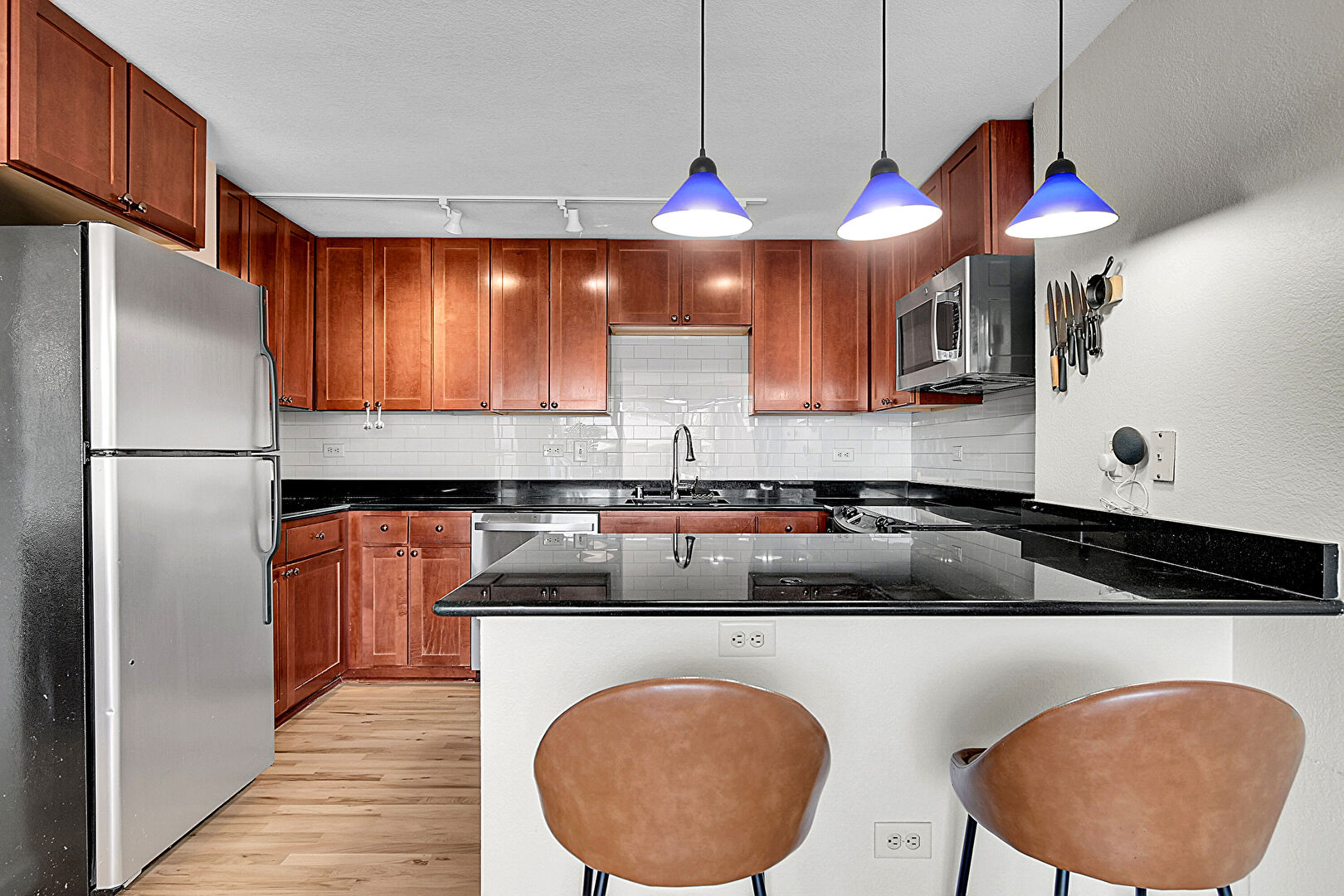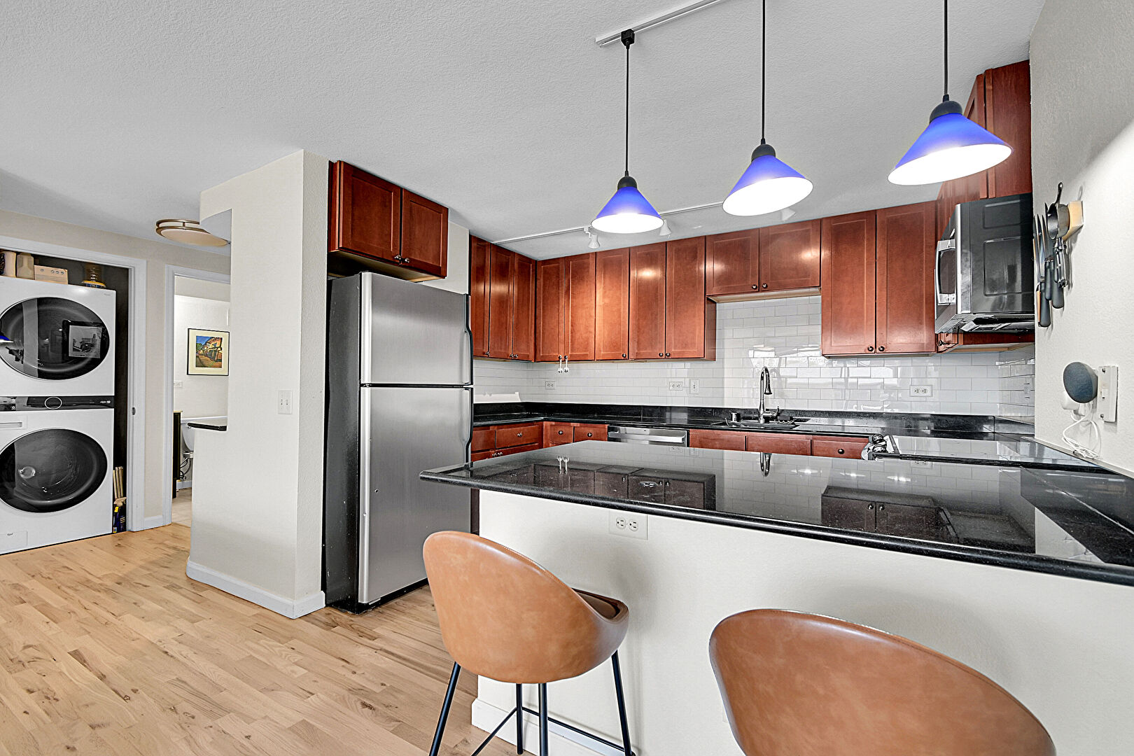 Baseboards Wall, Dark Brown Cabinets, Drywall, G Shaped Kitchen, Kitchen Bar, Kitchen Peninsula, Laundry, Medium Brown Cabinets, Natural Light, Opens To Living Area, Pendant Lighting, Shaker Cabinets, Stone Countertops, Textured Ceiling, Textured Wall, Track Lighting, Vent, Wood Finish Floor, Ceiling Fan, G Shaped Kitchen, Laundry, Pendant Lighting, Stone Countertops, Textured Wall