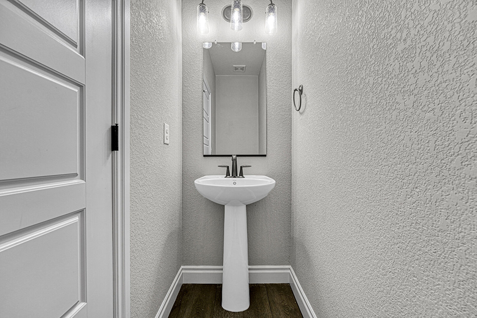 Baseboards Wall, Carpet, Combined Bath Shower, Half Bathroom, Natural Light, Textured Ceiling, Textured Wall, Vanity, Vent, Wood Finish Floor, Baseboards Wall, Full Bathroom, Half Bathroom