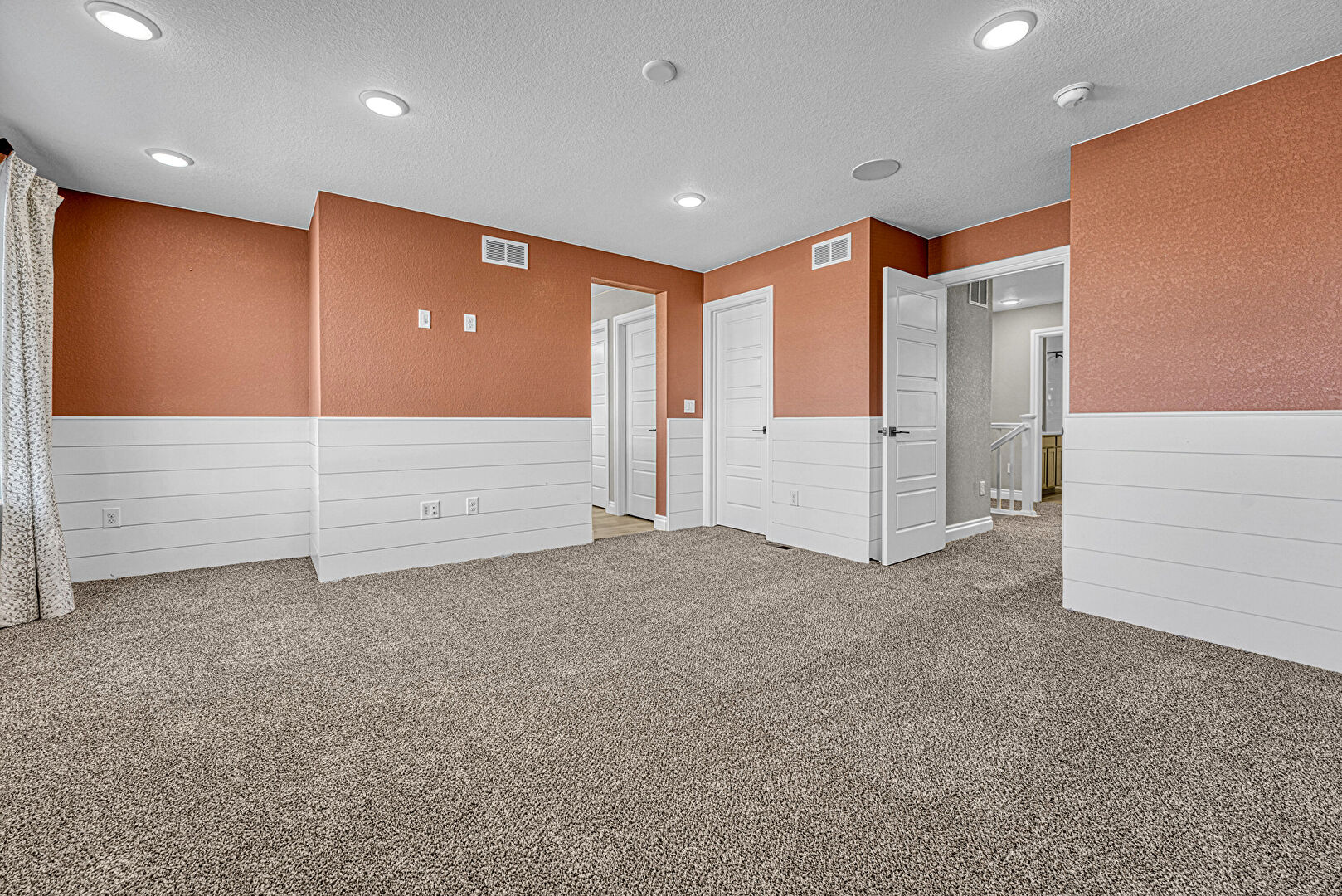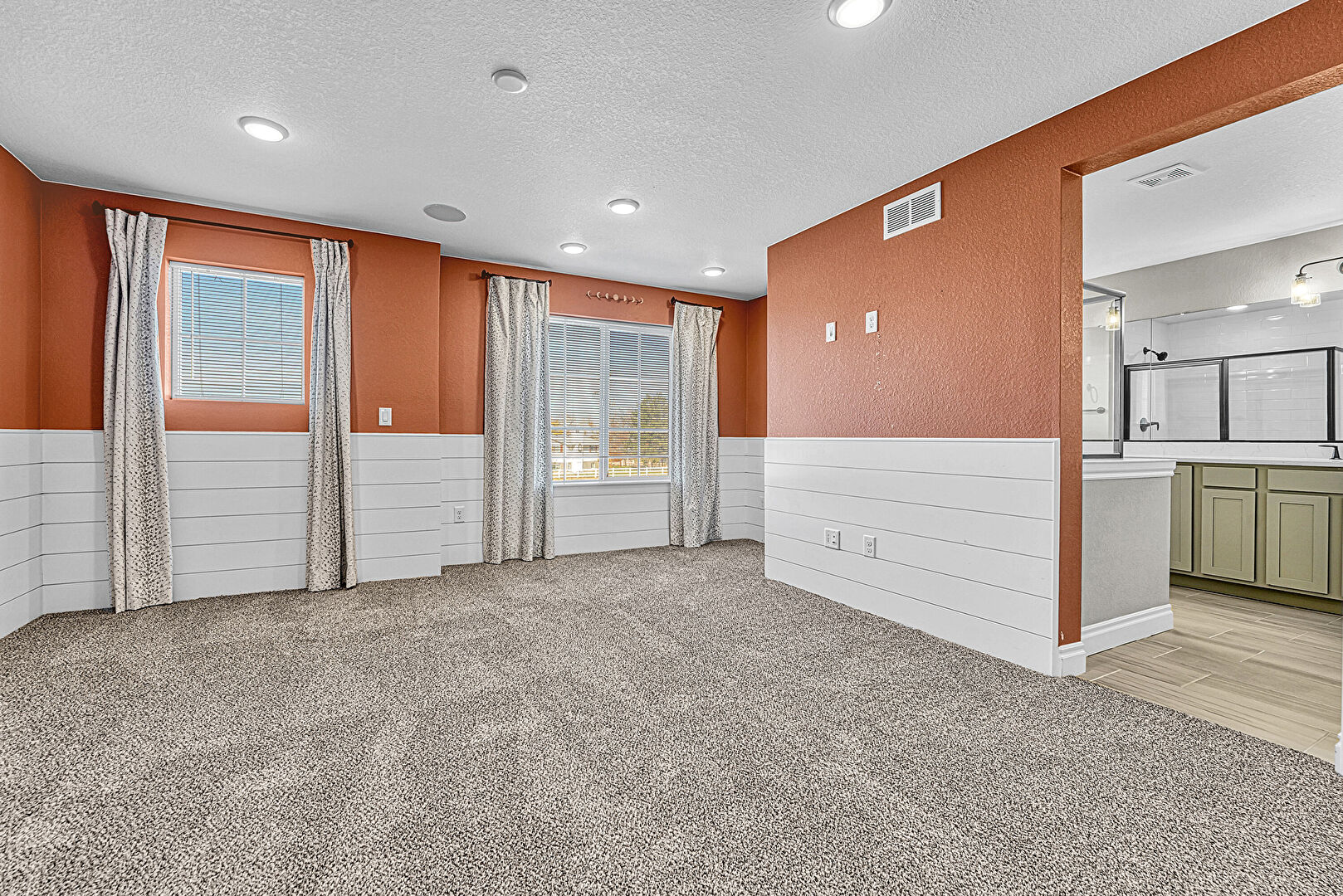 Baseboards Wall, Carpet, Drywall, Natural Light, Recessed Lighting, Smoke Carbon Monoxide Detector, Textured Ceiling, Textured Wall, Vent, Wainscot Wall, Wood Finish Floor, Recessed Lighting, Textured Ceiling
