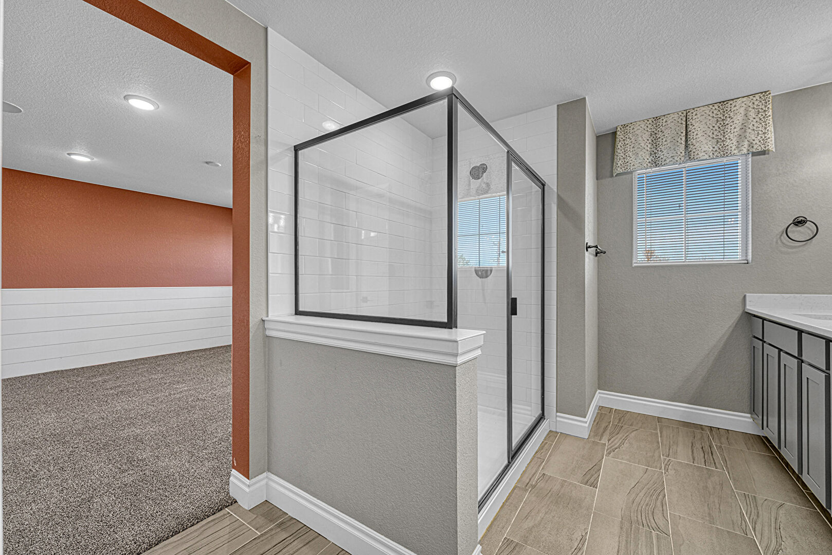 Baseboards Wall, Carpet, Double Vanity, Full Bathroom, Recessed Lighting, Textured Ceiling, Vanity, Vent, Drywall, Natural Light