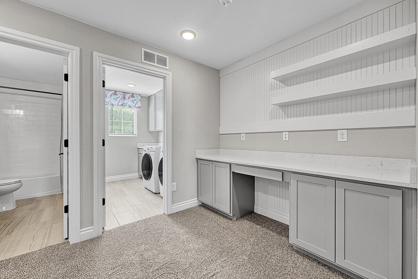 Baseboards Wall, Built In Desk, Carpet, Drywall, Laundry, Natural Light, Office Area, Recessed Lighting, Textured Ceiling, Tile Floor, Vent, Carpet, Drywall