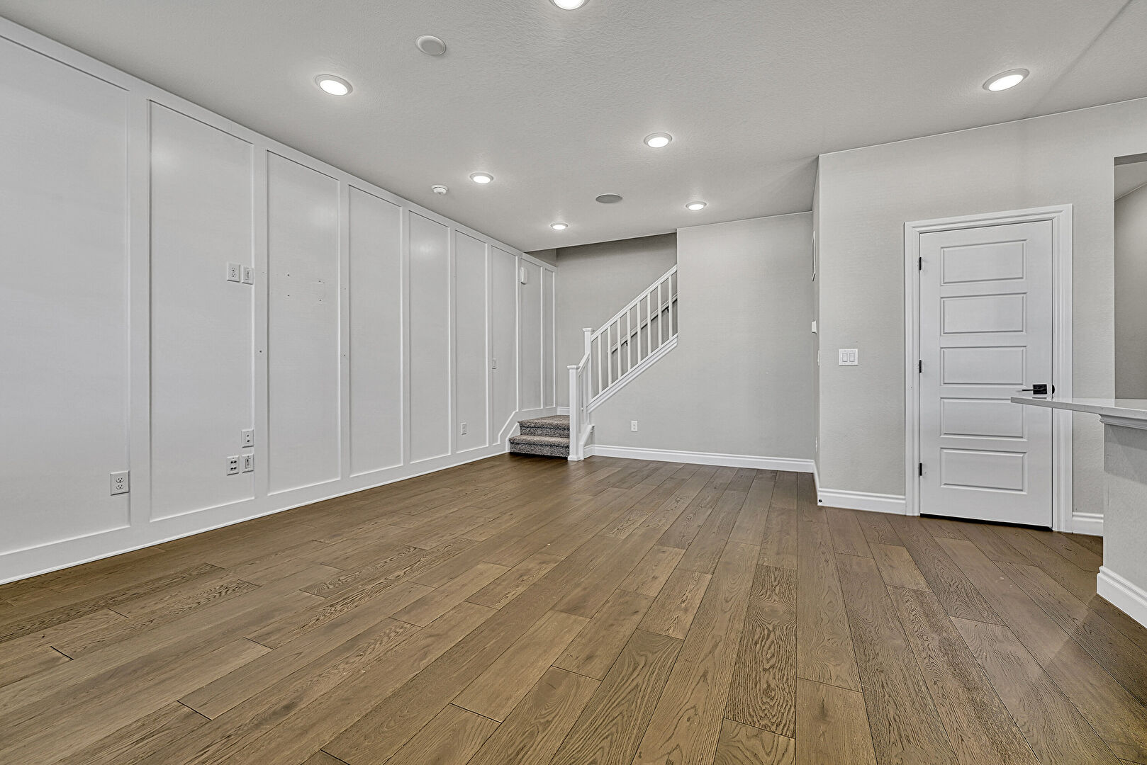 Paneling Wall, Recessed Lighting, Smoke Carbon Monoxide Detector, Stairs, Vent, Wood Finish Floor, Baseboards Wall
