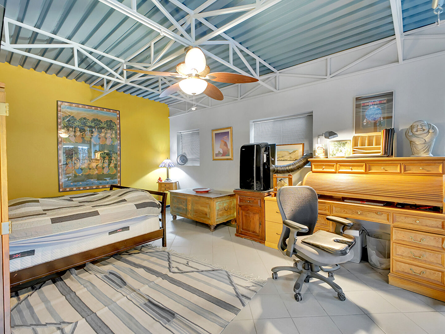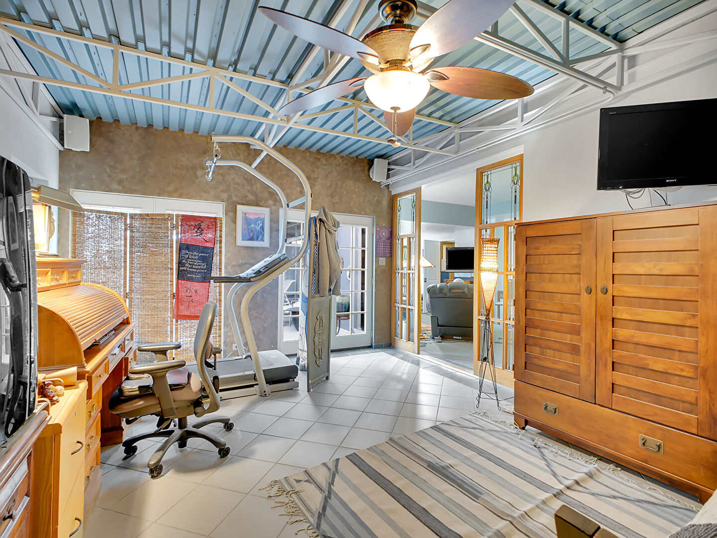 Baseboards Wall, Ceiling Fan, Drywall, French Doors, Hot Tub, Natural Light, Office Area, Tile Floor, Carpet, Drywall, Patio