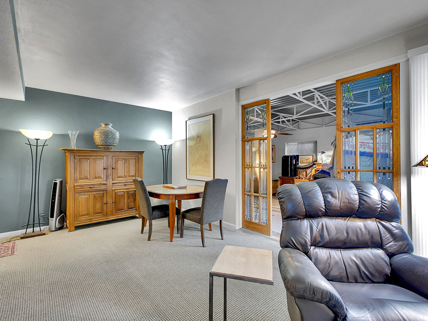 Carpet, Drywall, French Doors, Natural Light, Office Area, Tile Floor, Track Lighting, Baseboards Wall, Vent