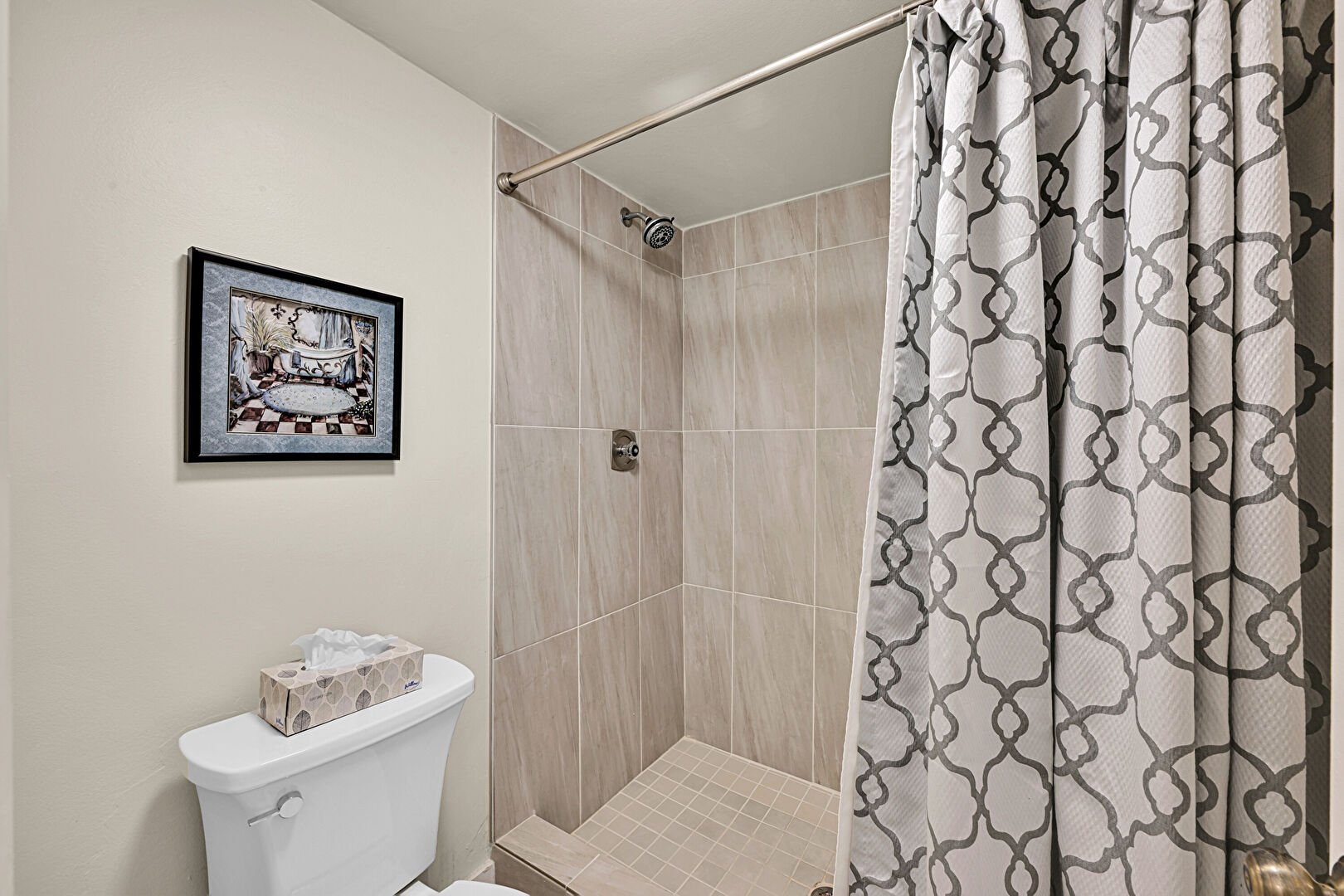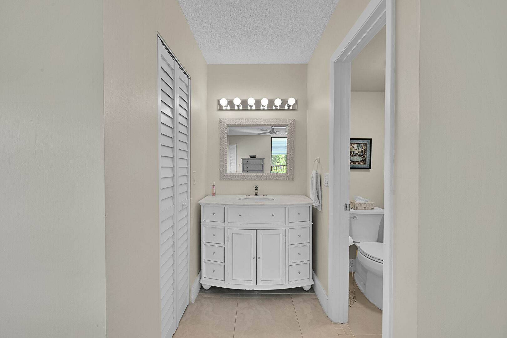 Baseboards Wall, Closet, Combined Bath Shower, Drywall, Full Bathroom, Textured Ceiling, Tile Floor, Vanity, Water Closet, Full Bathroom, Natural Light, Vanity