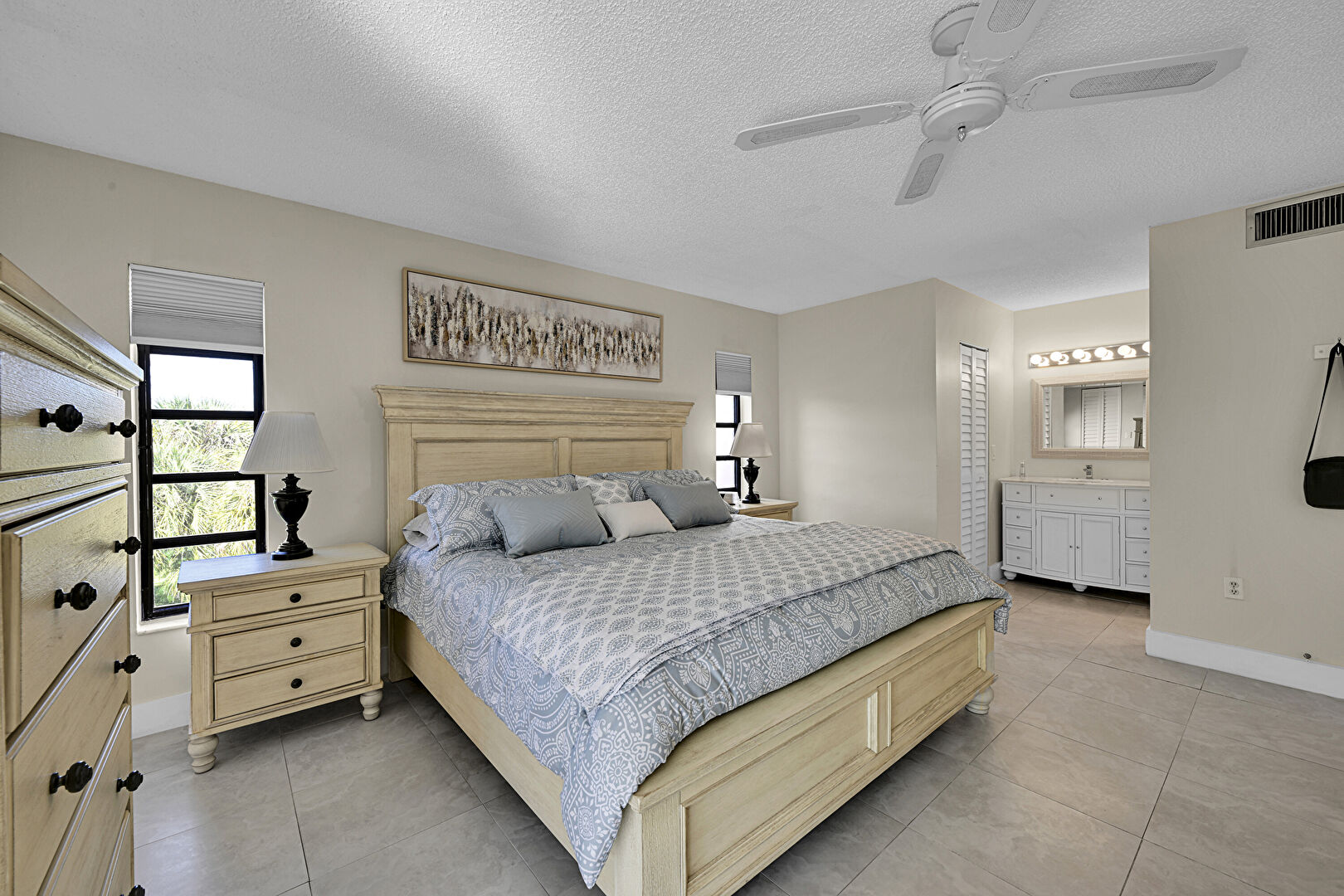 Access To Exterior, Baseboards Wall, Ceiling Fan, Drywall, Ensuite Bathroom, Natural Light, Textured Ceiling, Tile Floor, Vent, Drywall, Natural Light, Tile Floor