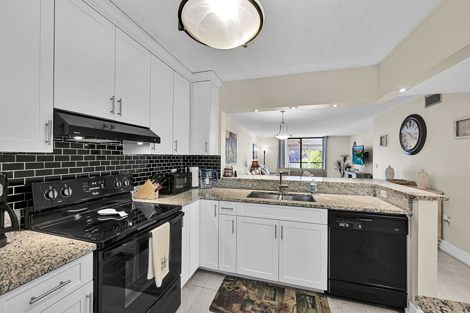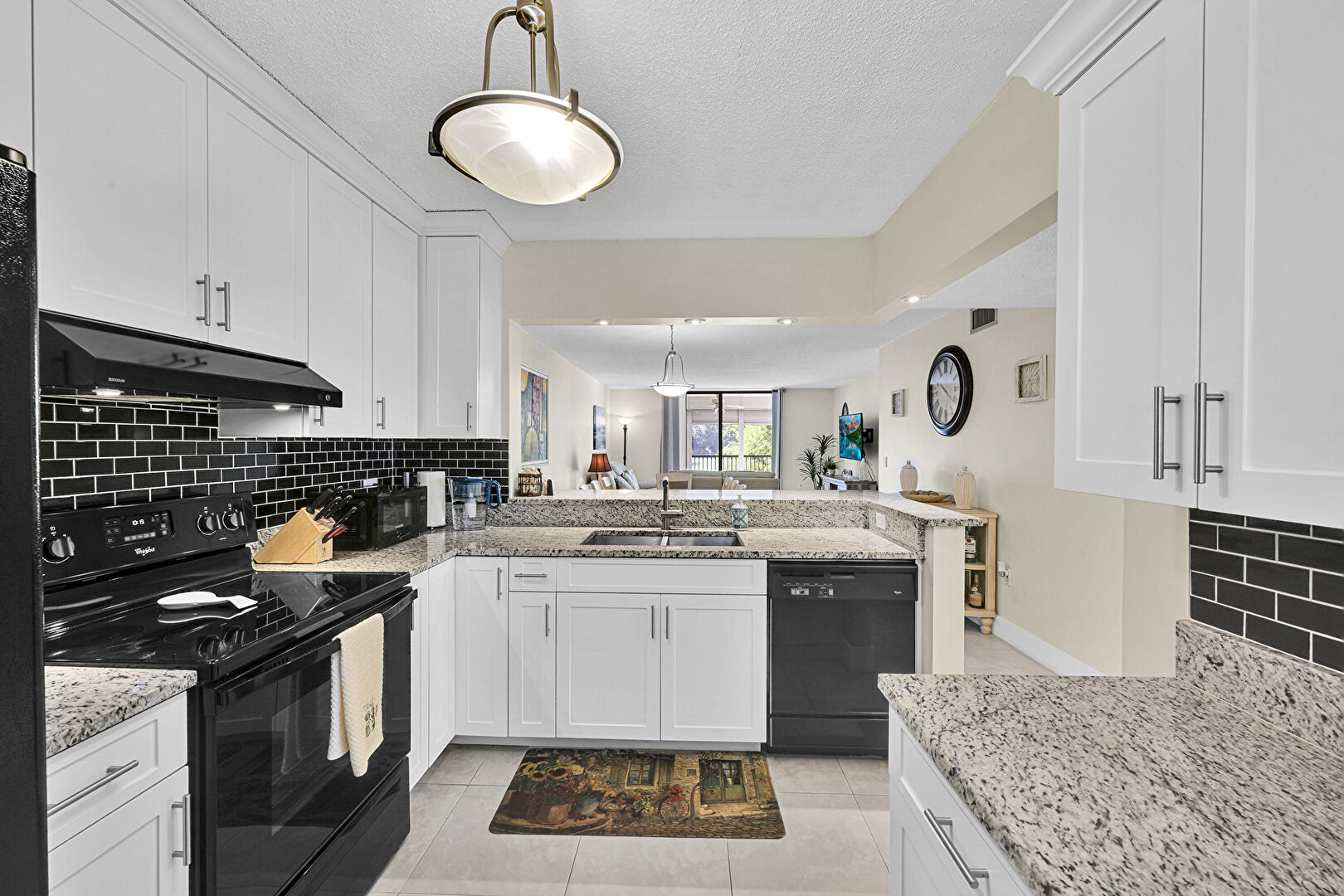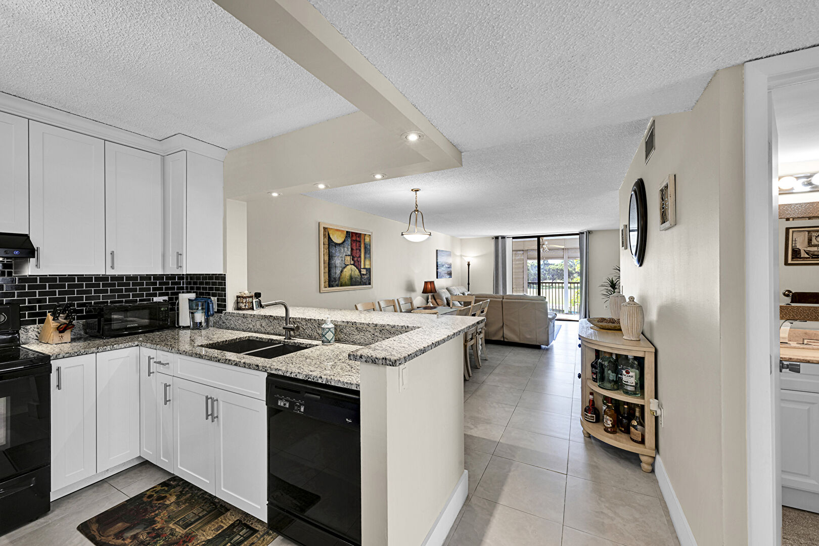 Baseboards Wall, Crown Molding Cabinets, Drywall, Floor Ceiling Windows, Kitchen Bar, Kitchen Peninsula, Natural Light, Opens To Living Area, Pass Through Window, Pendant Lighting, Recessed Lighting, Shaker Cabinets, Stone Countertops, Textured Ceiling, Tile Floor, Toaster, U Shaped Kitchen, Vent, Wine Cooler, Drywall, Kitchen Peninsula, Natural Light, Pendant Lighting, Recessed Lighting, Shaker Cabinets, Toaster, U Shaped Kitchen