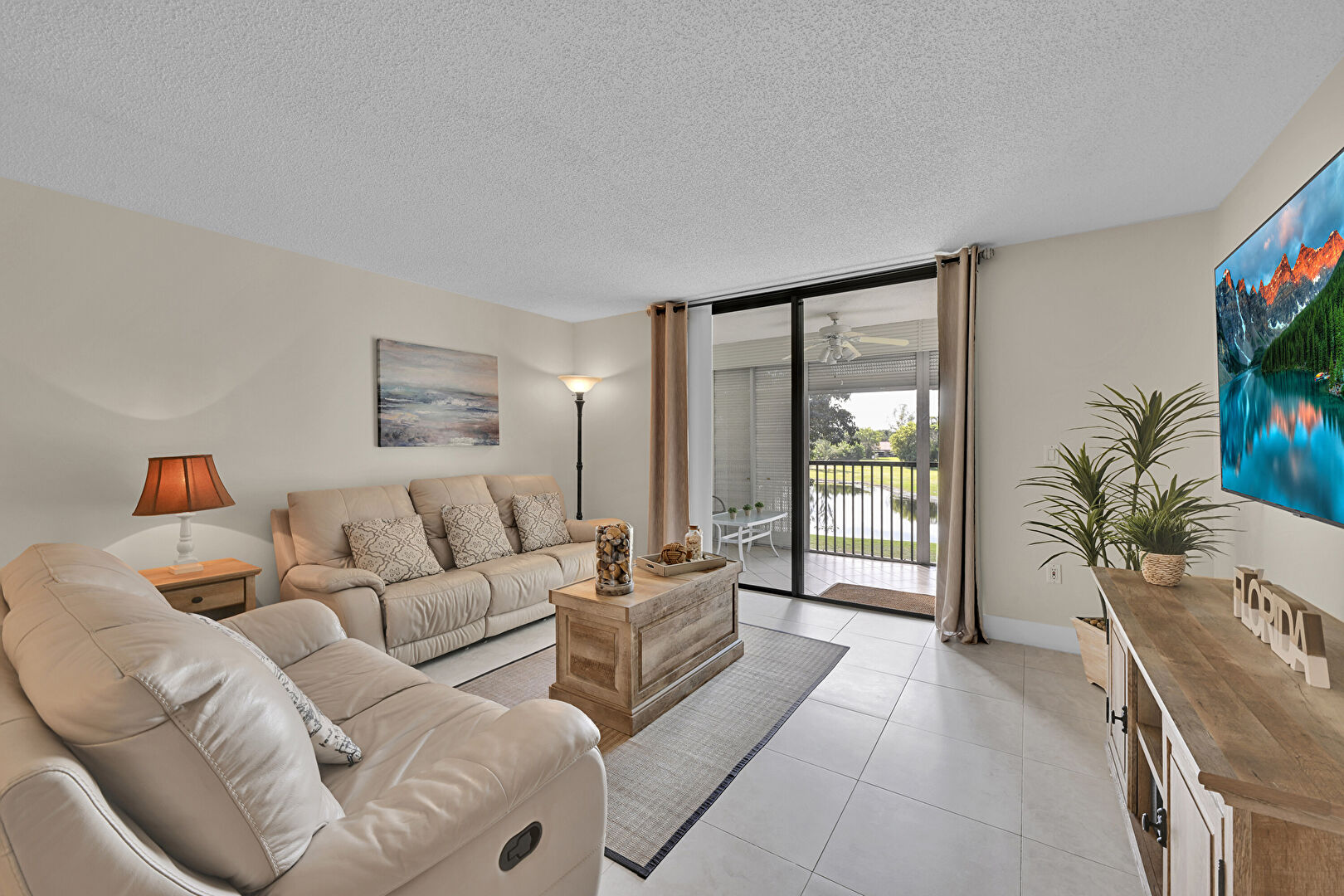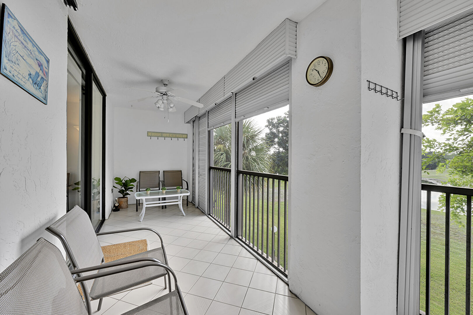 Balcony, Ceiling Fan, Drywall, Natural Light, Sunroom, Tile Floor, Water View, Waterfront, Natural Light, Textured Wall, Tile Floor