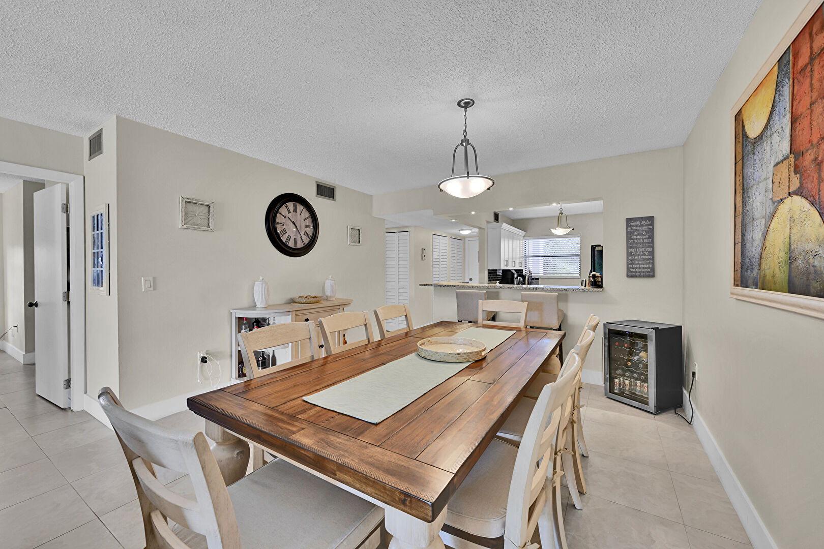 Baseboards Wall, Drop Ceiling, Drywall, Floor Ceiling Windows, Natural Light, Textured Ceiling, Tile Floor, Vent, Wine Cooler, Baseboards Wall, Drywall, L Shaped Kitchen, Textured Ceiling