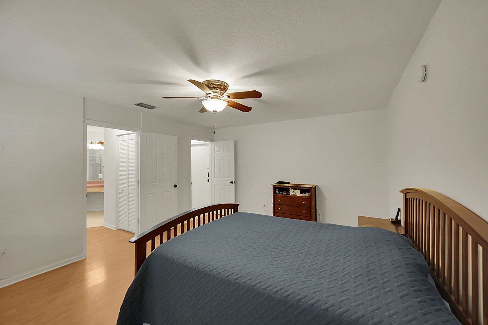 Baseboards Wall, Ceiling Fan, Closet, Drywall, Ensuite Bathroom, Natural Light, Textured Ceiling, Vent, Wood Finish Floor, Ceiling Fan, Natural Light, Textured Ceiling
