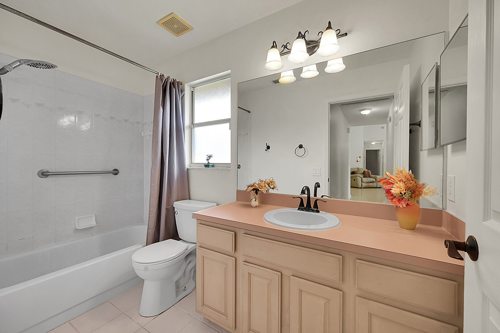 Combined Bath Shower, Drywall, Full Bathroom, Natural Light, Tile Floor, Vanity, Vent