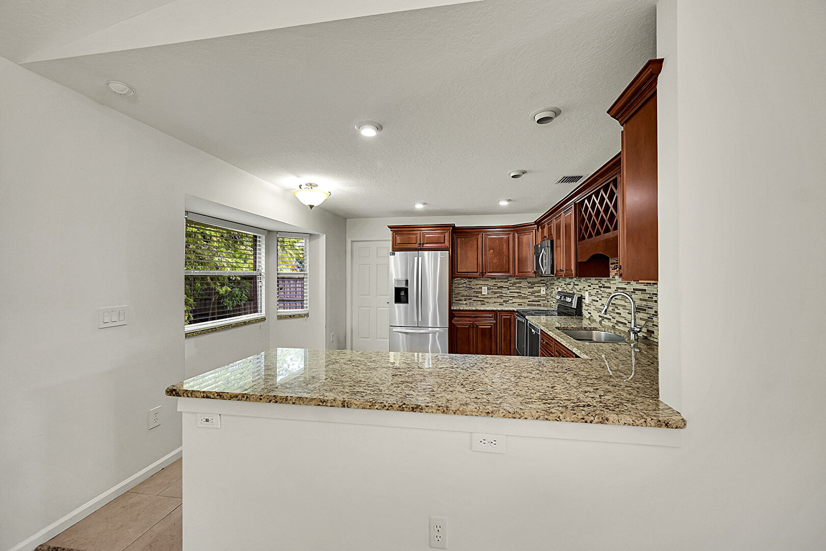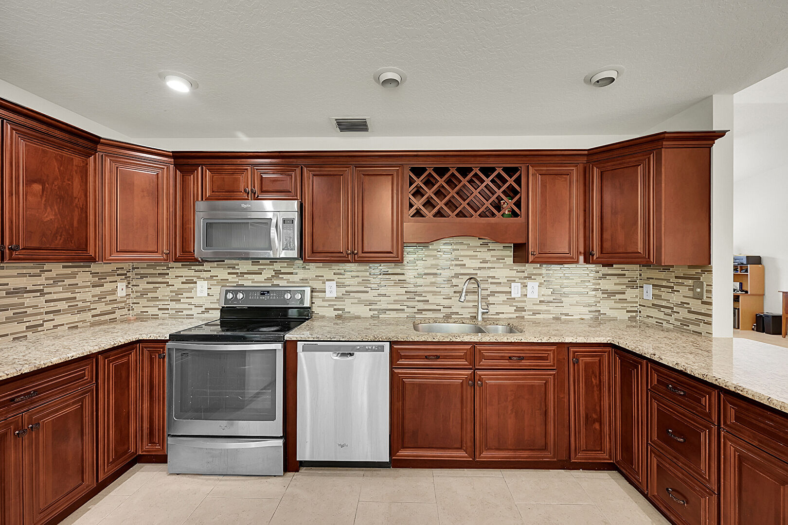 Baseboards Wall, Crown Molding Cabinets, Drywall, Kitchen Peninsula, Medium Brown Cabinets, Natural Light, Notable Chandelier, Pendant Lighting, Raised Cabinets, Recessed Lighting, Reddish Brown Cabinets, Stone Countertops, Textured Ceiling, Tile Floor, U Shaped Kitchen, Vaulted Ceiling, Vent, Drywall, Natural Light, Raised Cabinets, Recessed Lighting, Textured Ceiling