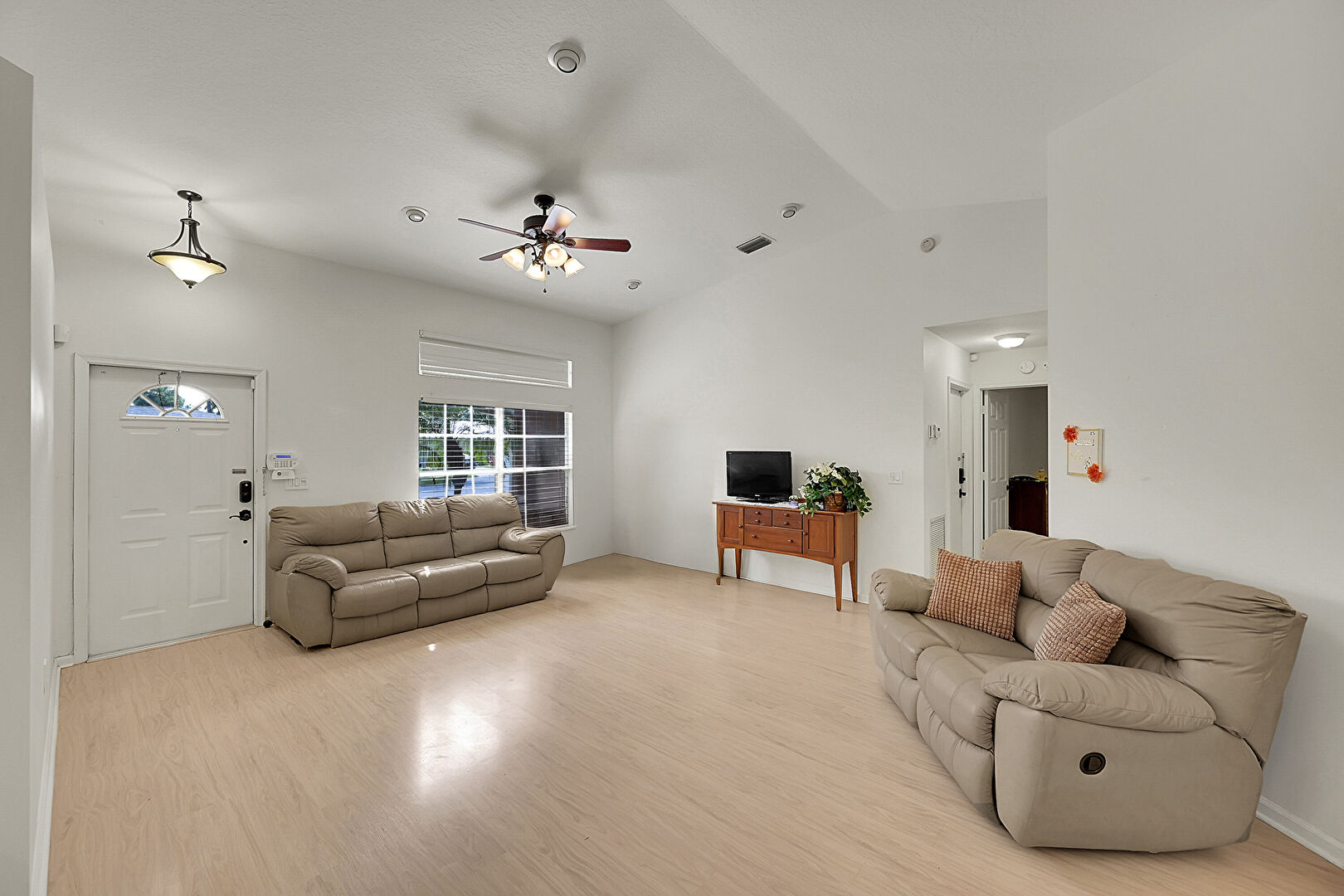 Baseboards Wall, Cathedral Ceiling, Ceiling Fan, Drywall, Natural Light, Office Area, Recessed Lighting, Vaulted Ceiling, Vent, Wood Finish Floor, Cathedral Ceiling, Notable Chandelier