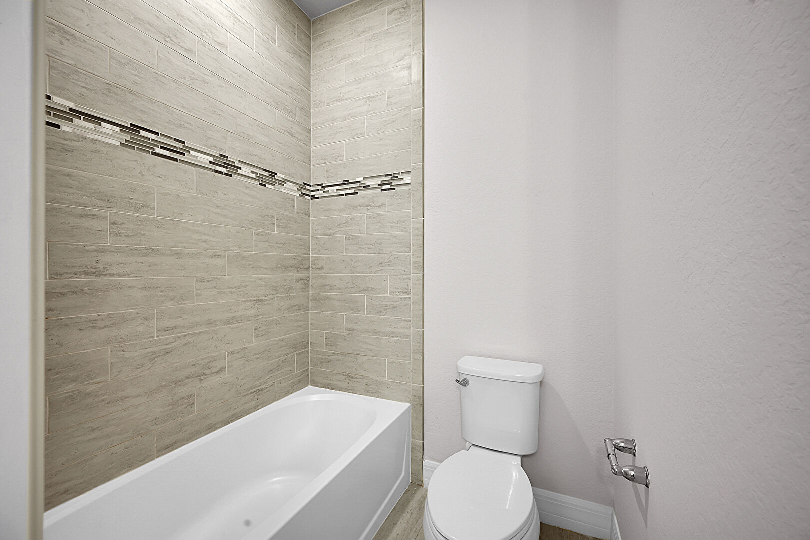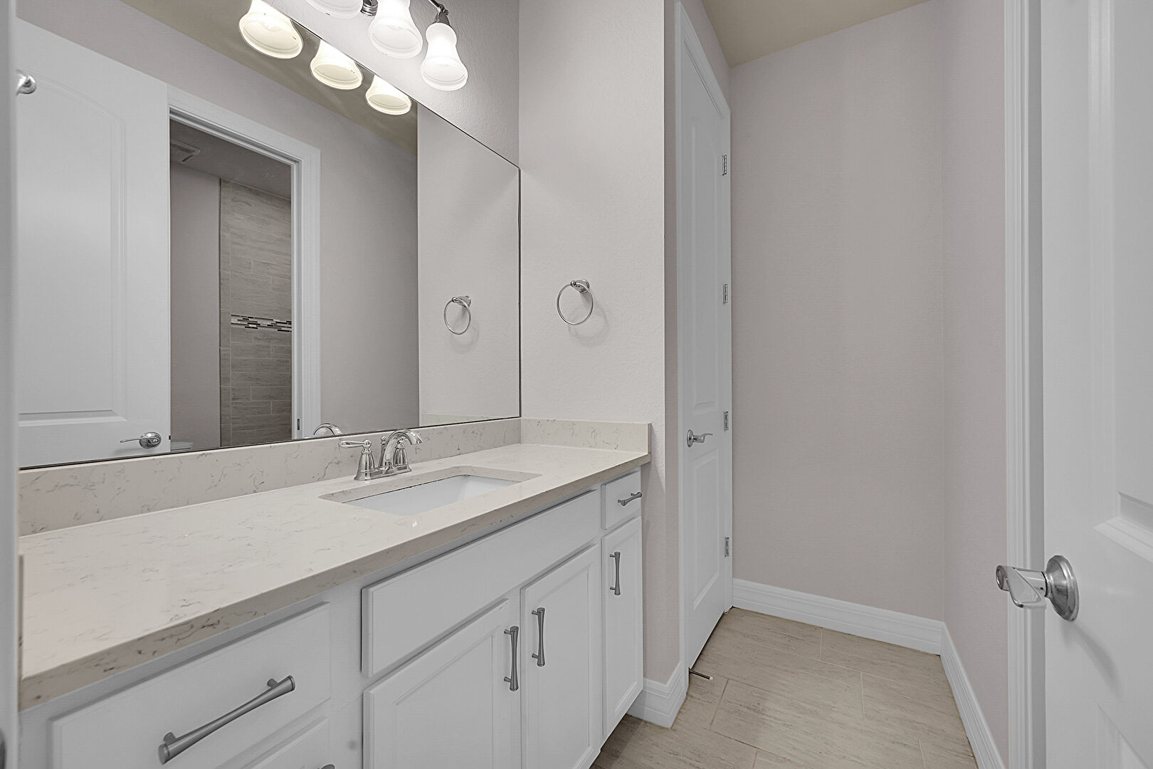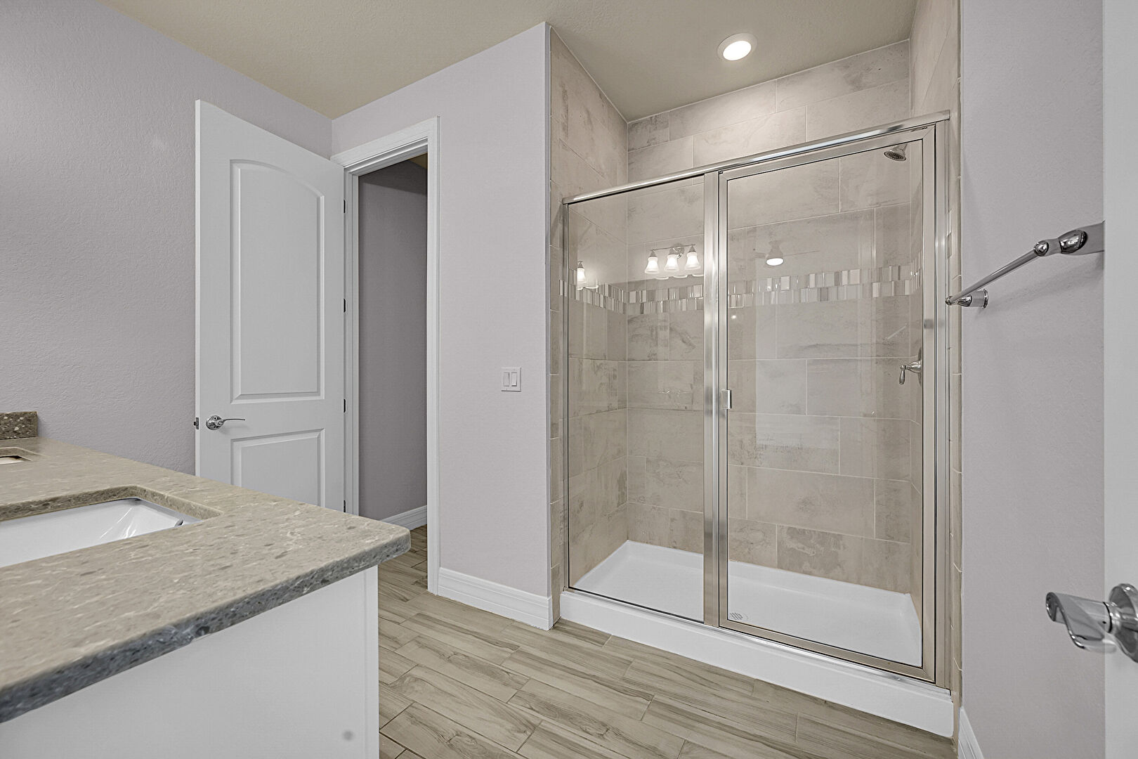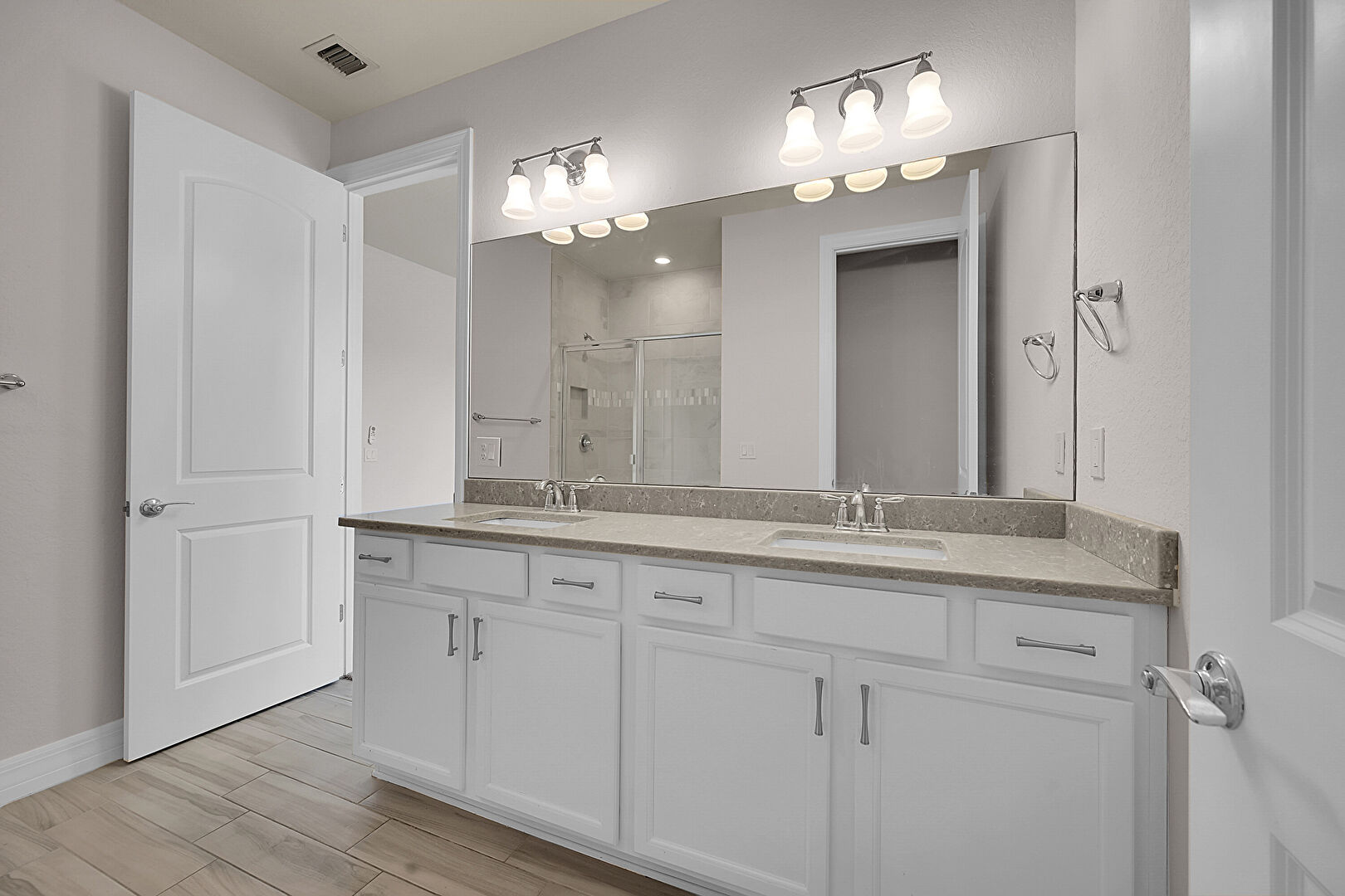 Baseboards Wall, Double Vanity, Drywall, Full Bathroom, Recessed Lighting, Wood Finish Floor, Drywall, Vent