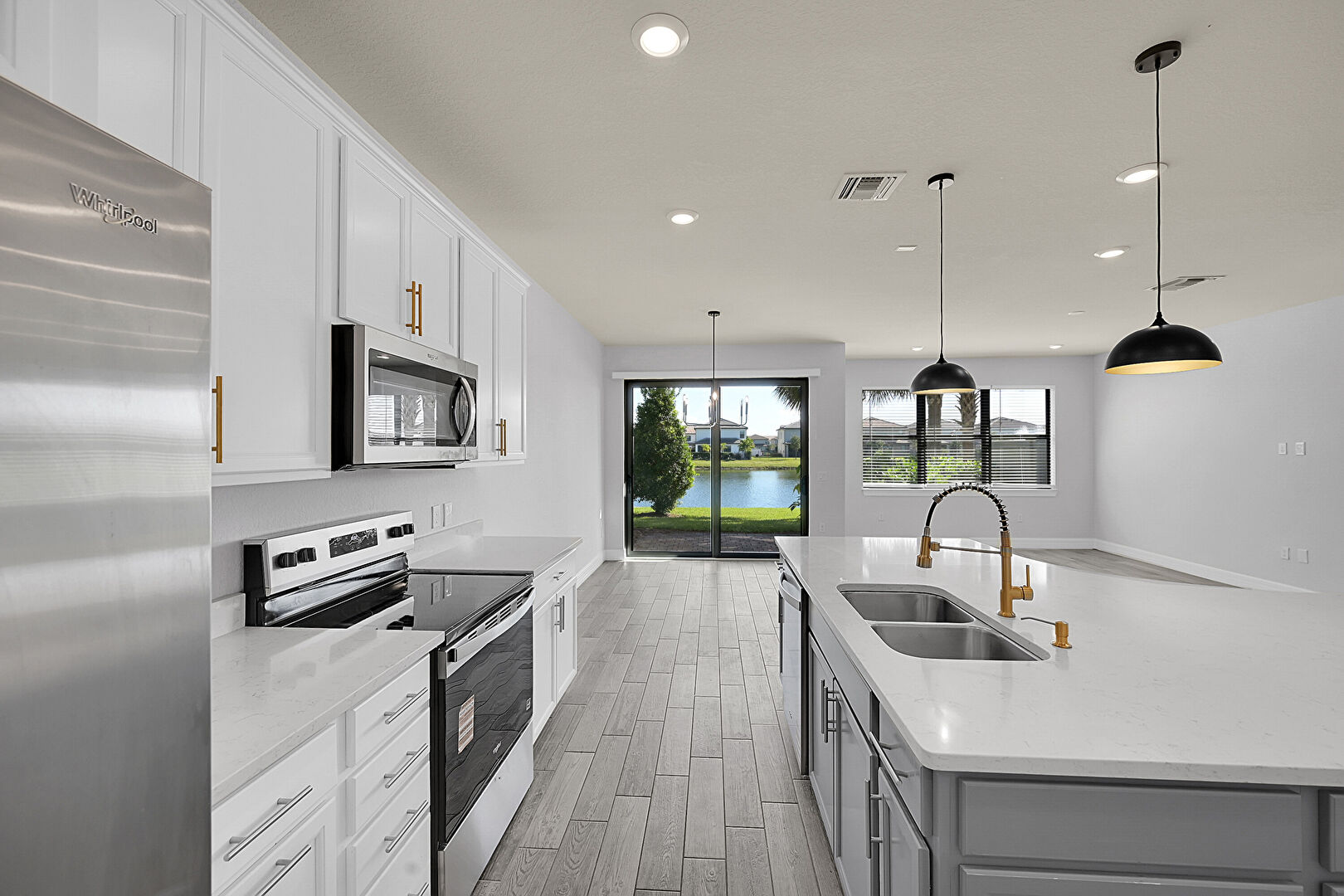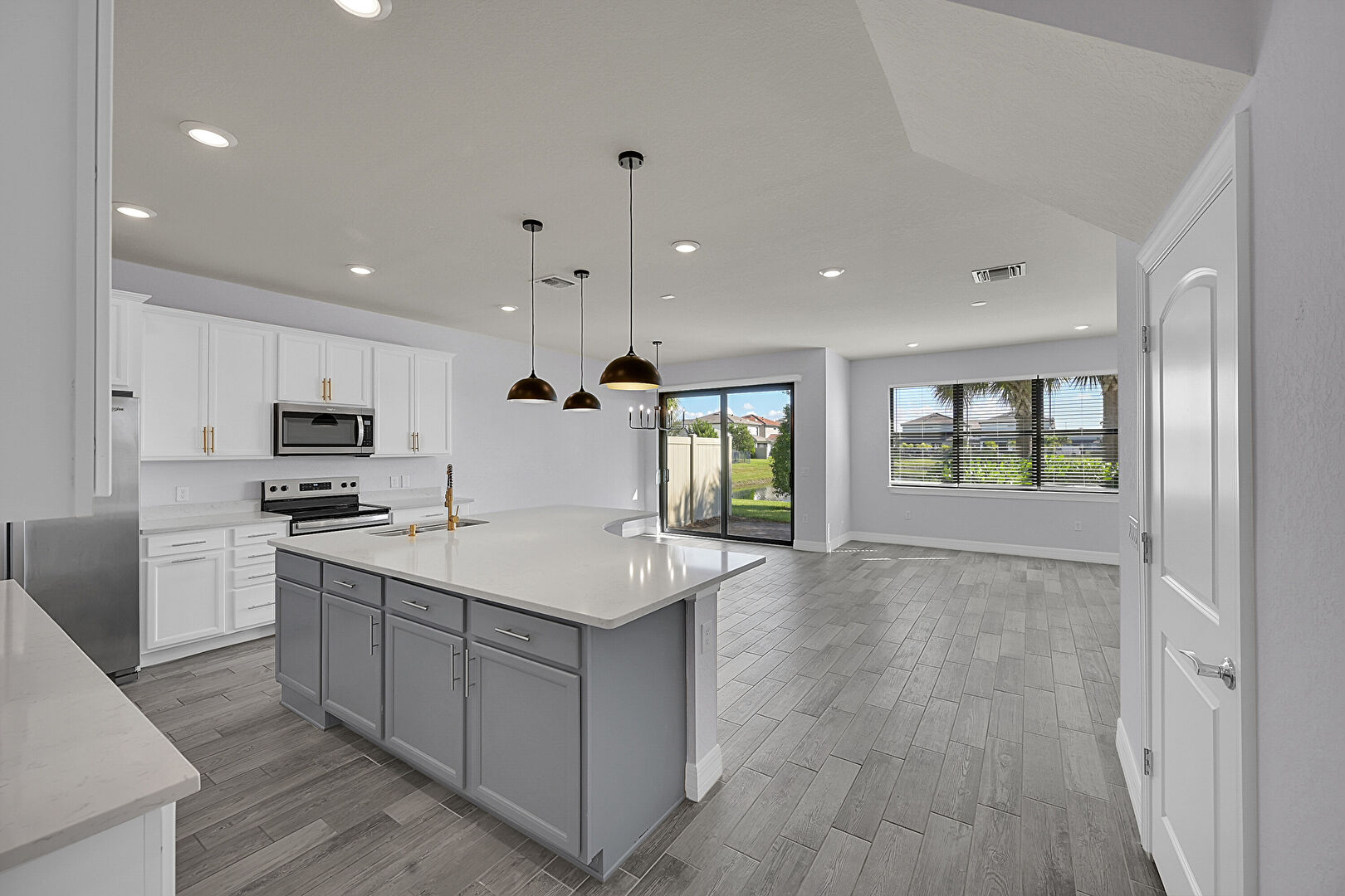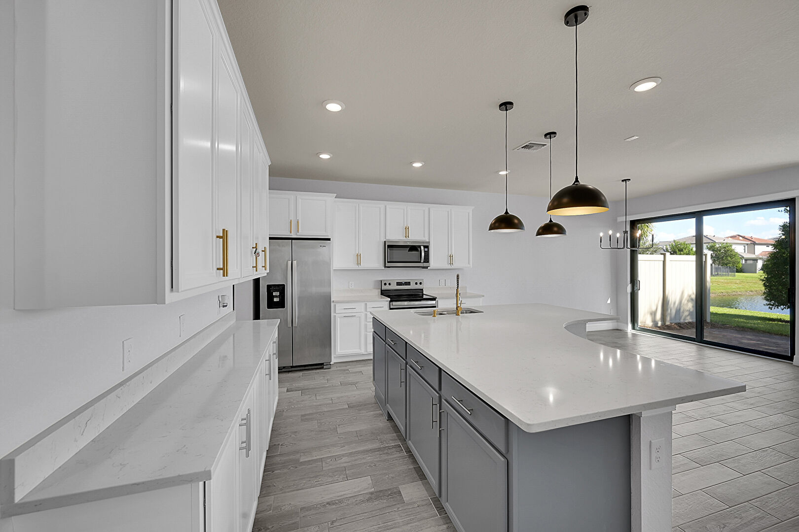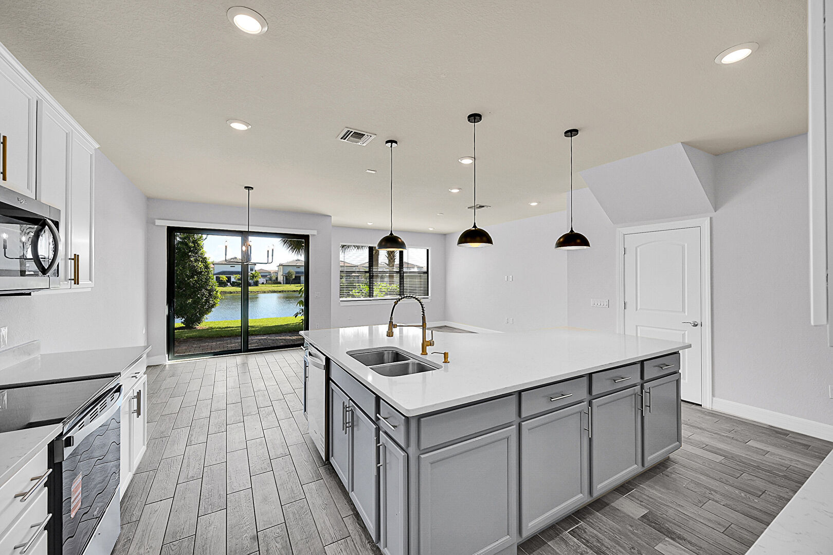 Baseboards Wall, Crown Molding Cabinets, Drywall, Gray Cabinets, Kitchen Island, L Shaped Kitchen, Natural Light, Notable Chandelier, Opens To Living Area, Pendant Lighting, Recessed Lighting, Shaker Cabinets, Stone Countertops, Vent, Water View, Waterfront, Wood Finish Floor, Drywall, Kitchen Bar, Opens To Living Area, Residential View, Vent