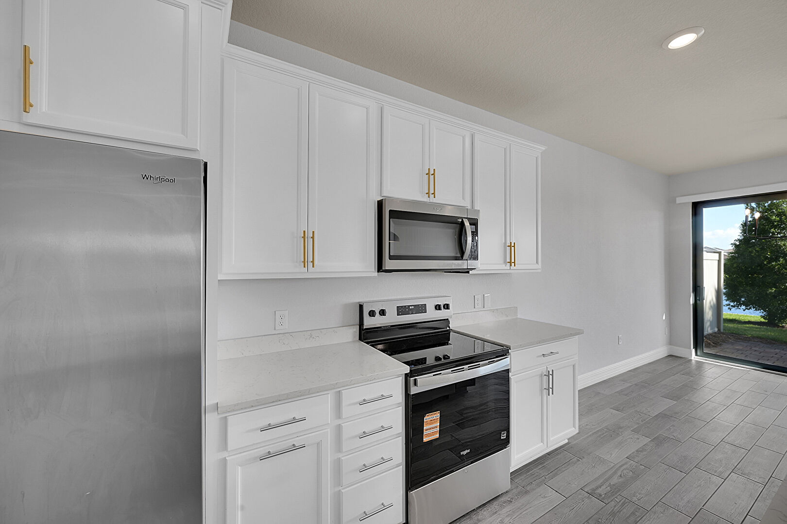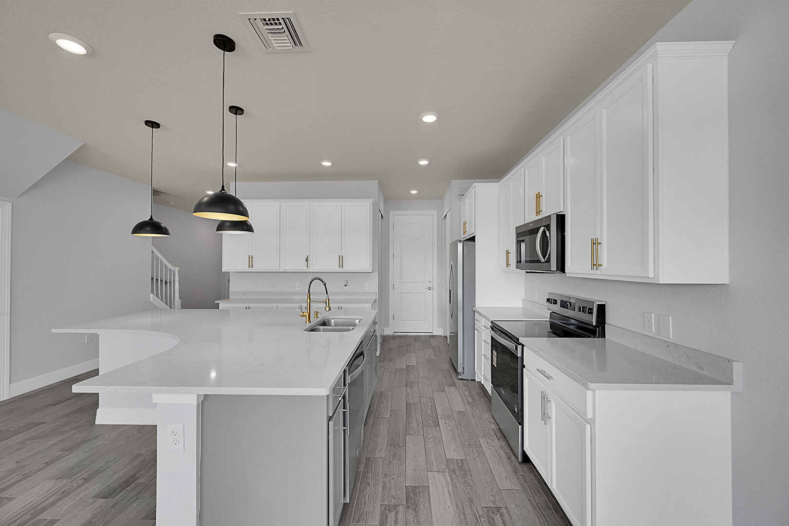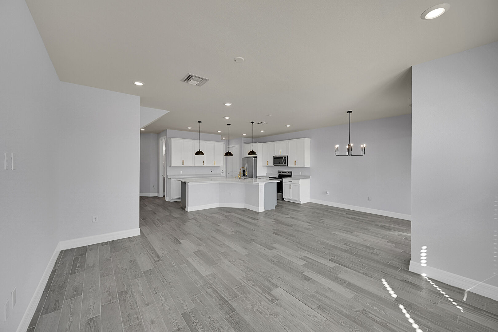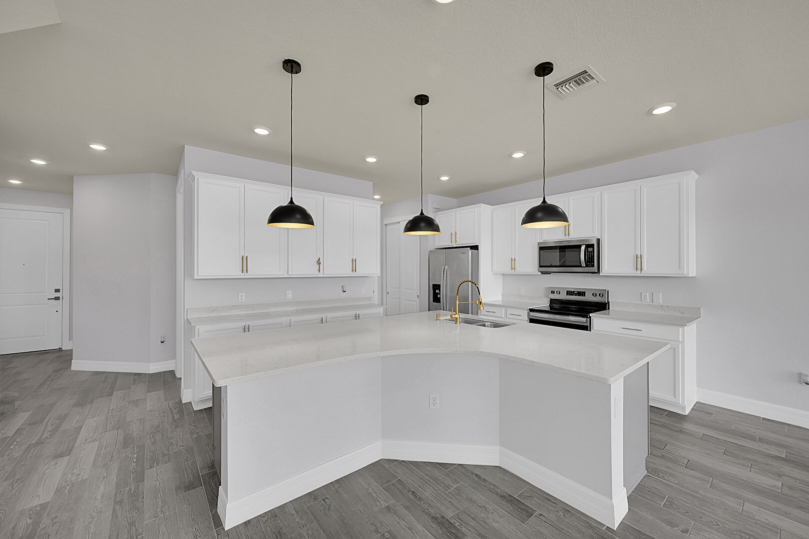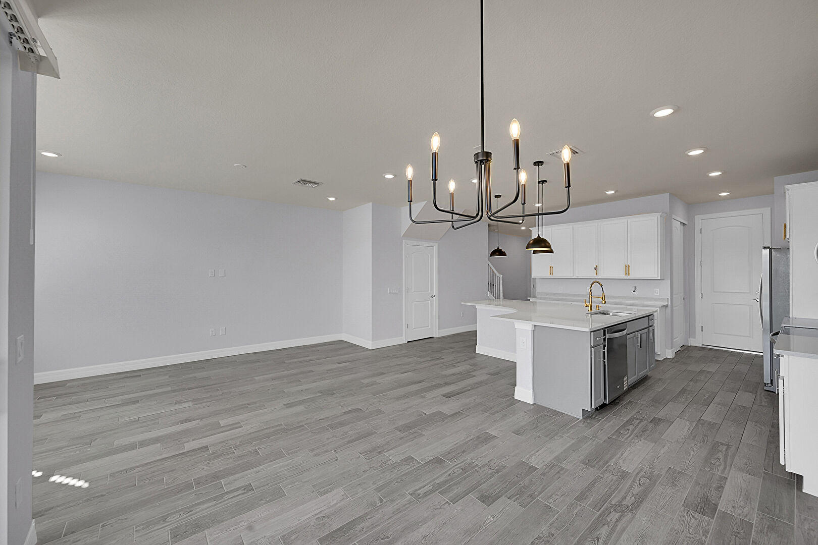 Baseboards Wall, Crown Molding Cabinets, Drywall, Gray Cabinets, Kitchen Island, L Shaped Kitchen, Natural Light, Notable Chandelier, Opens To Living Area, Pendant Lighting, Recessed Lighting, Shaker Cabinets, Stone Countertops, Vent, Water View, Waterfront, Wood Finish Floor, Drywall, Kitchen Bar, Opens To Living Area, Residential View, Vent