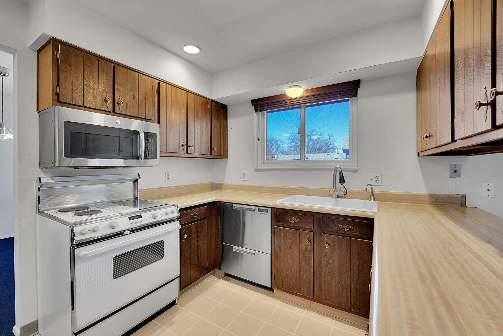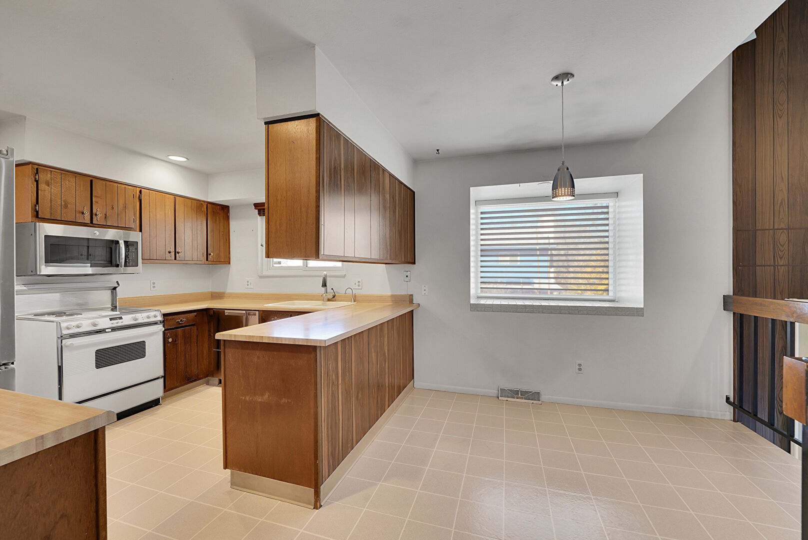 Baseboards Wall, Drywall, Kitchen Peninsula, Medium Brown Cabinets, Natural Light, Pendant Lighting, Recessed Lighting, Tile Floor, Vent, Visible Hinge Cabinets, Wood Wall, Loft, Tile Floor