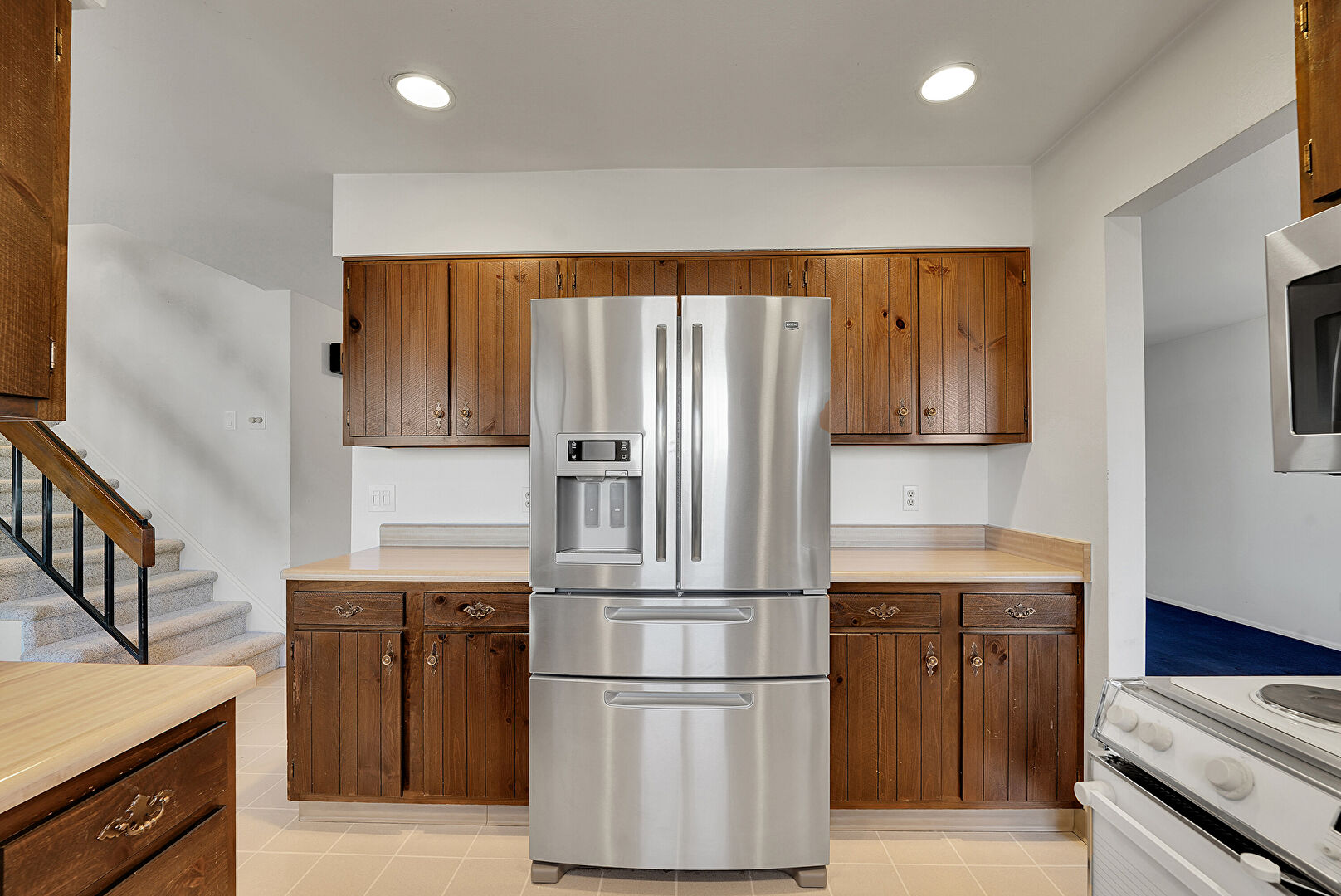 Dark Brown Cabinets, Drywall, Kitchen Peninsula, Medium Brown Cabinets, Natural Light, Recessed Lighting, Tile Floor, Visible Hinge Cabinets, Drywall, Natural Light, Recessed Lighting
