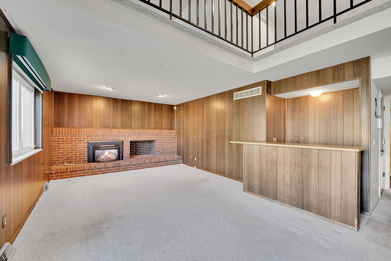 Baseboards Wall, Carpet, Fireplace, High Ceiling, Natural Light, Stairs, Vent, Wood Wall, Carpet, Natural Light