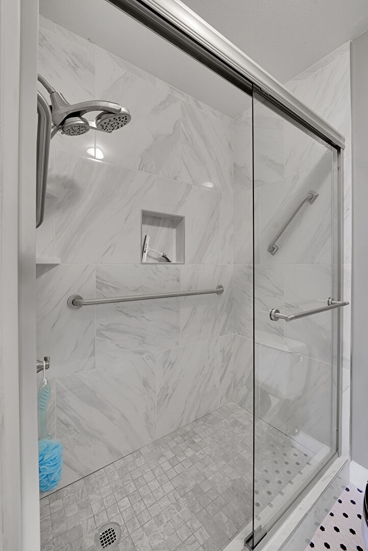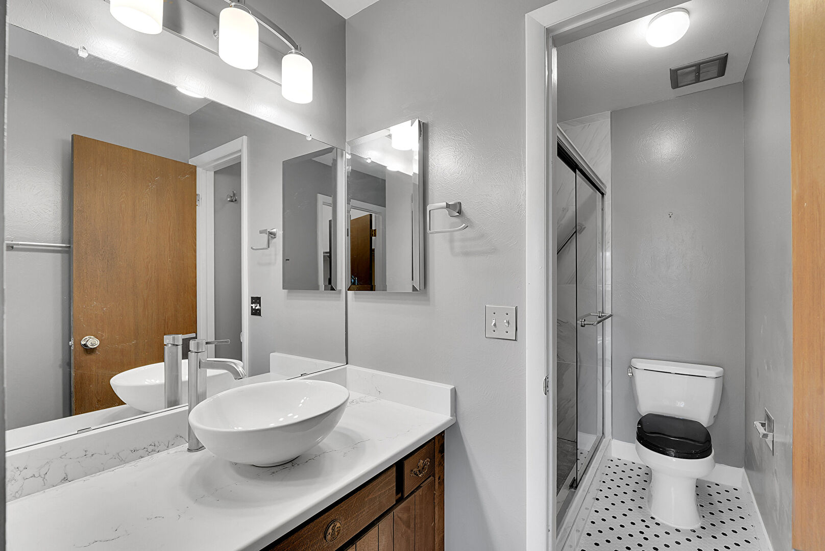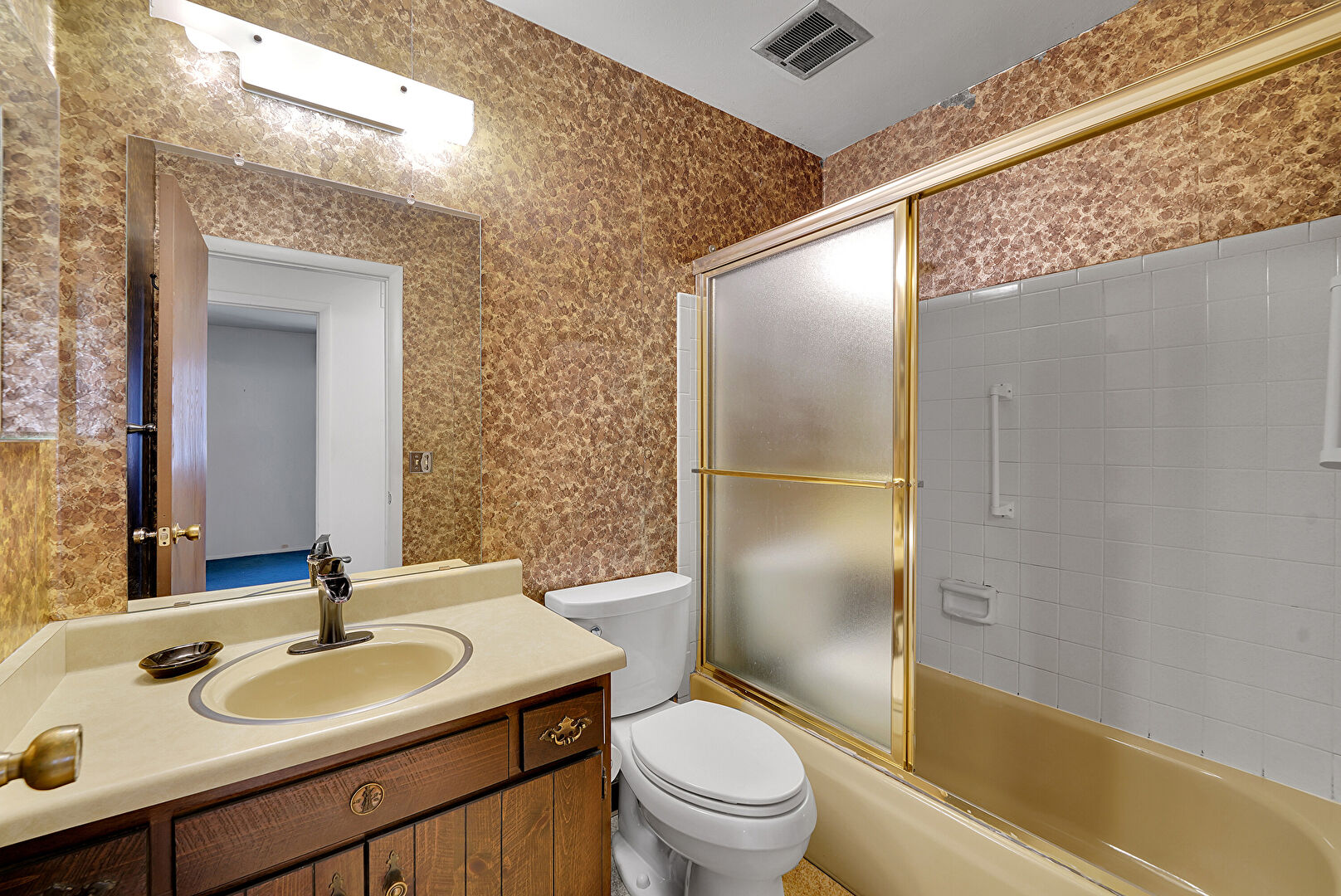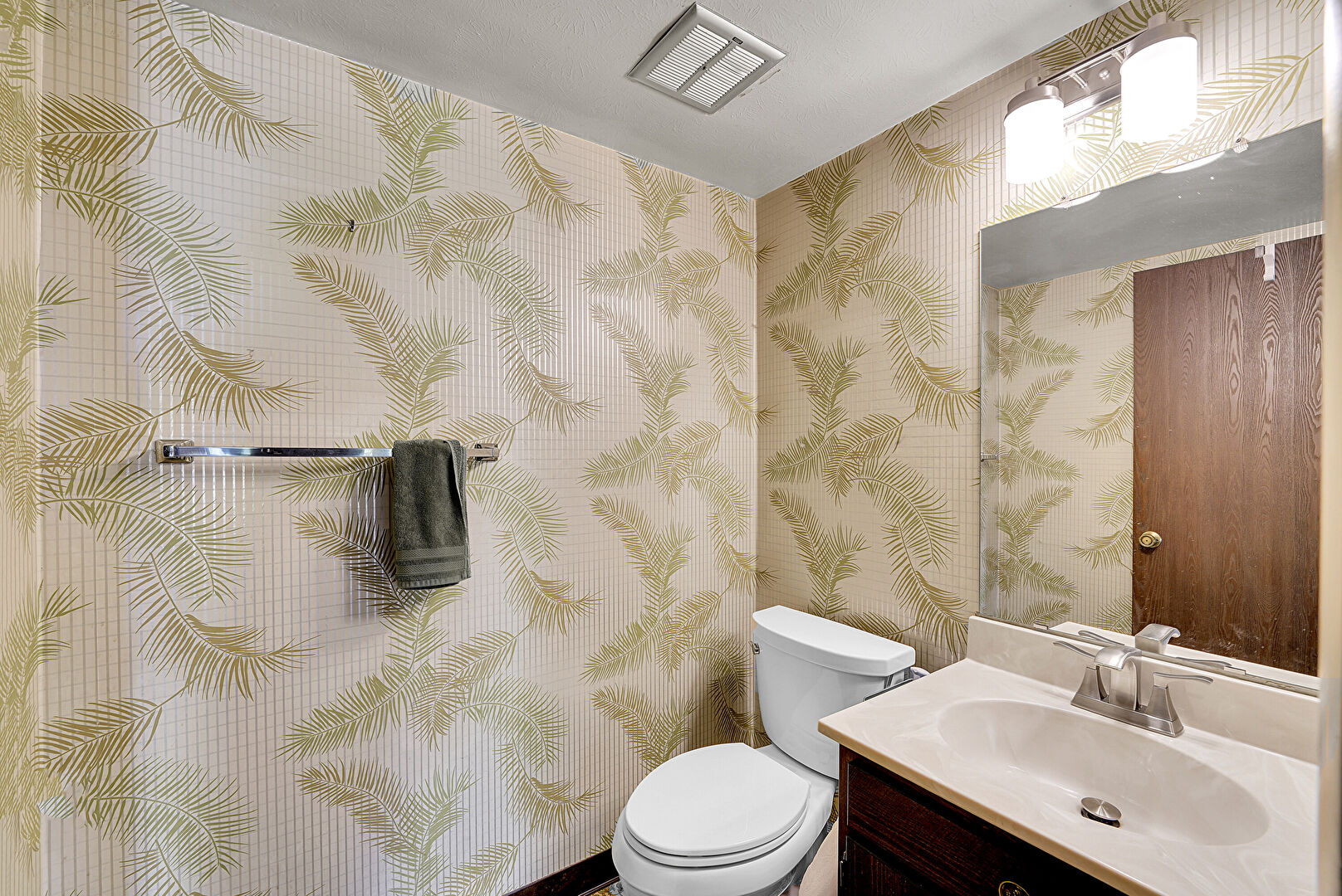 Combined Bath Shower, Full Bathroom, Half Bathroom, Textured Ceiling, Tile Floor, Vanity, Vent, Wallpaper Wall, Vanity, Wallpaper Wall