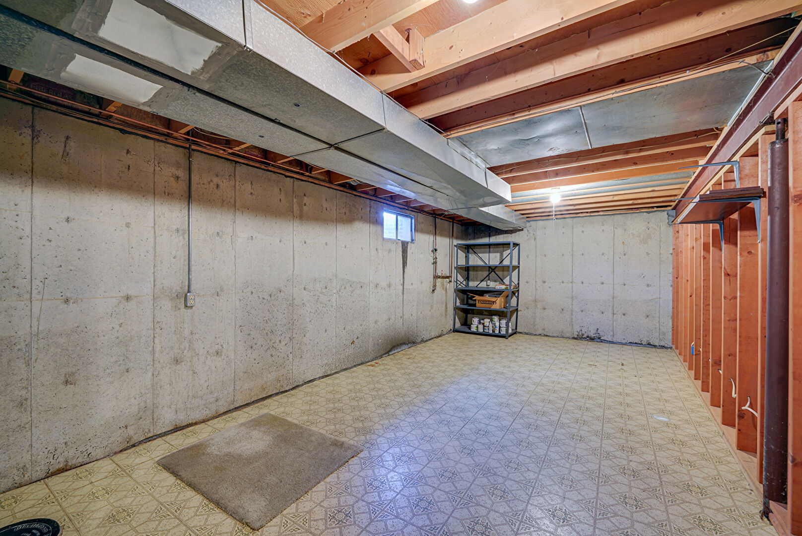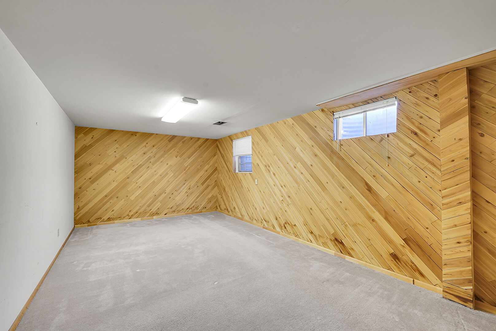 Baseboards Wall, Basement, Carpet, Concrete Foundation, Drywall, Natural Light, Vinyl Floor, Basement, Wood Wall