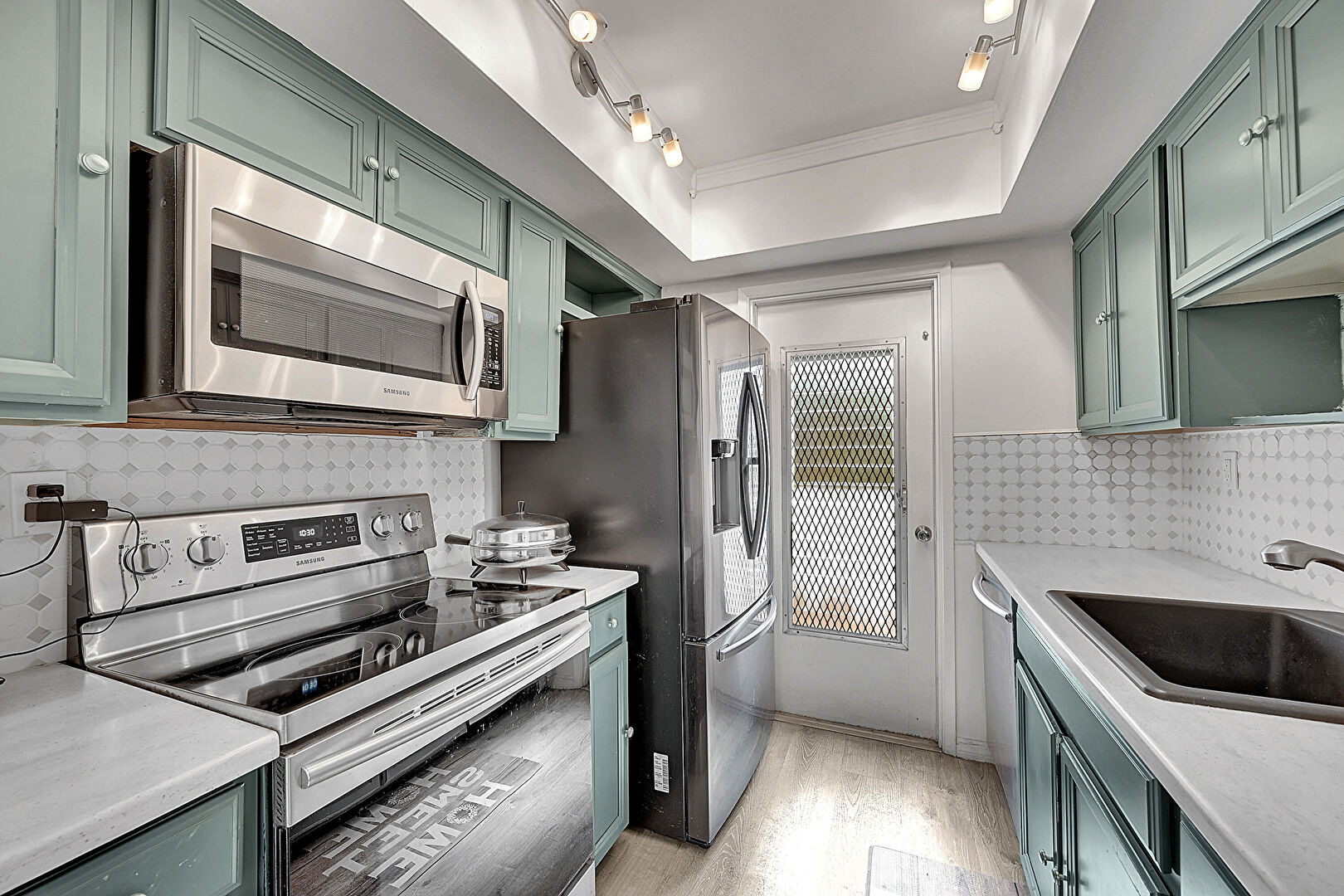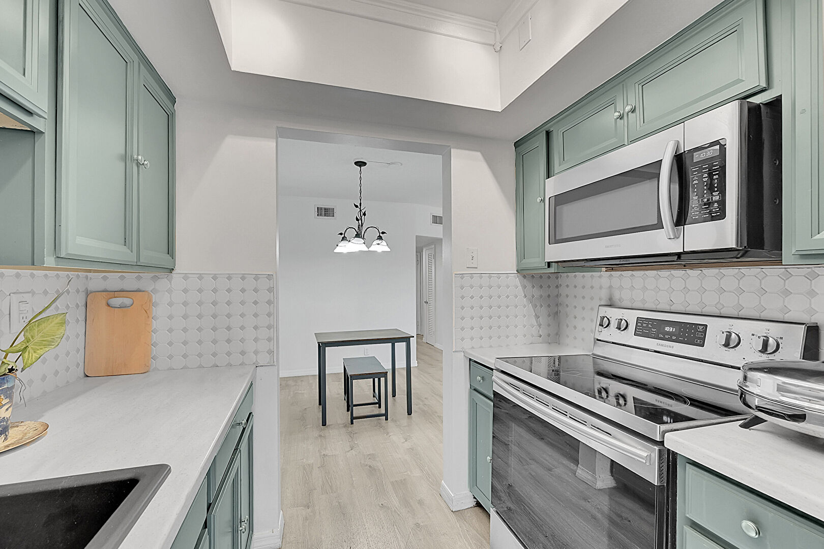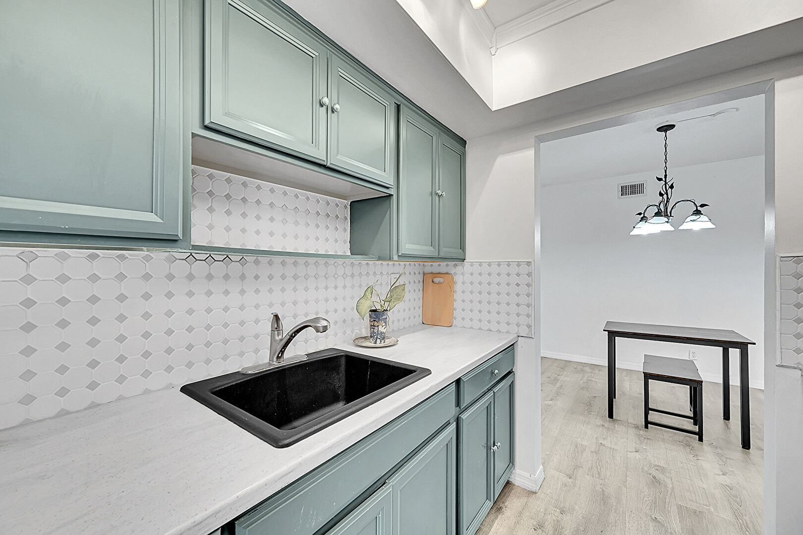 Baseboards Wall, Blue Cabinets, Crown Molding, Drywall, Green Cabinets, Natural Light, Notable Chandelier, Open Shelves, Pendant Lighting, Shaker Cabinets, Stone Countertops, Track Lighting, Tray Ceiling, Vent, Wood Finish Floor, Drywall, Notable Chandelier, Open Shelves, Wood Finish Floor