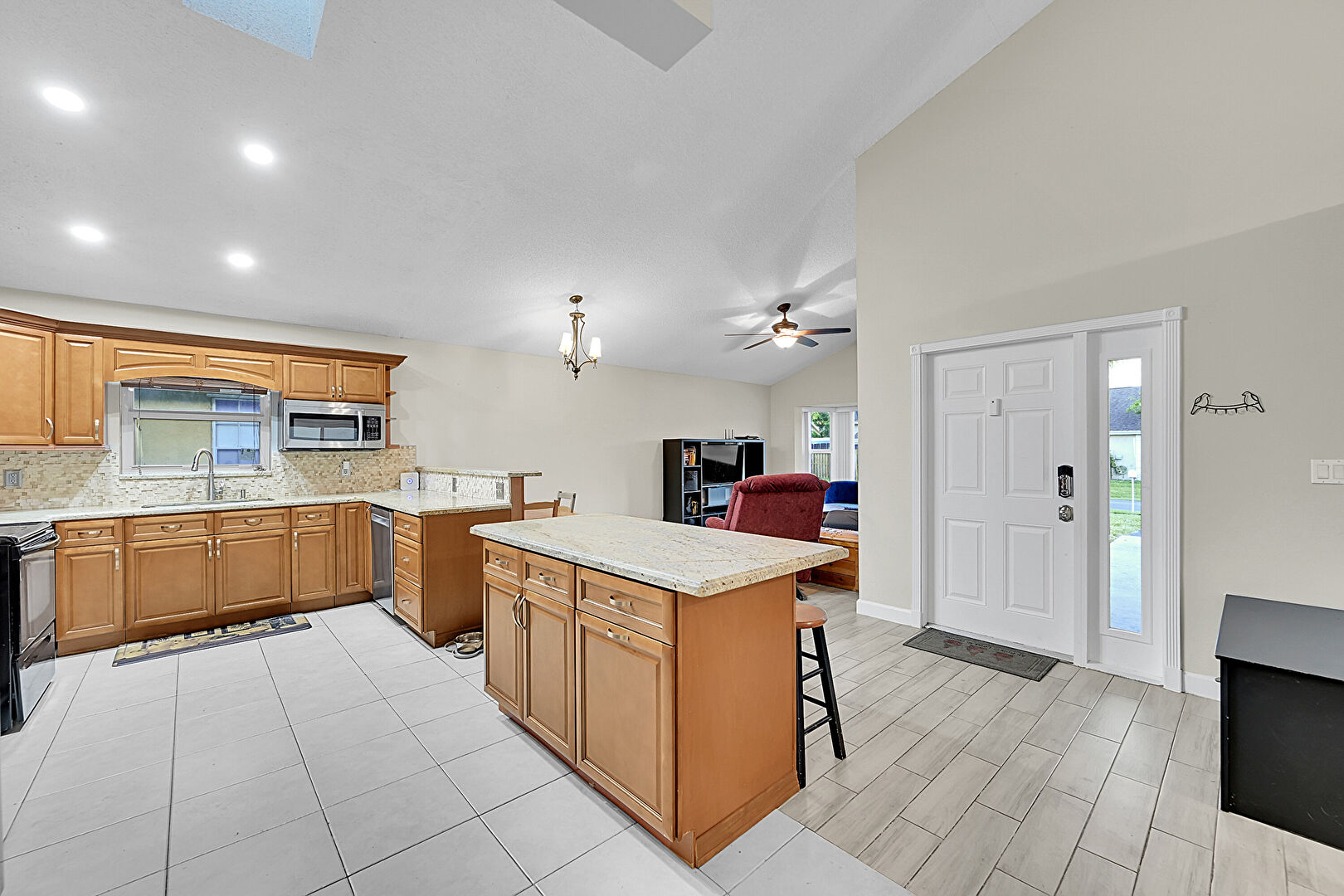 Baseboards Wall, Ceiling Fan, Drywall, High Ceiling, Natural Light, Notable Chandelier, Recessed Lighting, Textured Ceiling, U Shaped Kitchen, Vaulted Ceiling, Vent, Wood Finish Floor, Baseboards Wall, Ceiling Fan, Drywall, High Ceiling