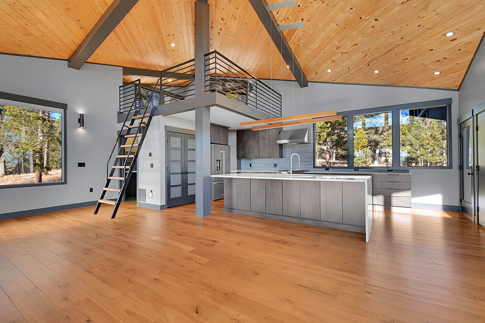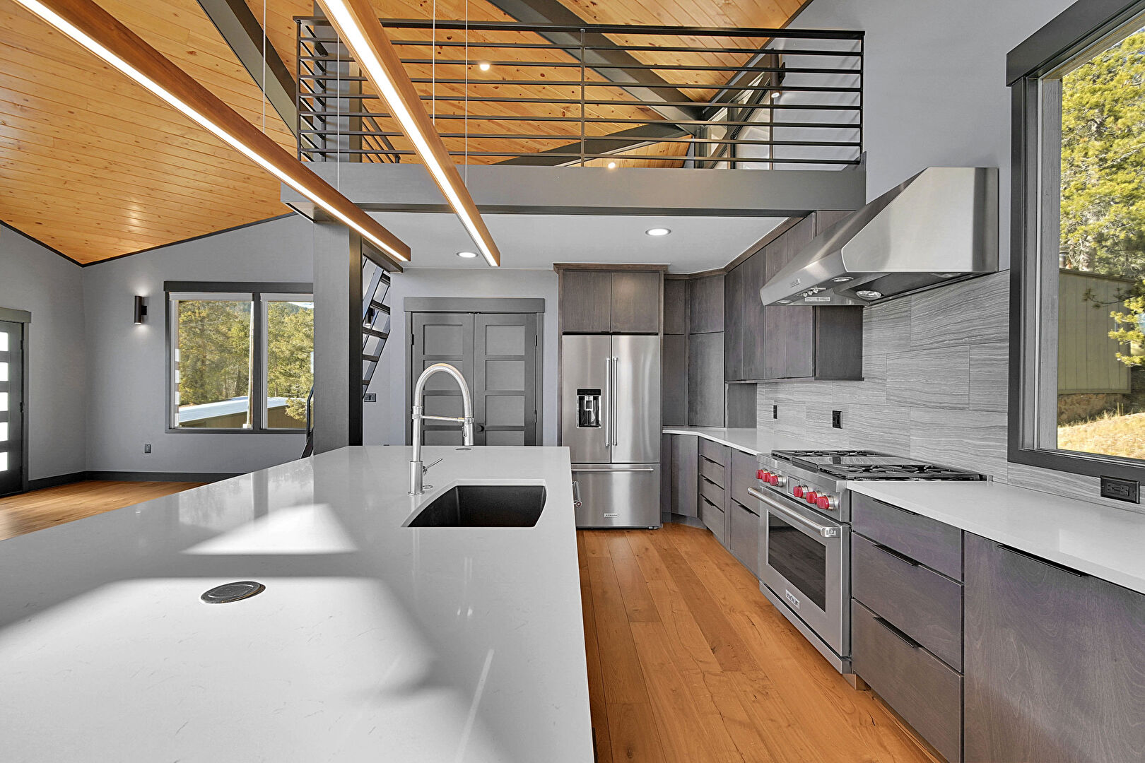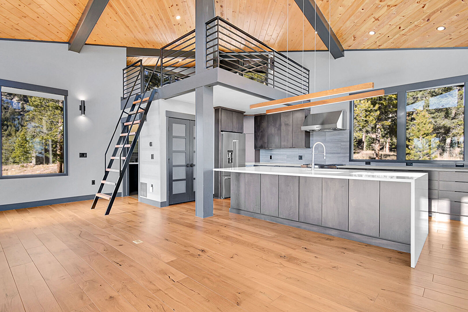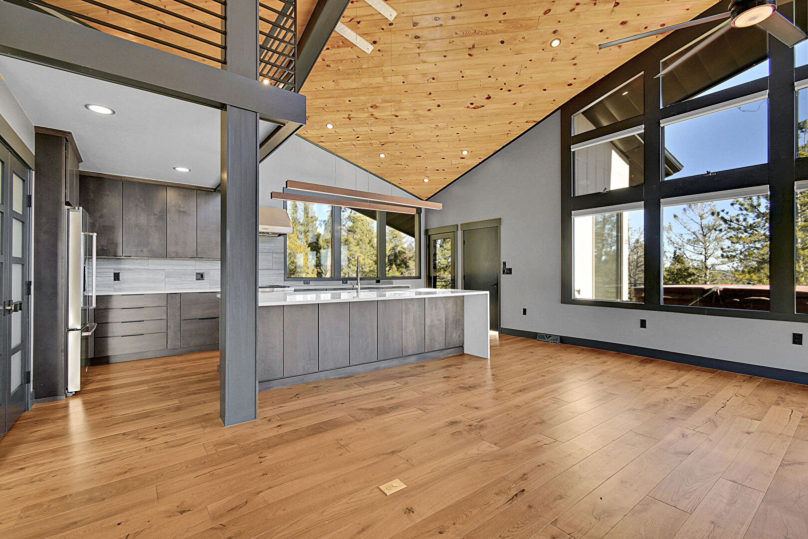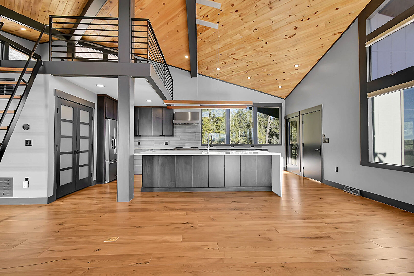 Baseboards Wall, Beamed Ceiling, Ceiling Fan, Drywall, Flat Panel Cabinets, Gray Cabinets, High Ceiling, Mountain View, Natural Light, Recessed Lighting, Stone Countertops, Vaulted Ceiling, Vent, Wood Ceiling, Wood Finish Floor, Vaulted Ceiling, Vent, Wood Finish Floor