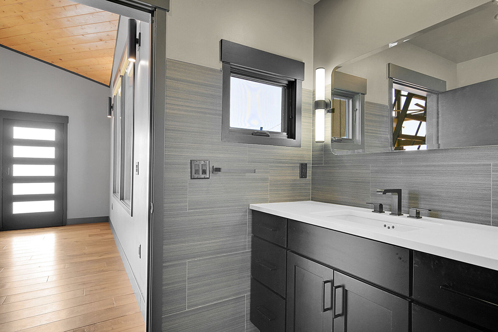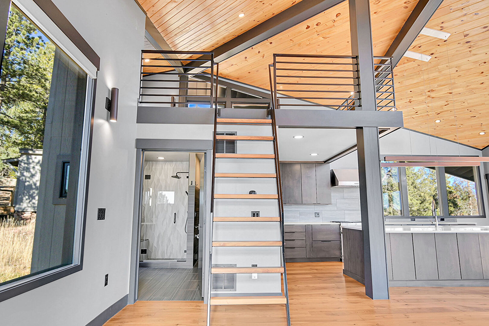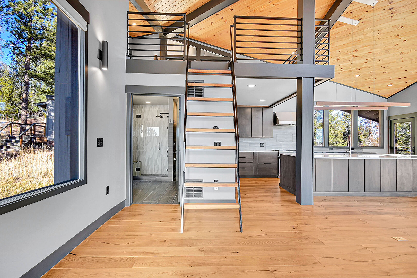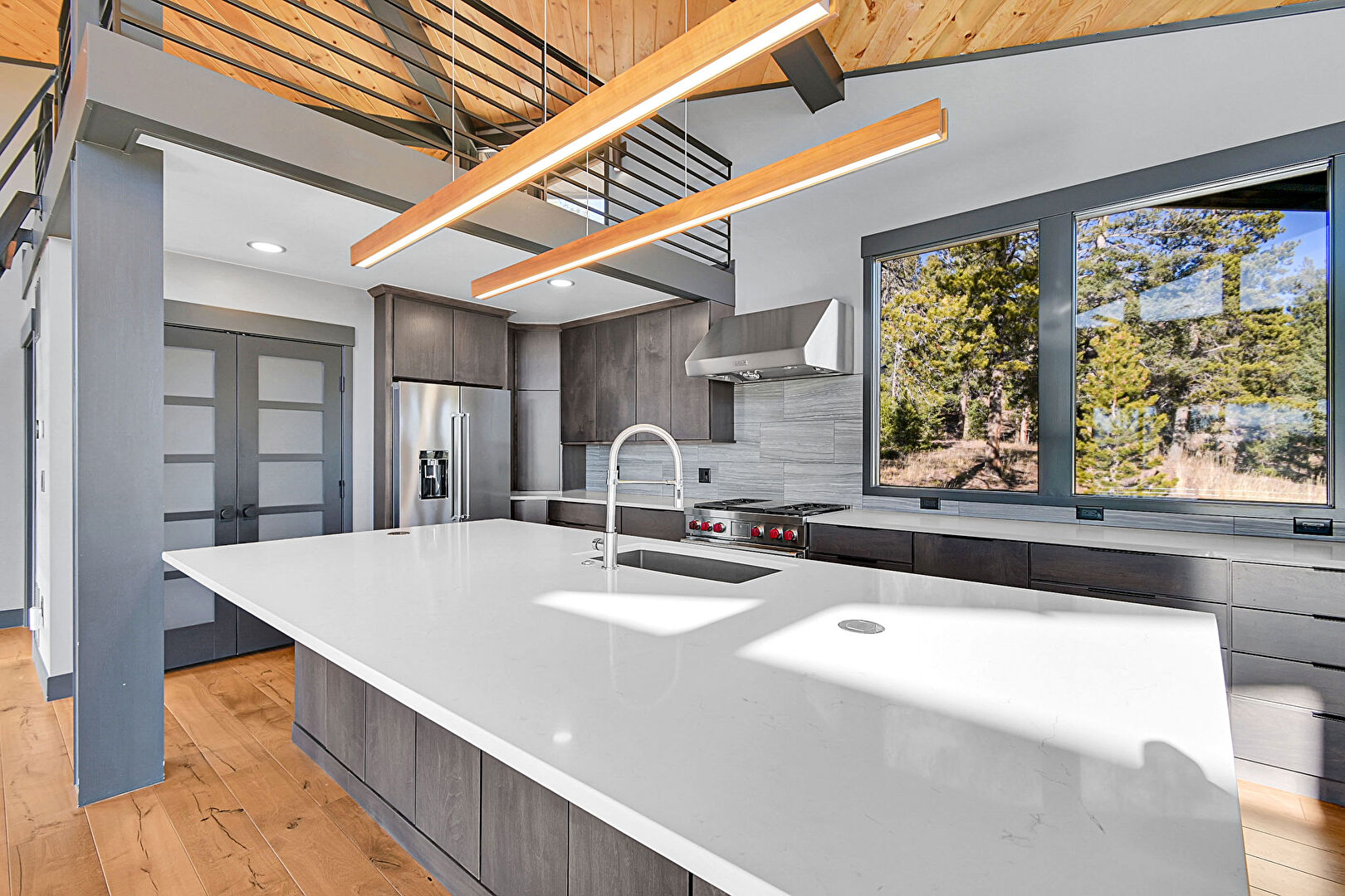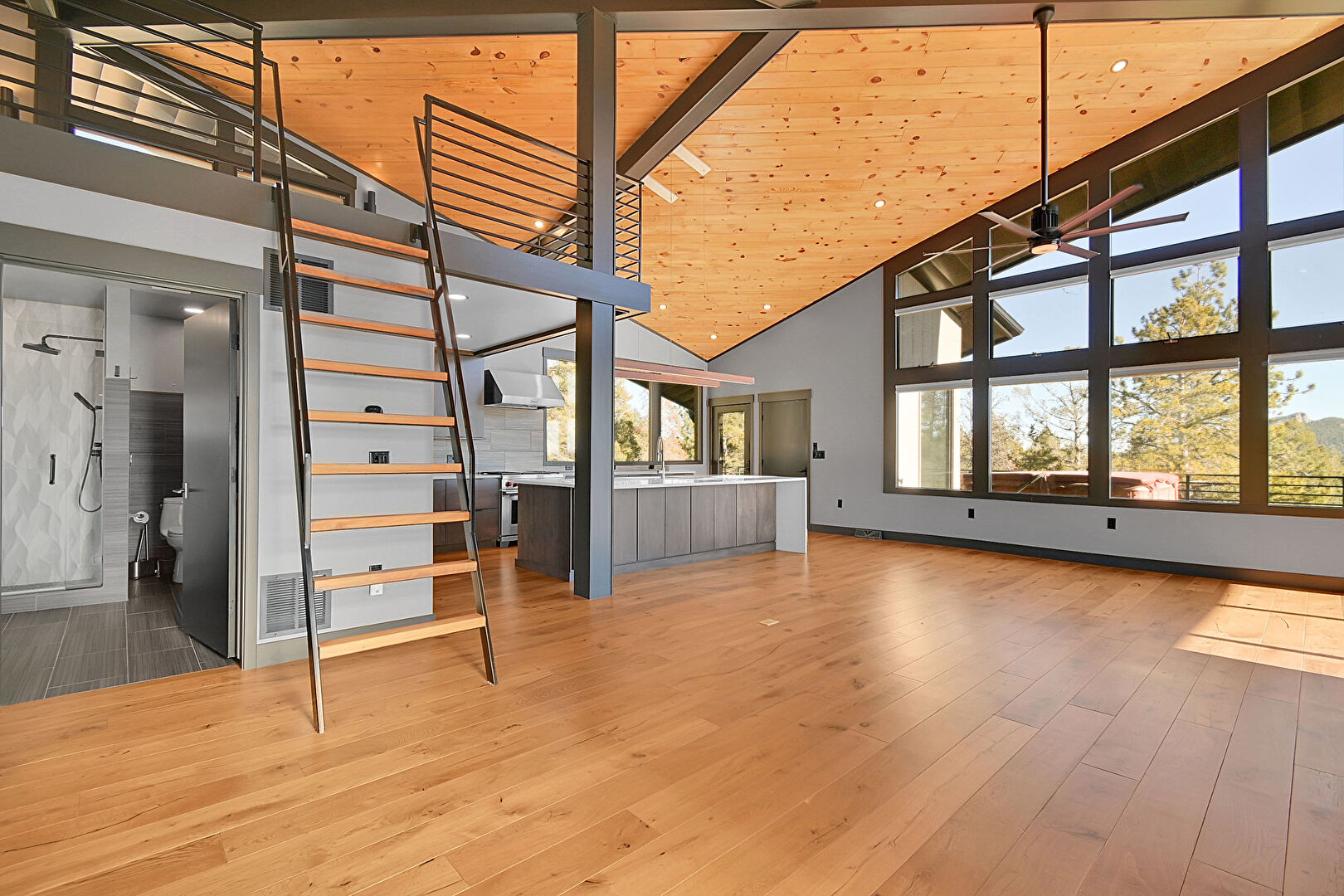 Baseboards Wall, Beamed Ceiling, Ceiling Fan, Drywall, Flat Panel Cabinets, Gray Cabinets, High Ceiling, Mountain View, Natural Light, Recessed Lighting, Stone Countertops, Vaulted Ceiling, Vent, Wood Ceiling, Wood Finish Floor, Vaulted Ceiling, Vent, Wood Finish Floor