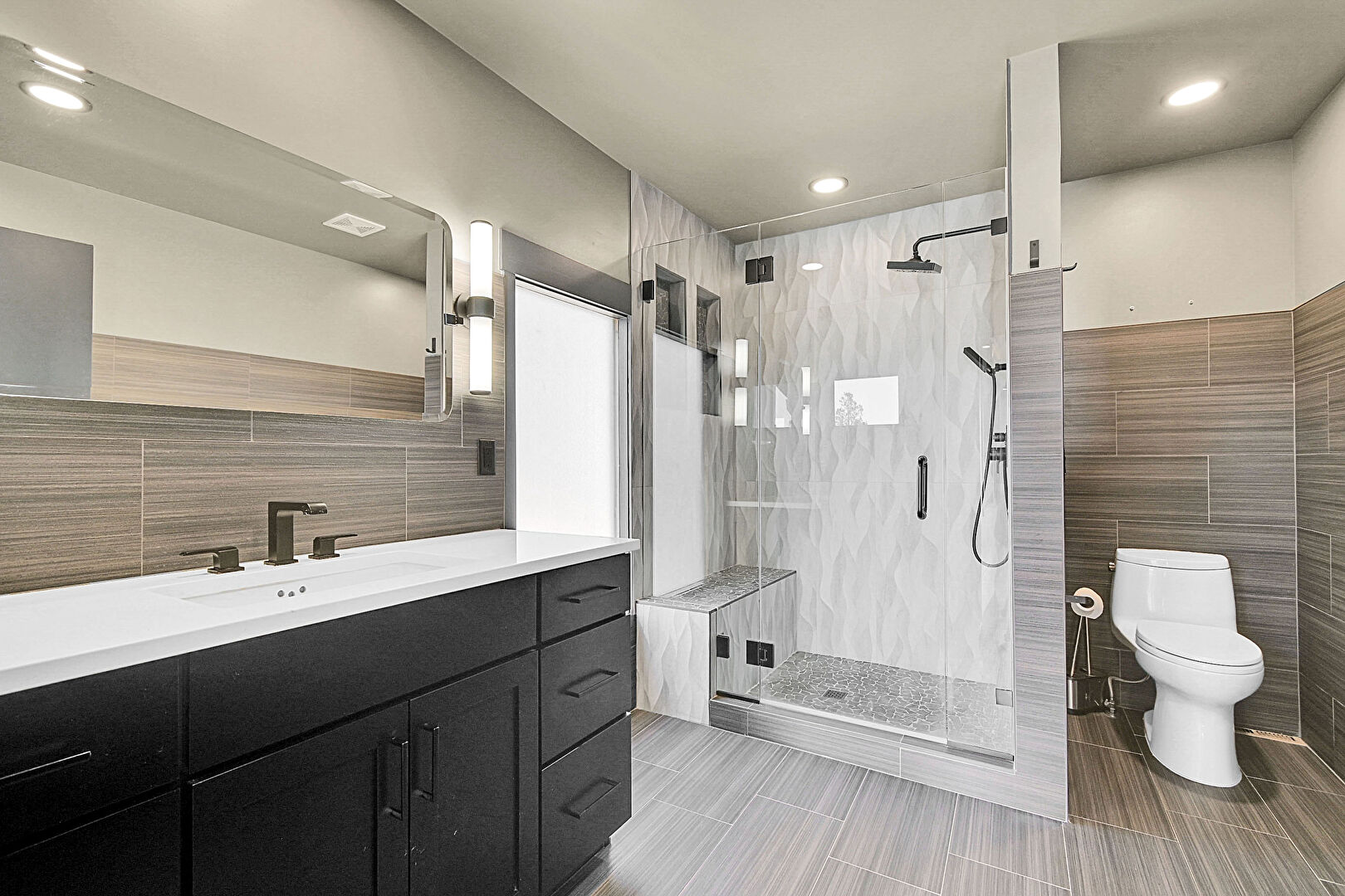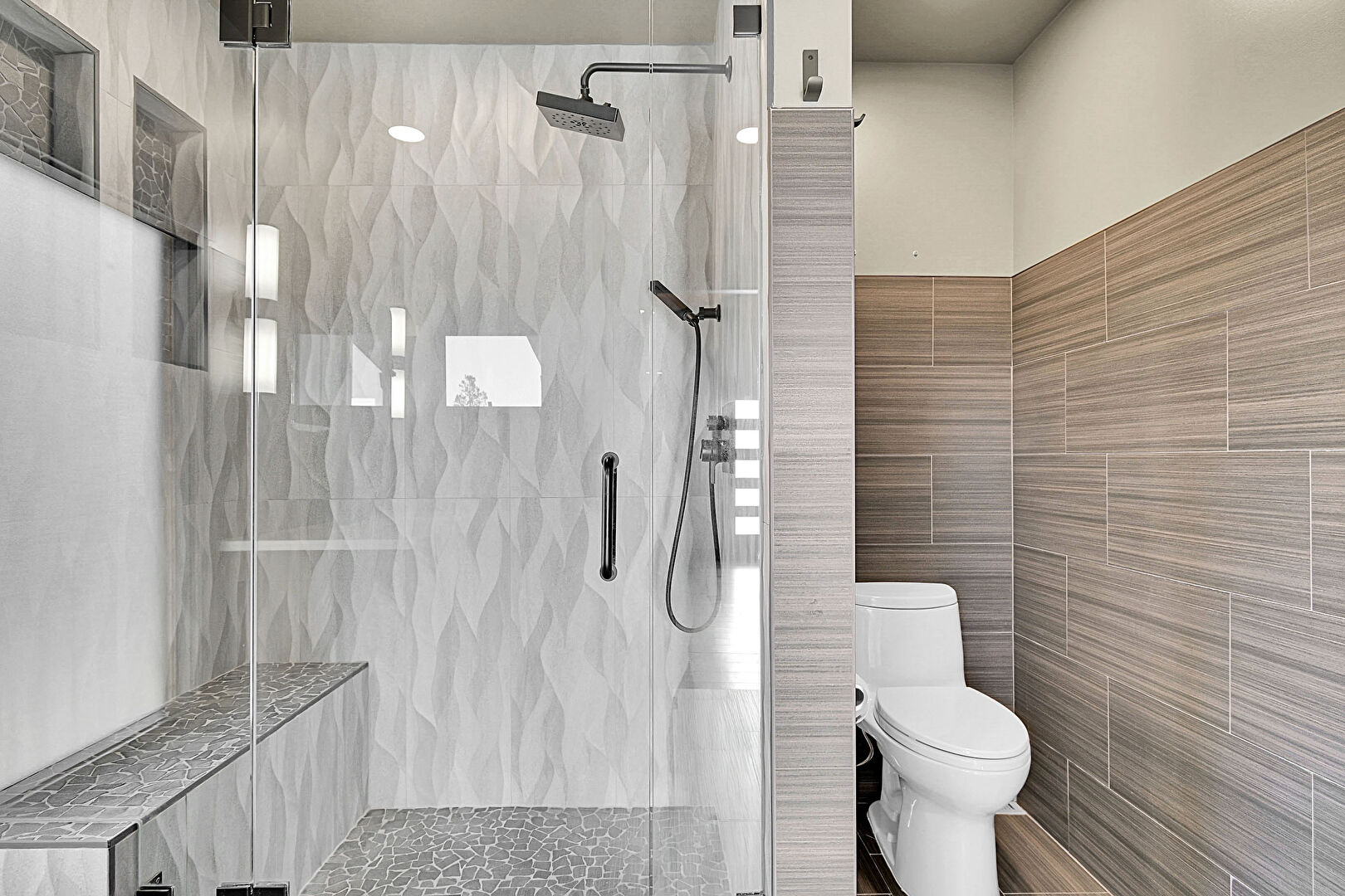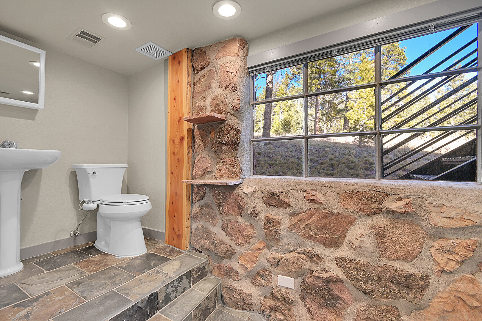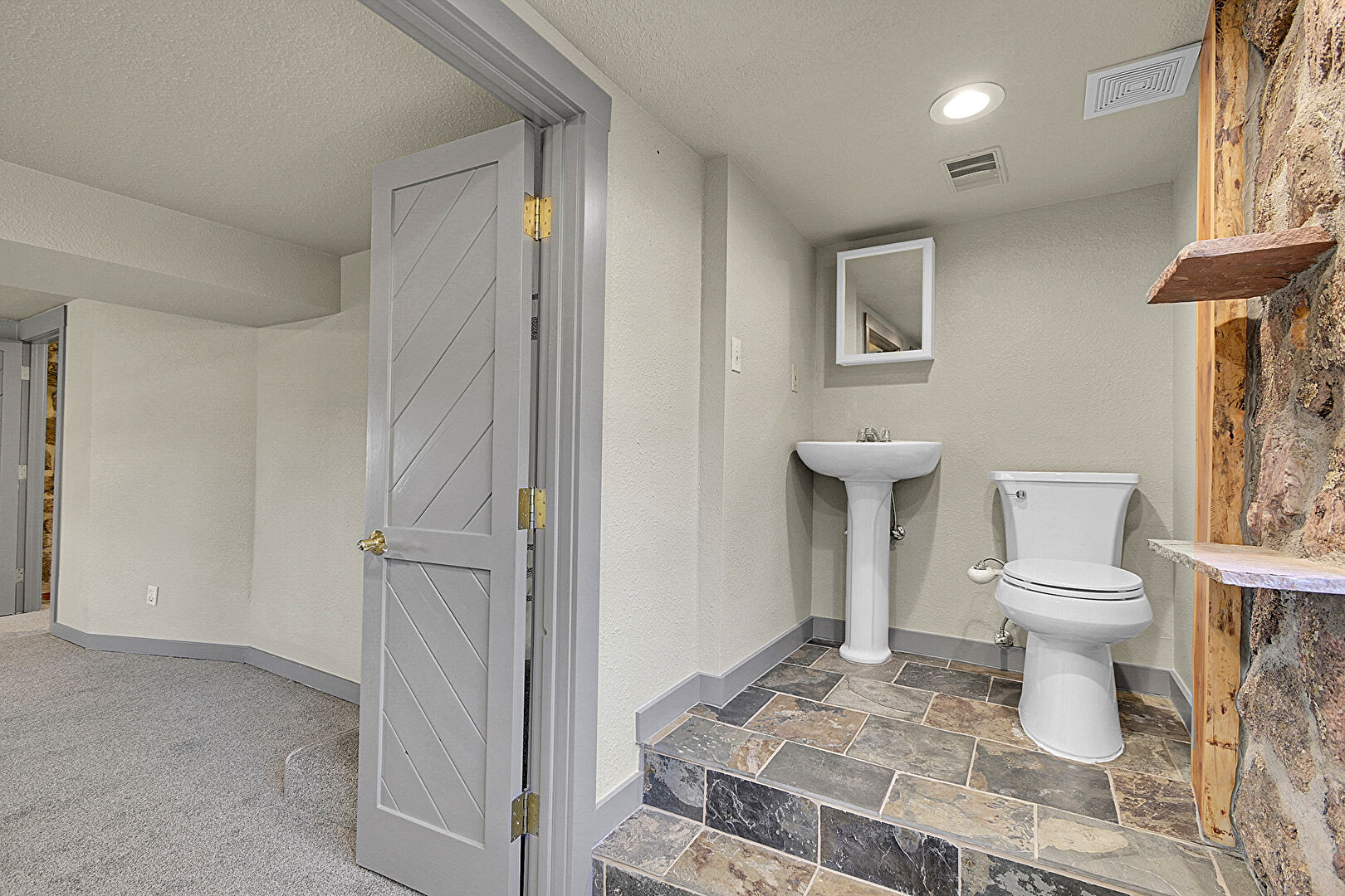 Baseboards Wall, Carpet, Drywall, Full Bathroom, Half Bathroom, Natural Light, Recessed Lighting, Stone Finish Floor, Textured Ceiling, Tile Floor, Tile Wall, Vanity, Vaulted Ceiling, Vent, Wainscot Wall, Wood Ceiling, Wood Finish Floor, Baseboards Wall, Full Bathroom, Natural Light, Recessed Lighting