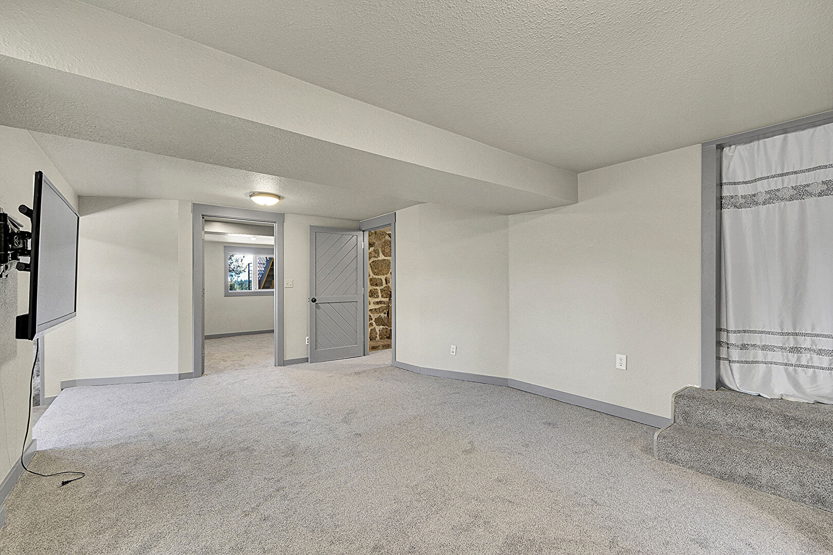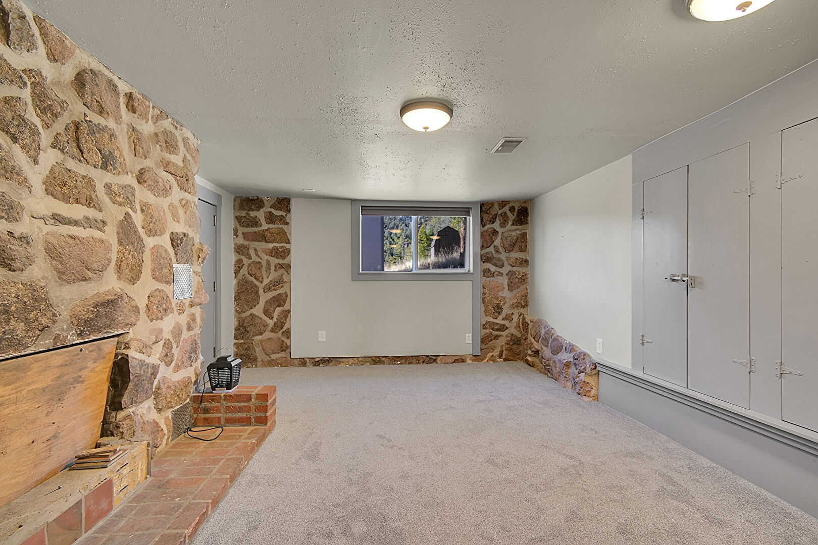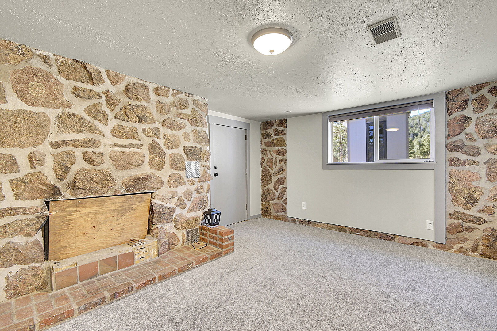 Baseboards Wall, Basement, Carpet, Drywall, Fireplace, Natural Light, Smoke Carbon Monoxide Detector, Stairs, Stone Wall, Textured Ceiling, Vent, Basement, Textured Ceiling